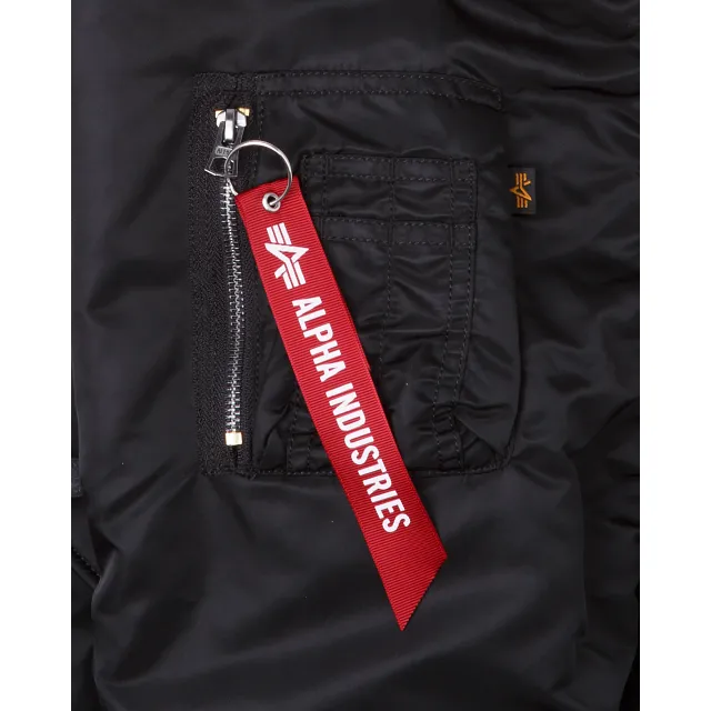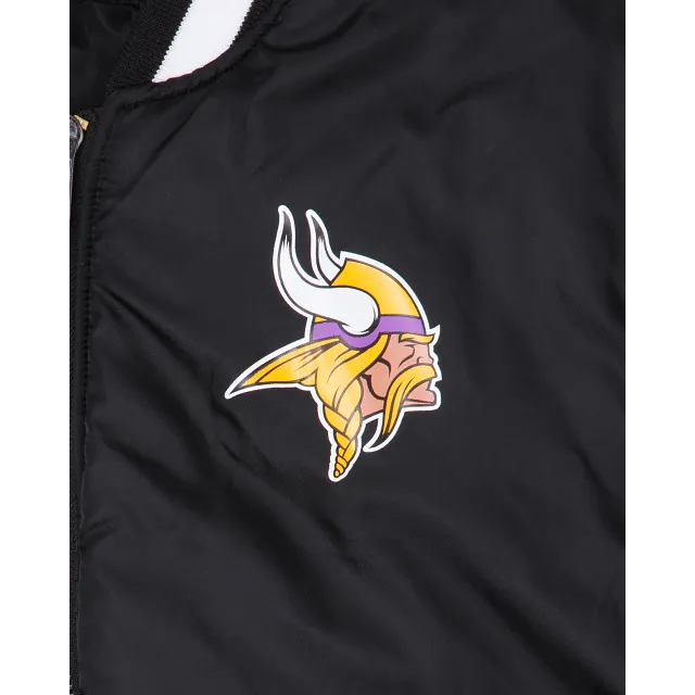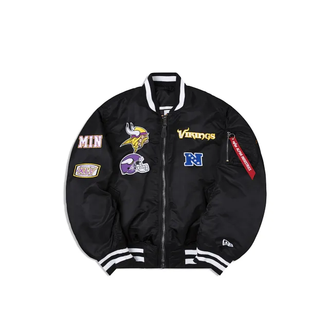 The Alpha Industries X Minnesota Vikings MA-1 Bomber Jacket features embroidered Vikings patches throughout the chest and sleeves with an embroidered applique team wordmark at the rear. Additional details include a utility pocket with the Alpha Industries ribbon at the left sleeve. The reversible jacket features a black interior with a screen-printed team logo at the left chest and a multi-lingual message at the rear.