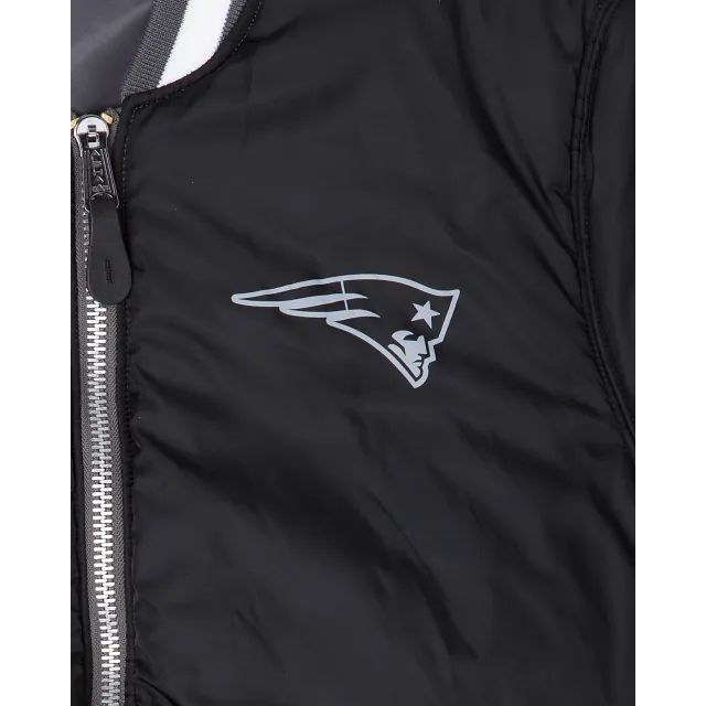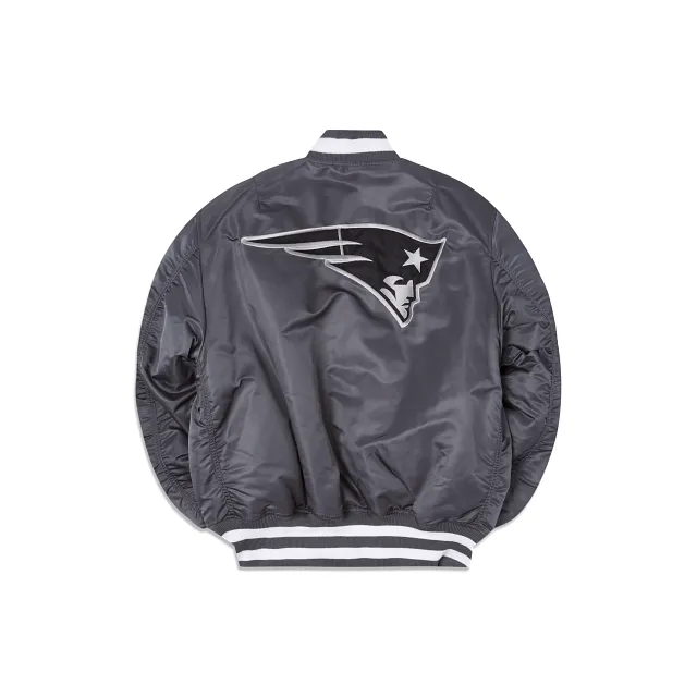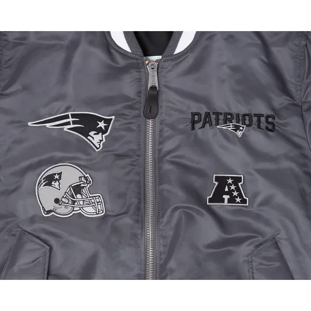 The Alpha Industries X New England Patriots Gray MA-1 Bomber Jacket features embroidered Patriots patches throughout the chest and sleeves with an embroidered applique team wordmark at the rear. Additional details include a utility pocket with the Alpha Industries ribbon at the left sleeve. The reversible jacket features a black interior with a screen-printed team logo at the left chest and a multi-lingual message at the rear.