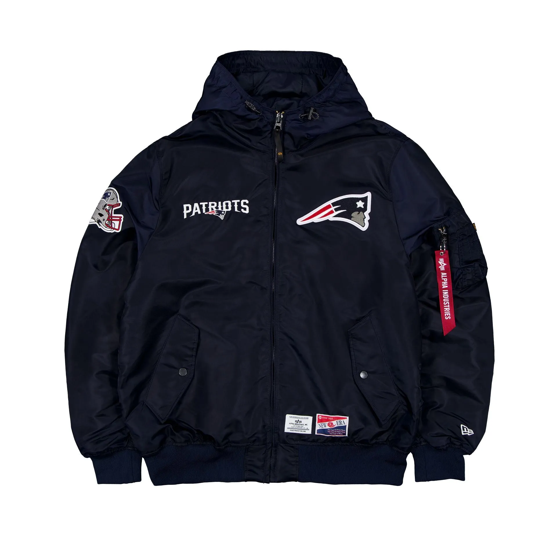 The Alpha Industries x New England Patriots L-2B Hooded Bomber Jacket features an embroidered Patriots wordmark at right chest with a team patch at the sleeve. Additional details include a felt applique team logo at the left chest and a utility pocket with the Alpha Industries ribbon at the left sleeve.