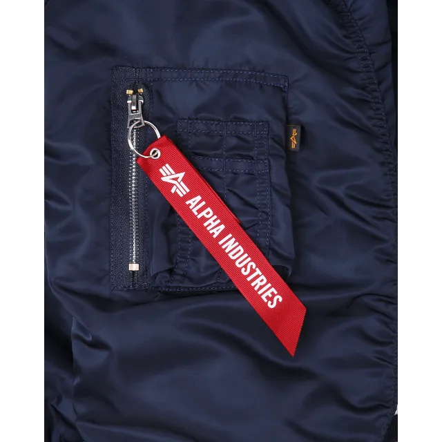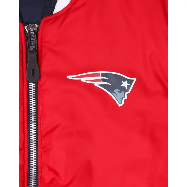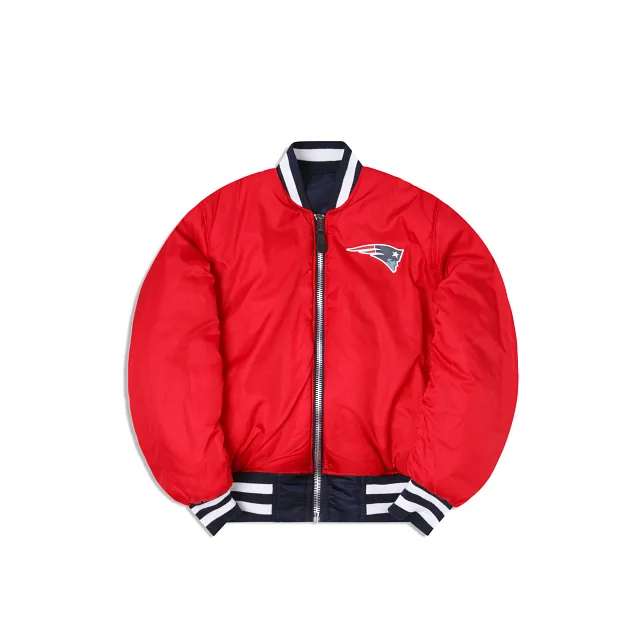 The Alpha Industries X New England Patriots MA-1 Bomber Jacket features embroidered Patriots patches throughout the chest and sleeves with an embroidered applique team wordmark at the rear. Additional details include a utility pocket with the Alpha Industries ribbon at the left sleeve. The reversible jacket features a black interior with a screen-printed team logo at the left chest and a multi-lingual message at the rear.