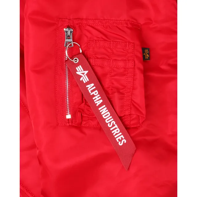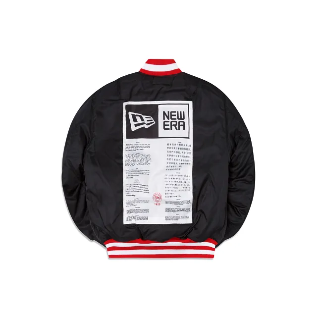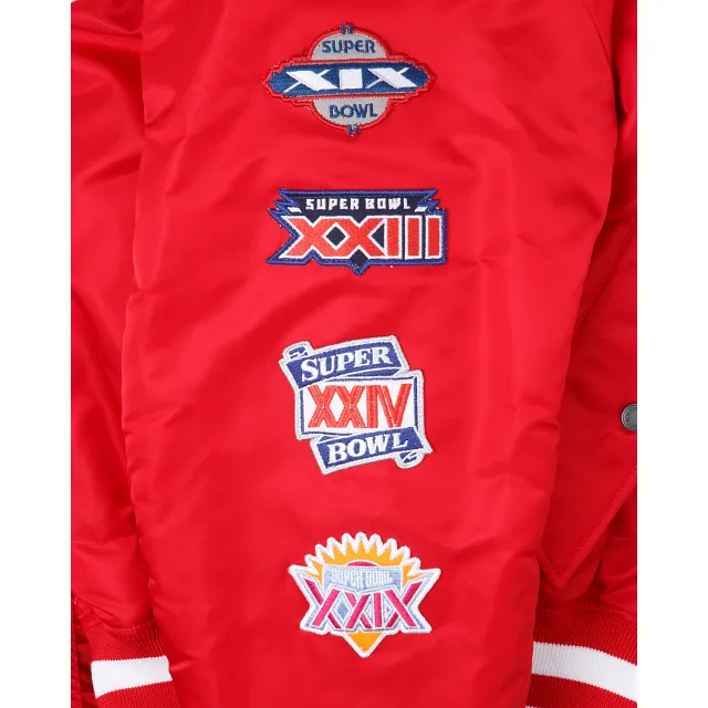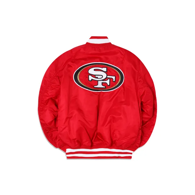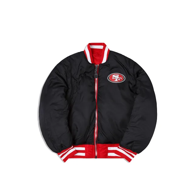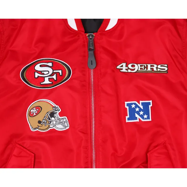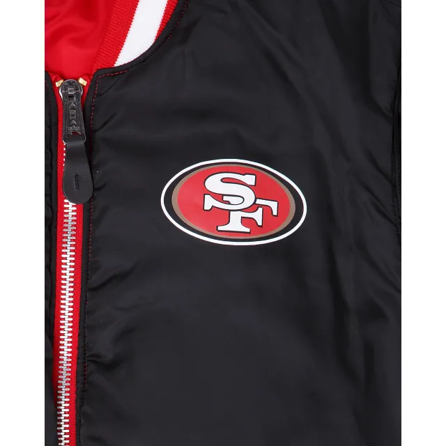 The Alpha Industries X San Francisco 49ers MA-1 Bomber Jacket features embroidered 49ers patches throughout the chest and sleeves with an embroidered applique team wordmark at the rear. Additional details include a utility pocket with the Alpha Industries ribbon at the left sleeve. The reversible jacket features a black interior with a screen-printed team logo at the left chest and a multi-lingual message at the rear.