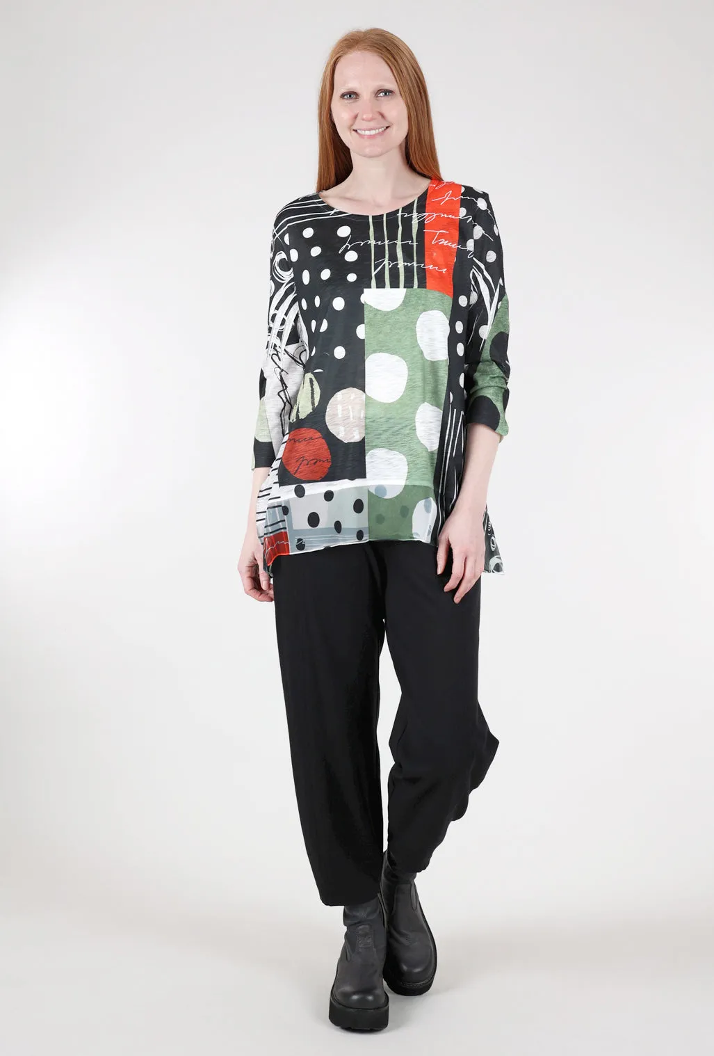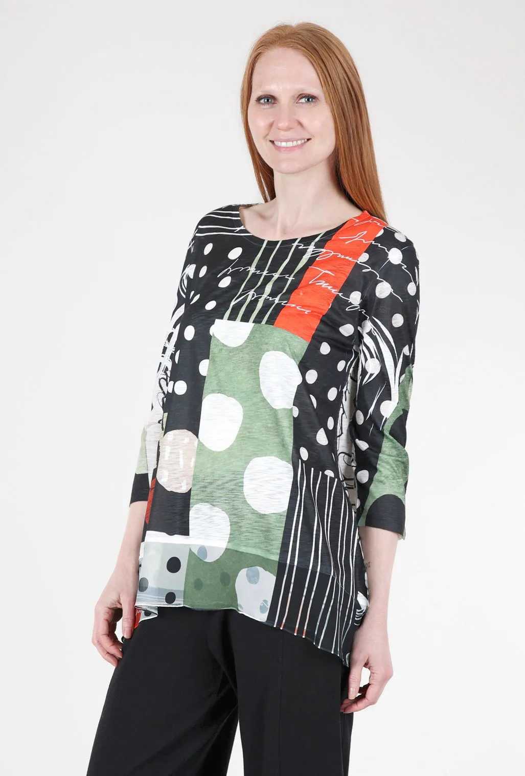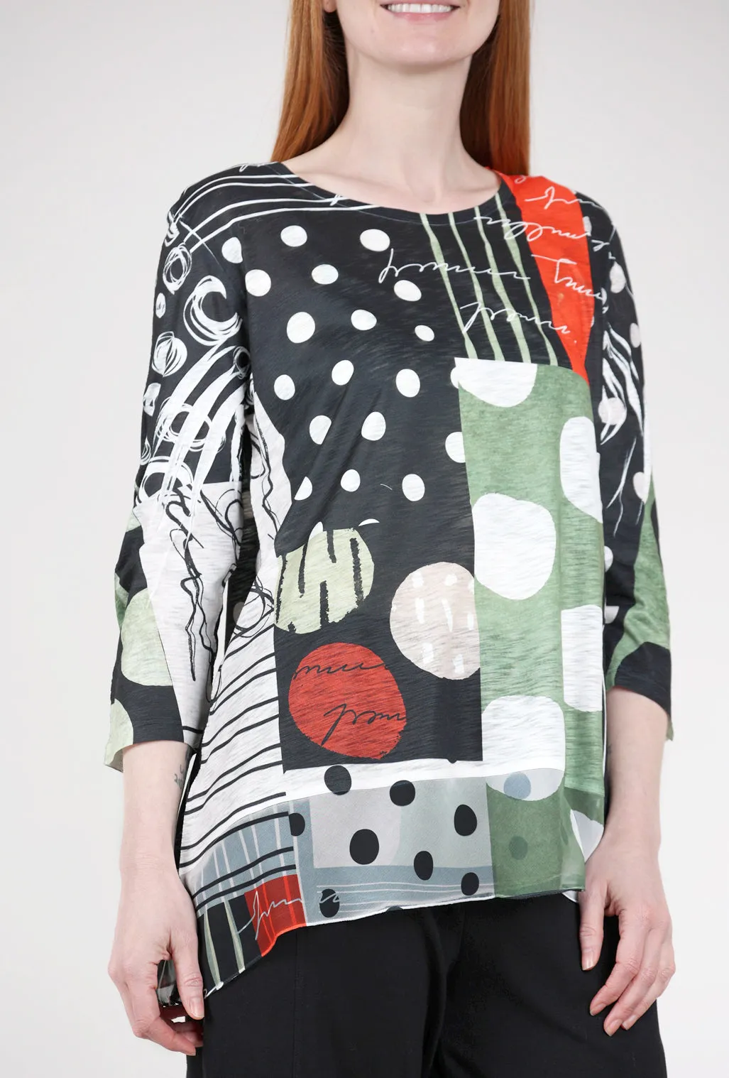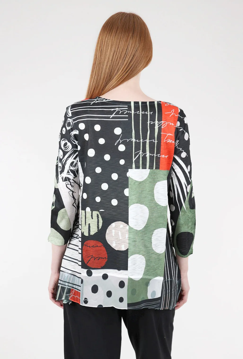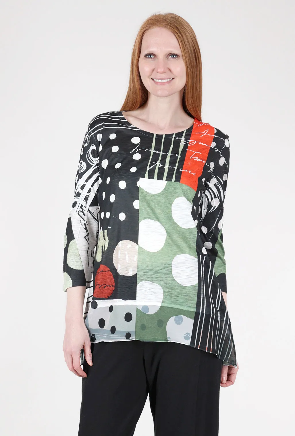 Done in a lightweight poly knit blend, this eye-catching top has a rounded neckline, three-quarter-length sleeves and an A-line silhouette. A contrast trim in a semi-sheer chiffon dresses up the look.