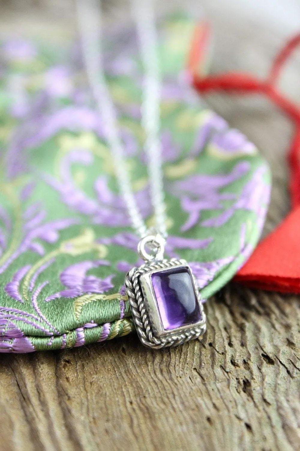 New and exclusive DharmaShop necklace gift set includes a rectangular sterling silver and Amethyst charm, hand strung on an 18 inch silver flat chain. This beautiful and dainty charm necklace comes inside of a small, handmade, 100% cotton mala bag decorated with intricate leaf designs. Necklace wears well with both casual or formal outfits, and is perfect for the upcoming gift giving season!