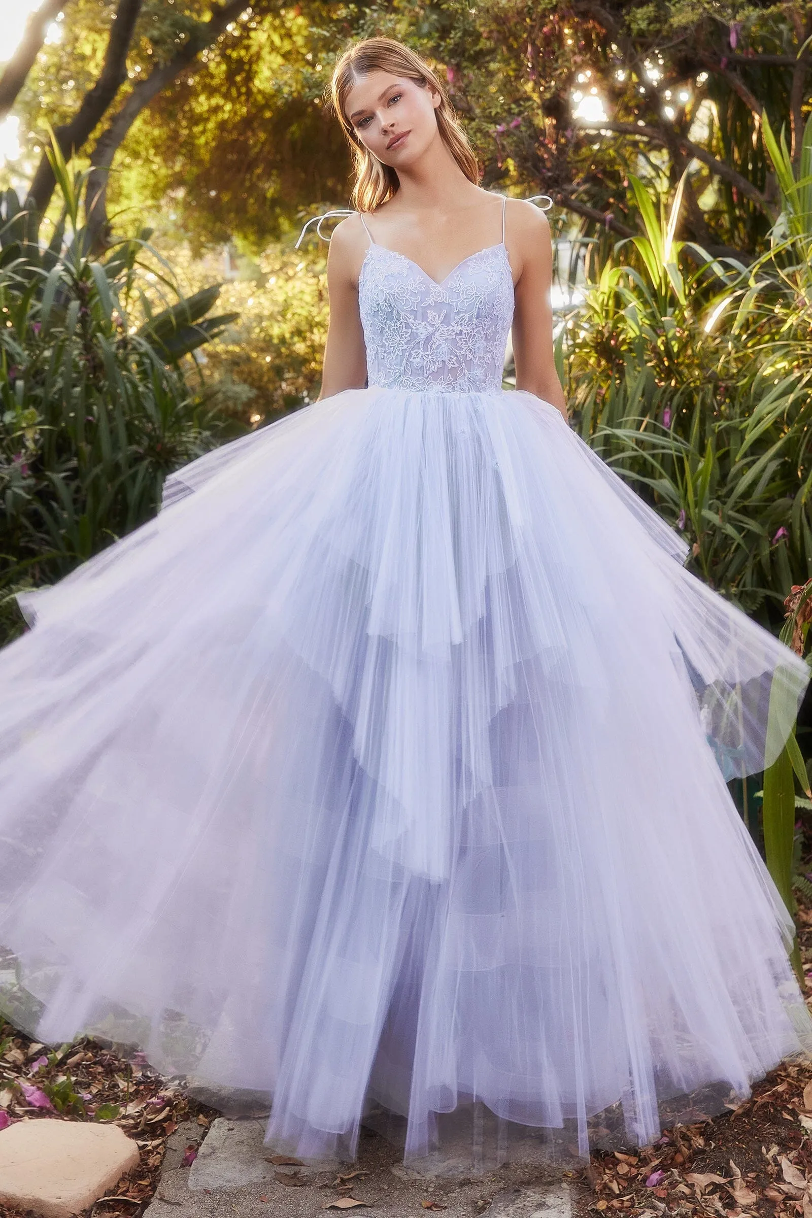 You'll love twirling around in this beaded applique long sleeveless dress with A-line plisse ruffled skirt by Andrea & Leo A1152.