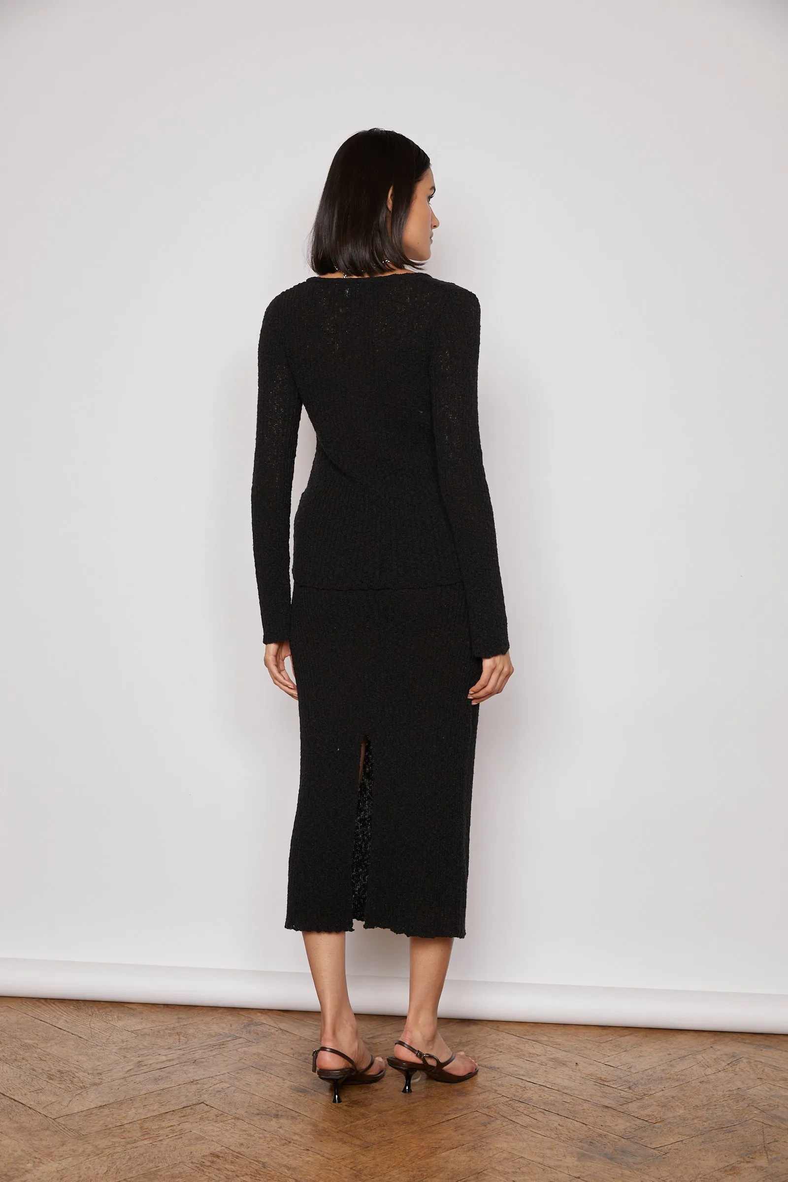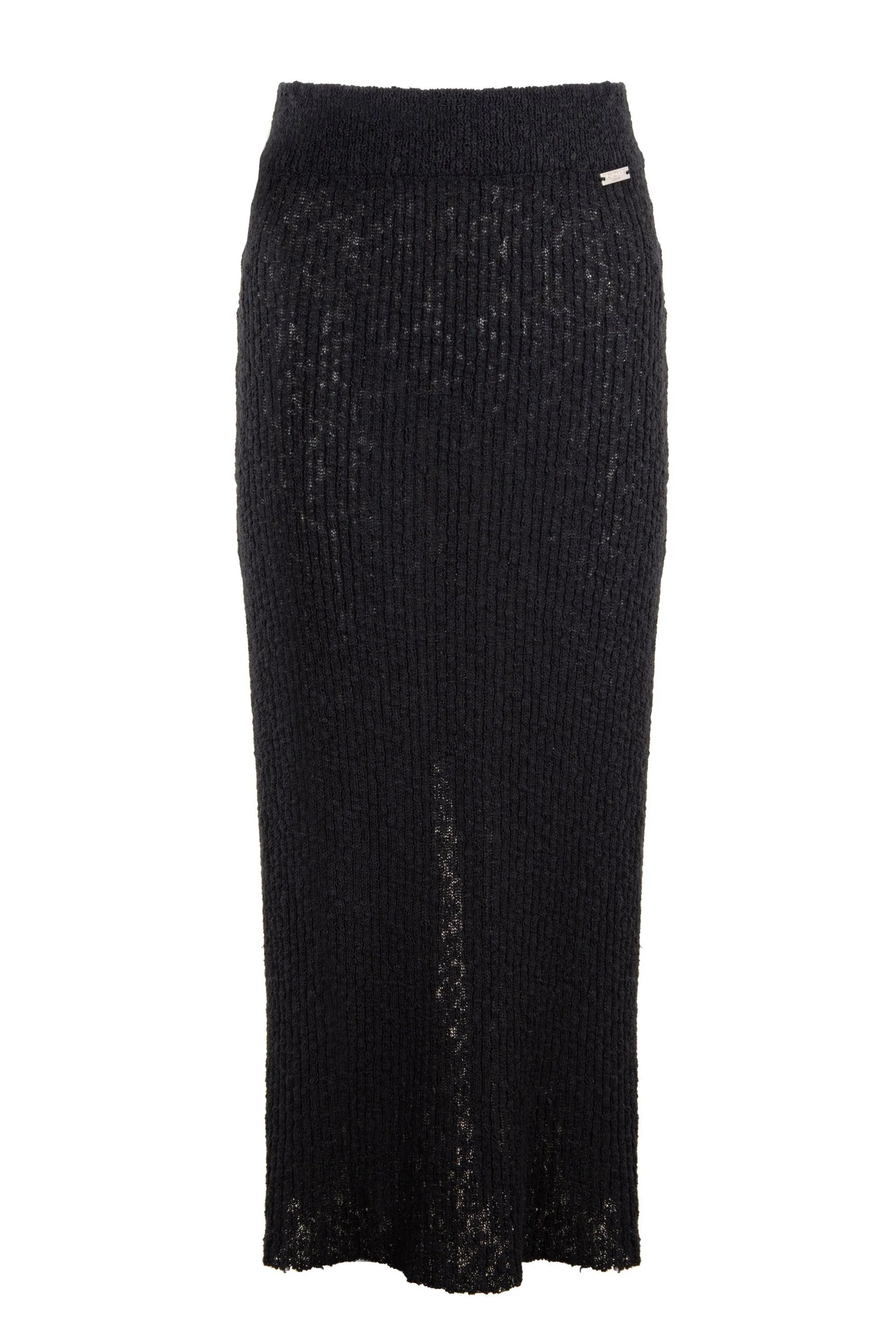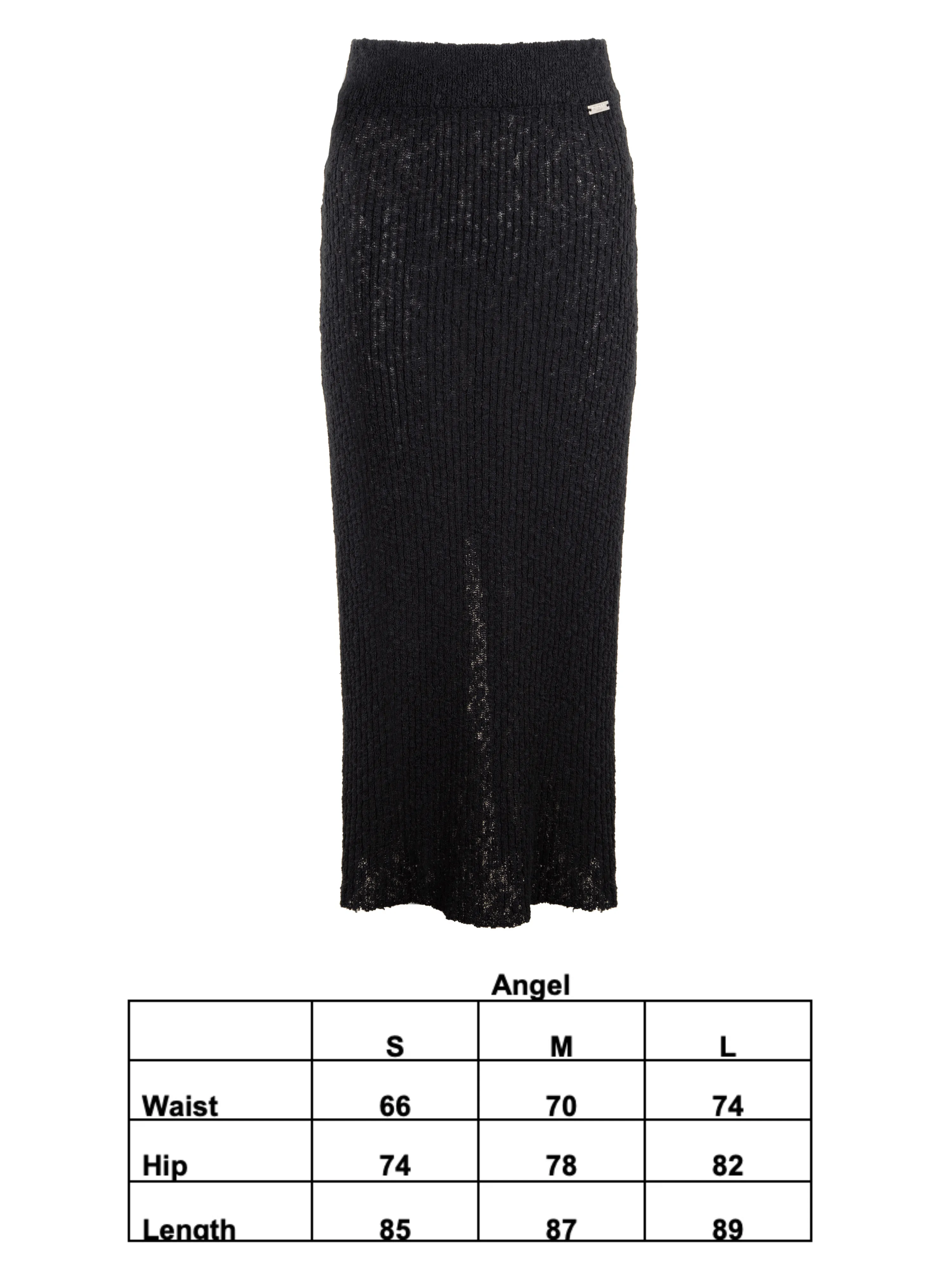 The ANGEL SKIRT BLACK is a must-have for any wardrobe. Made with high-quality knit fabric, this skirt offers a comfortable and stylish fit. Featuring a below knee length and a sleek slit at the back, it effortlessly combines fashion and function. Elevate your style game with this versatile piece.