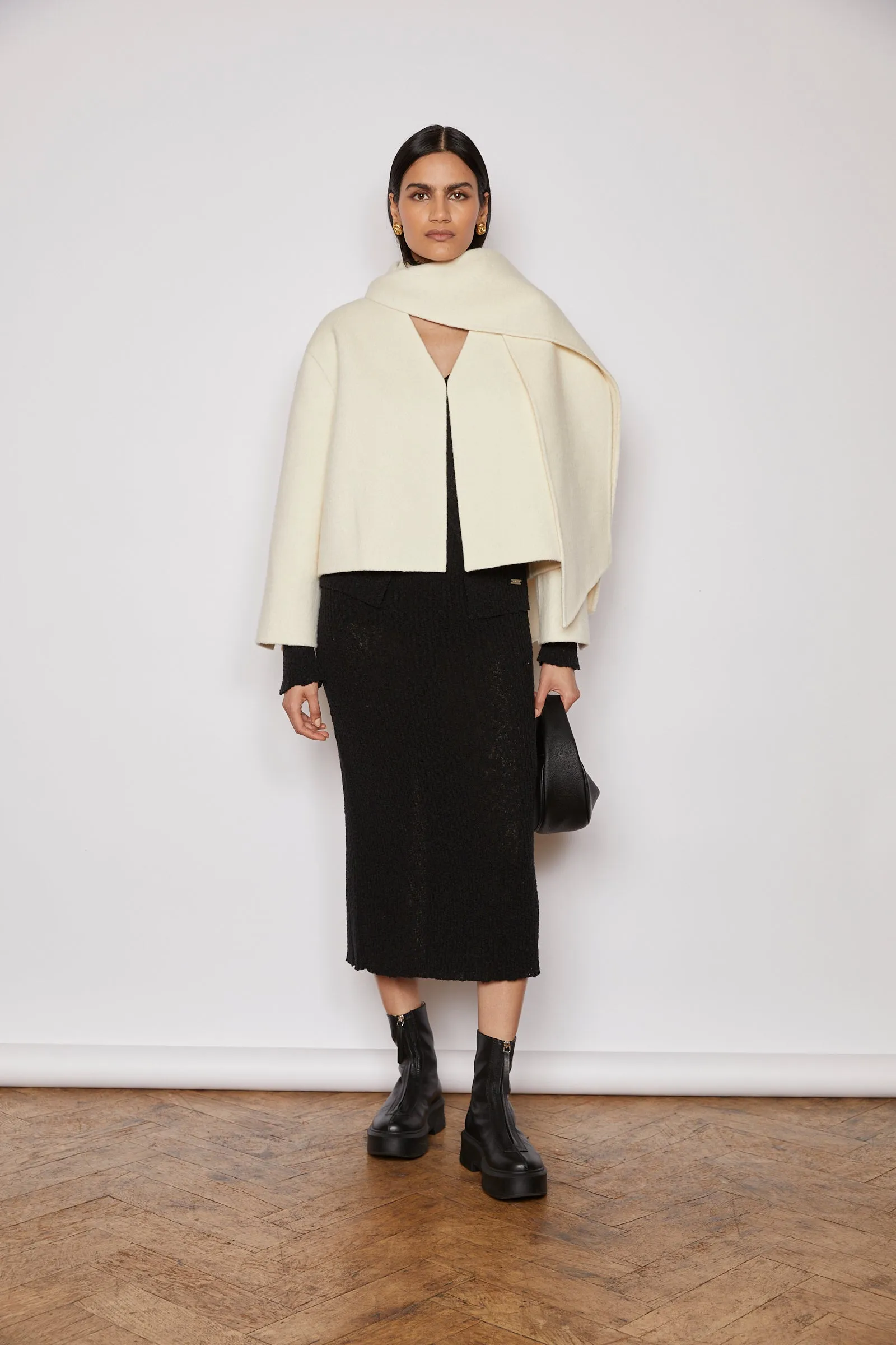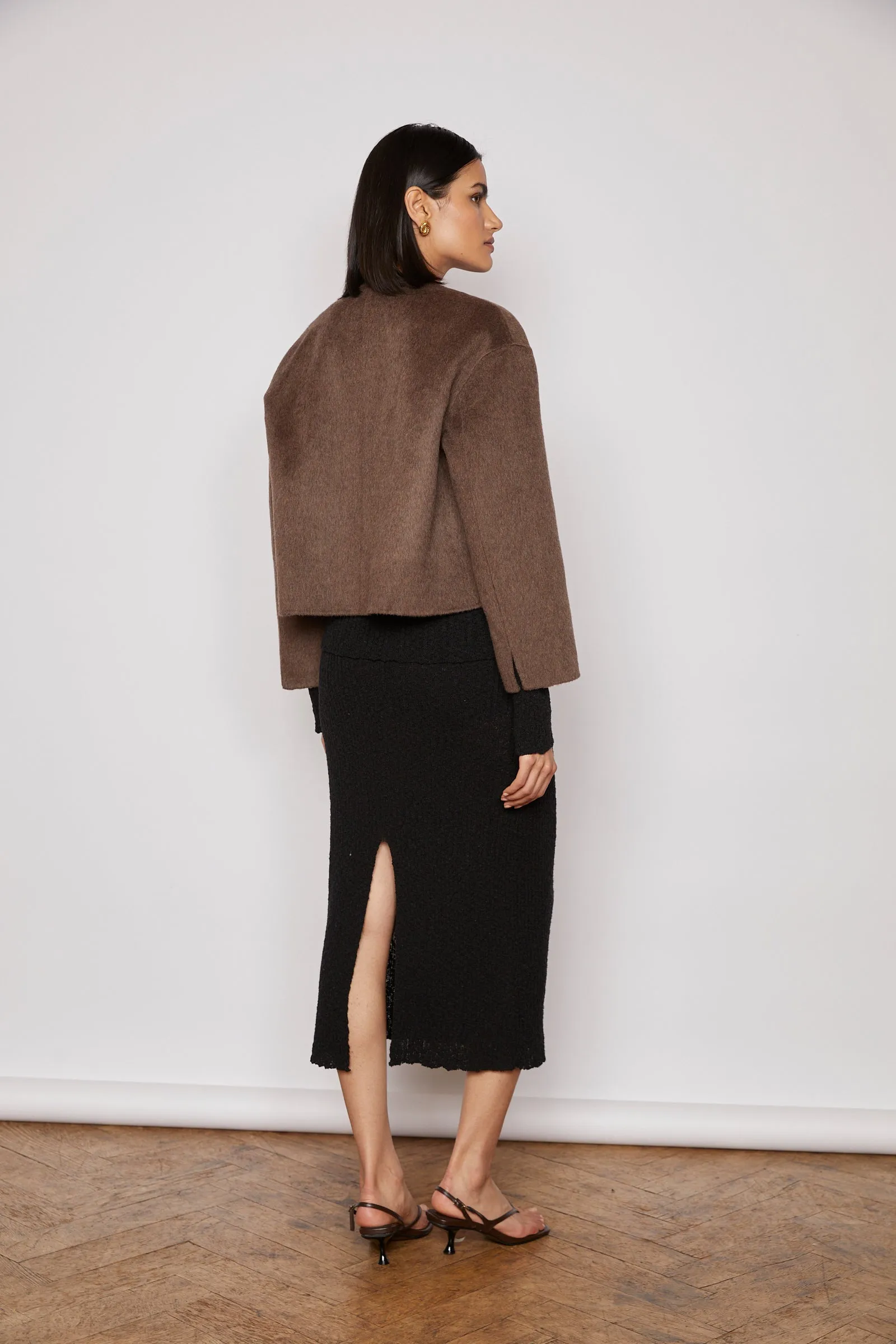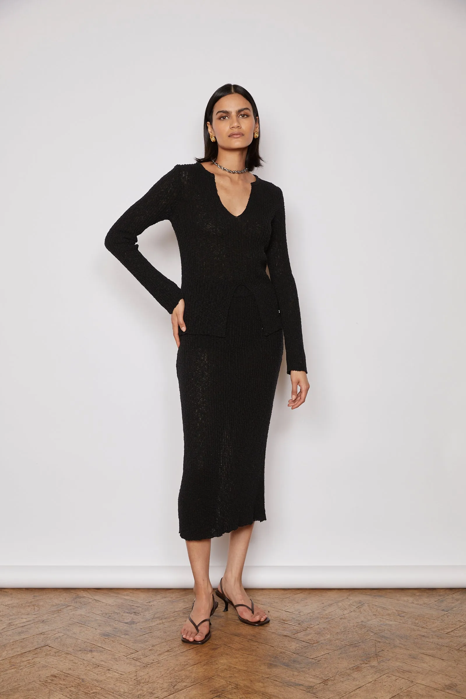 The ANGEL SKIRT BLACK is a must-have for any wardrobe. Made with high-quality knit fabric, this skirt offers a comfortable and stylish fit. Featuring a below knee length and a sleek slit at the back, it effortlessly combines fashion and function. Elevate your style game with this versatile piece.