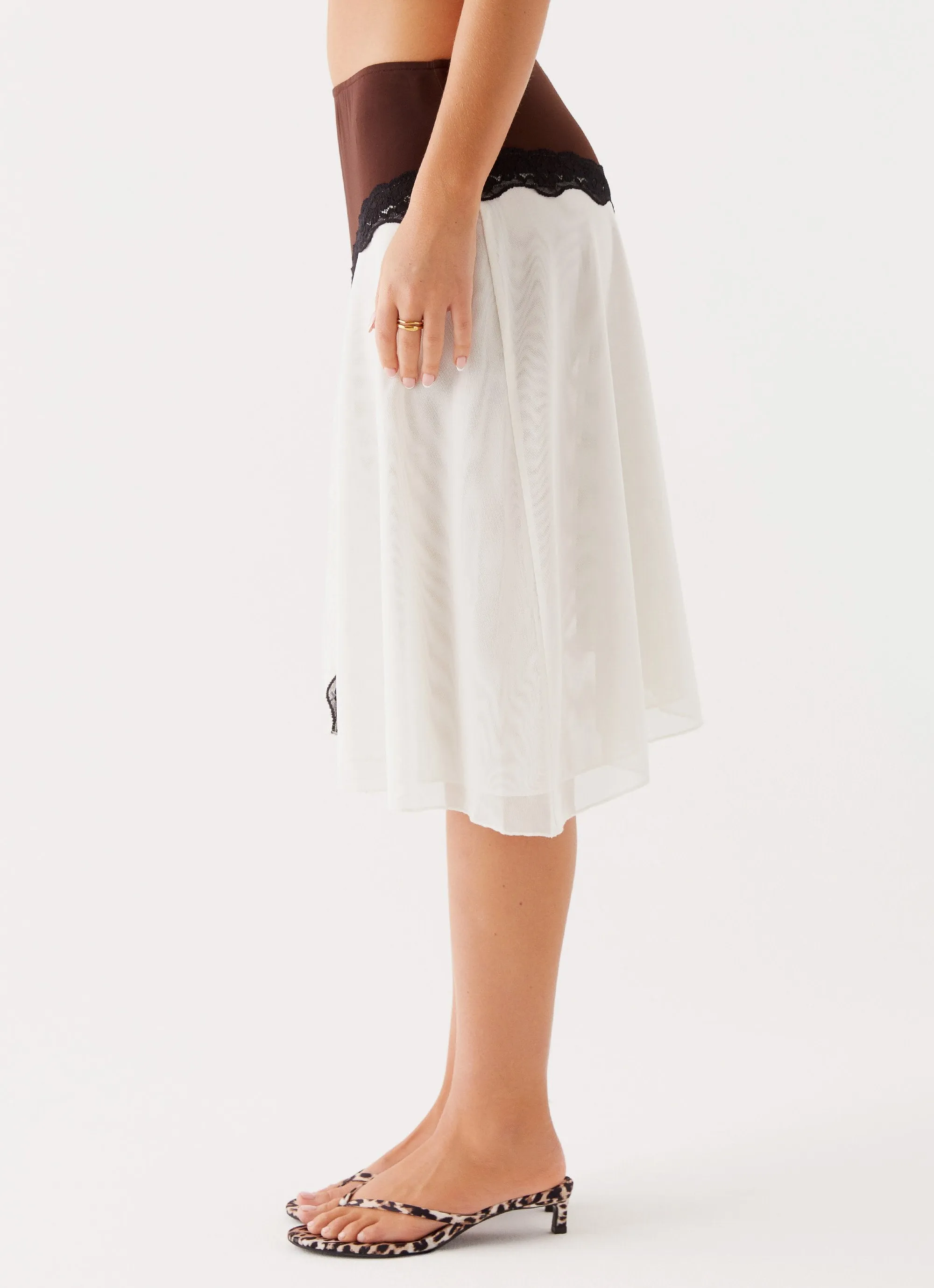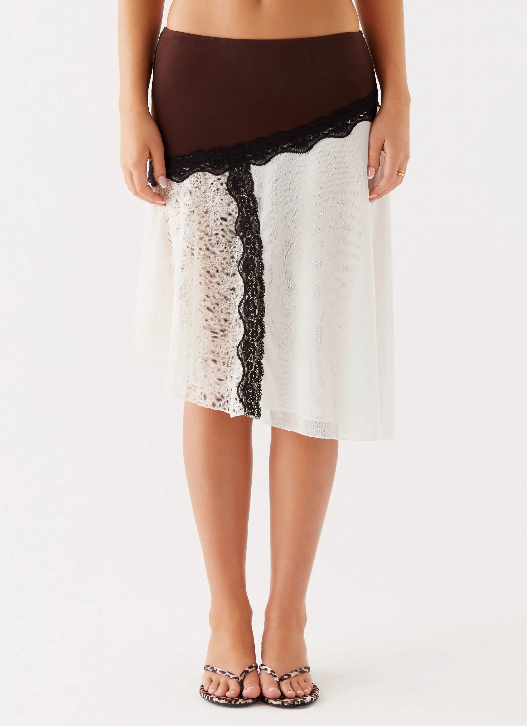 The Apology Midi Skirt features delicate lace trims, a semi-sheer finish, and an asymmetrical hem. Its elegant design adds a touch of sophistication and playfulness to any ensemble.