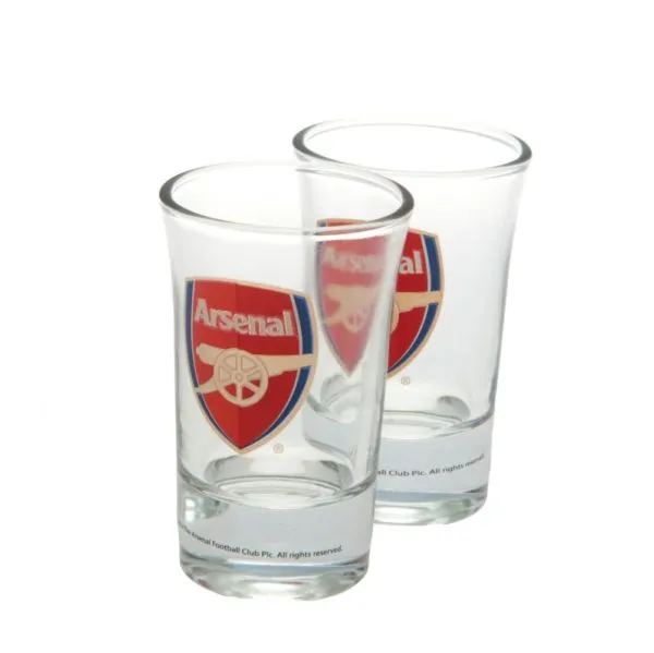 | Set of 2 shot glasses Featuring full colour Arsenal FC club crest Official licensed product Approx 50ml (2oz) Approx 7cm tall, 4cm in diameter Product weight 208g In a display packet |