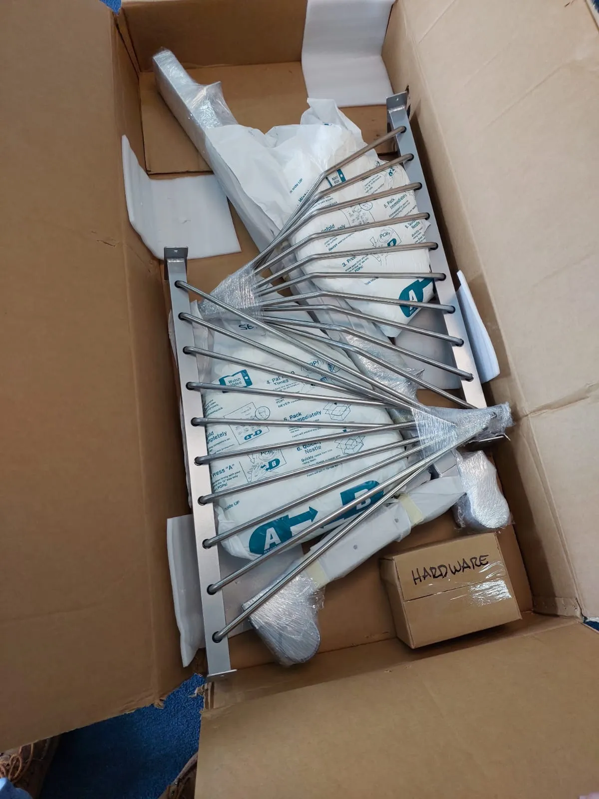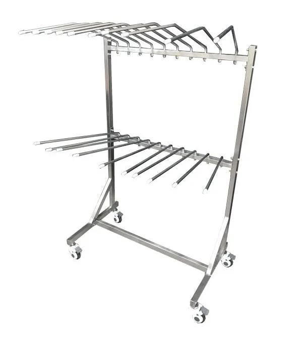The two-tier mobile valet rack is specially designed to store two-piece (vest and skirt) aprons but is capable of storing most garment types. Specialty rotating arms allow for angular versatility and compact storage. Industrial quality USA steel construction, medical-grade casters, and Florida fabricators make these mobile apron racks an excellent portable storage option. Some assembly required.