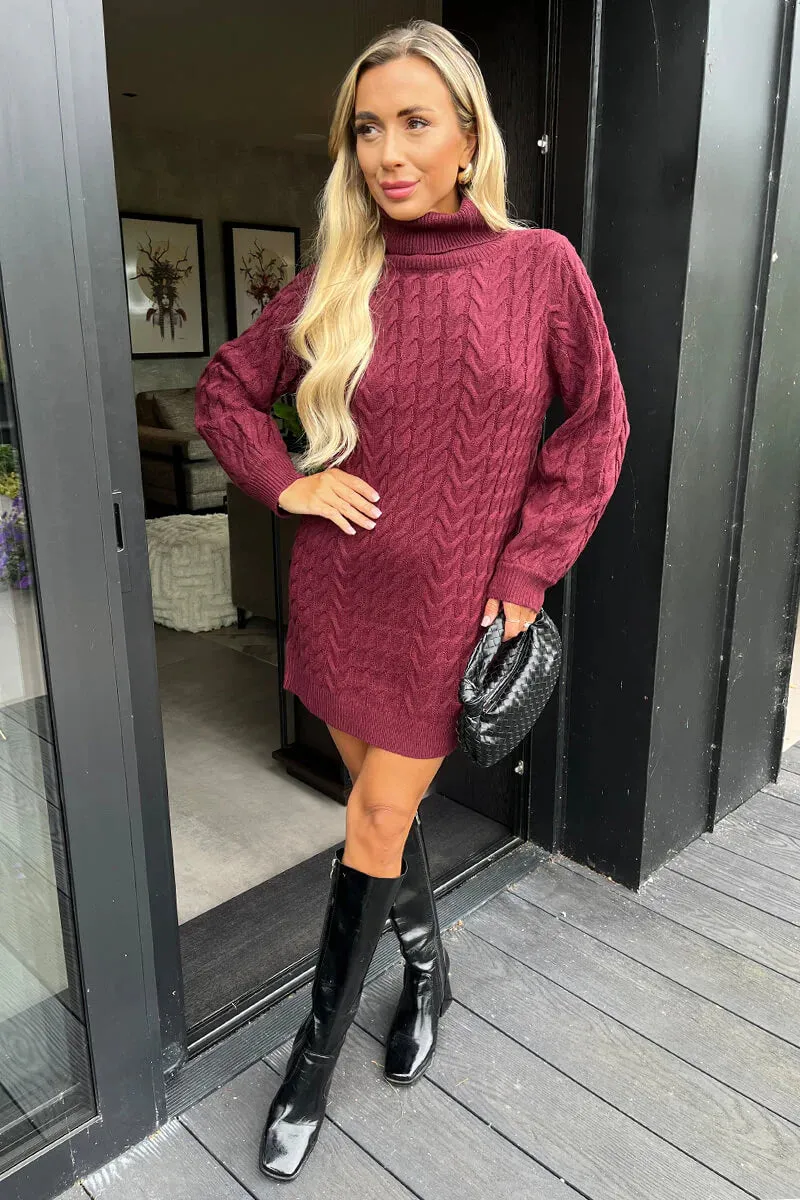 Look great in our Wine Roll Neck Cable Knit Dress the perfect edition to your winter wardrobe. Featuring a roll neck, long sleeves and cable knit pattern. Style with your favorite boots and a long coat for the perfect christmas markets look or cute day date.