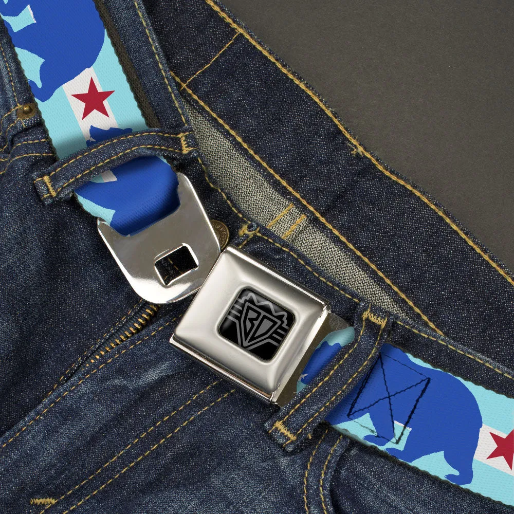 BD Wings Logo CLOSE-UP Black/Silver Seatbelt Belt - Cali Bear/Star Silhouette Baby Blue/White/Cobalt/Red Webbing