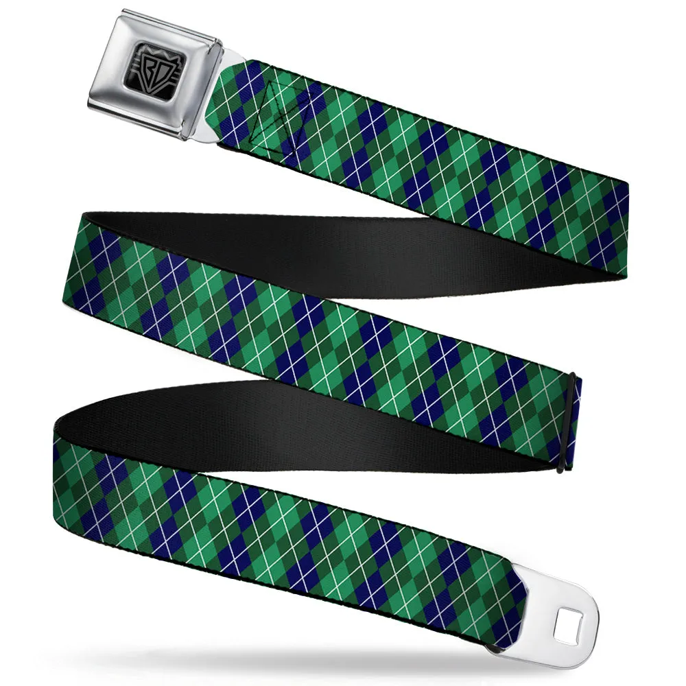 BD Wings Logo CLOSE-UP Full Color Black Silver Seatbelt Belt - Argyle Green/Navy/Green/White Webbing