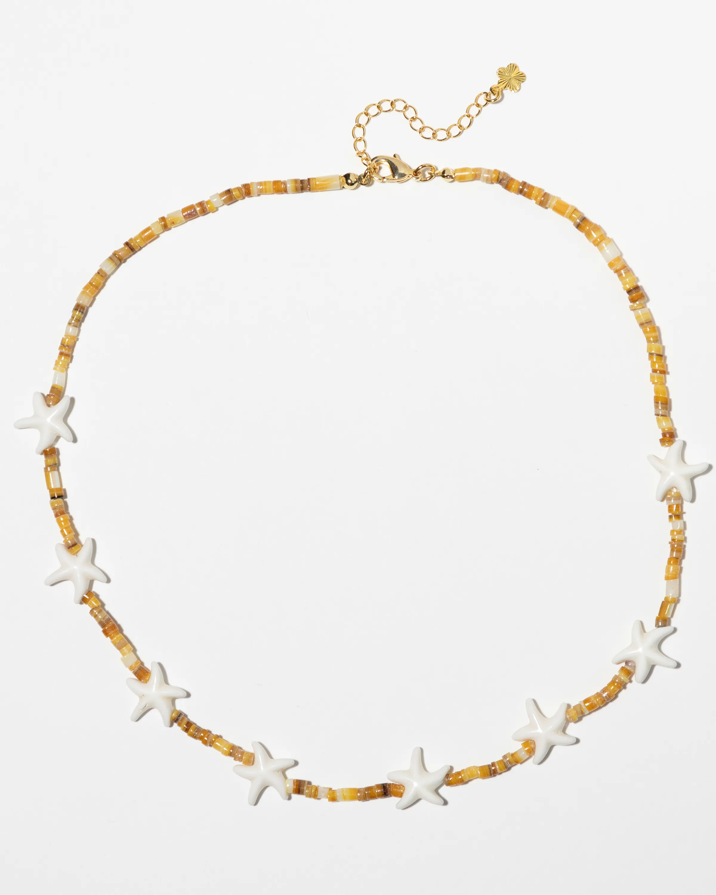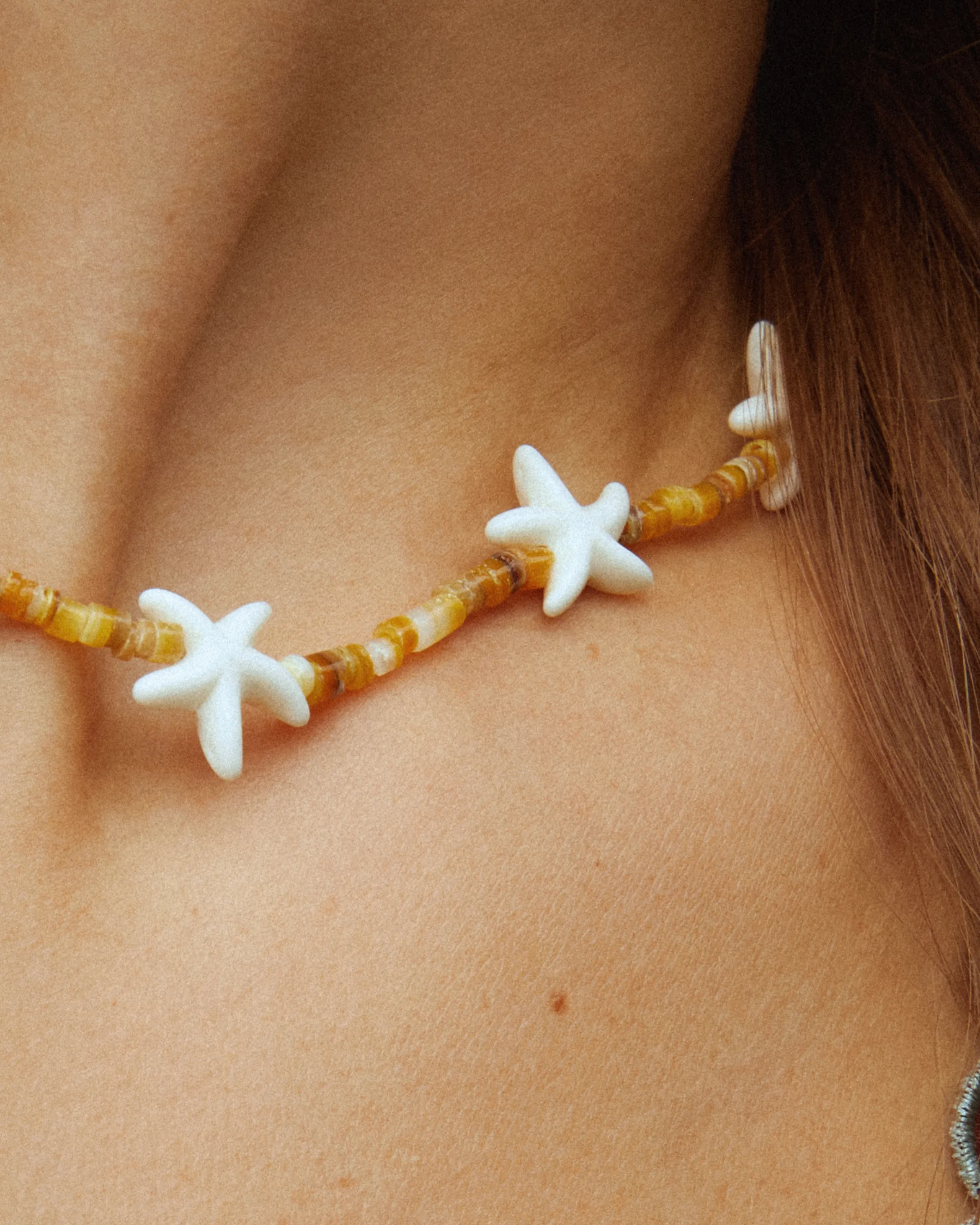This Beaded Starfish Necklace is the perfect accessory for a summery and cool look. Its white starfish and natural brown beads give it an easy, bohemian feel, while the adjustable length ensures a comfortable fit for anyone.