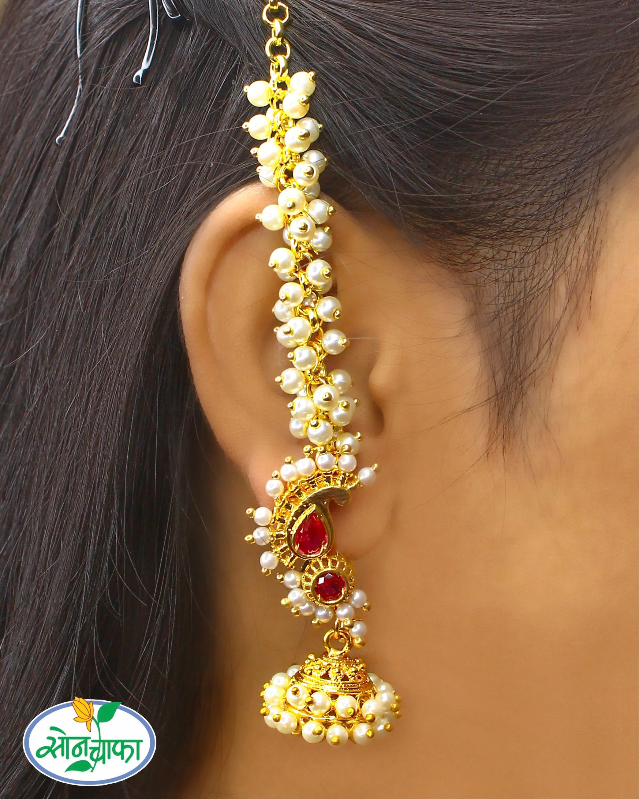 Sonchafa Jewellery brings to you this pair of stylish star designer ear-cuffs. They are studded with pink, green stones and made from golden finish metal. These earcuffs are superior in quality and decorated with pearls for added attraction.