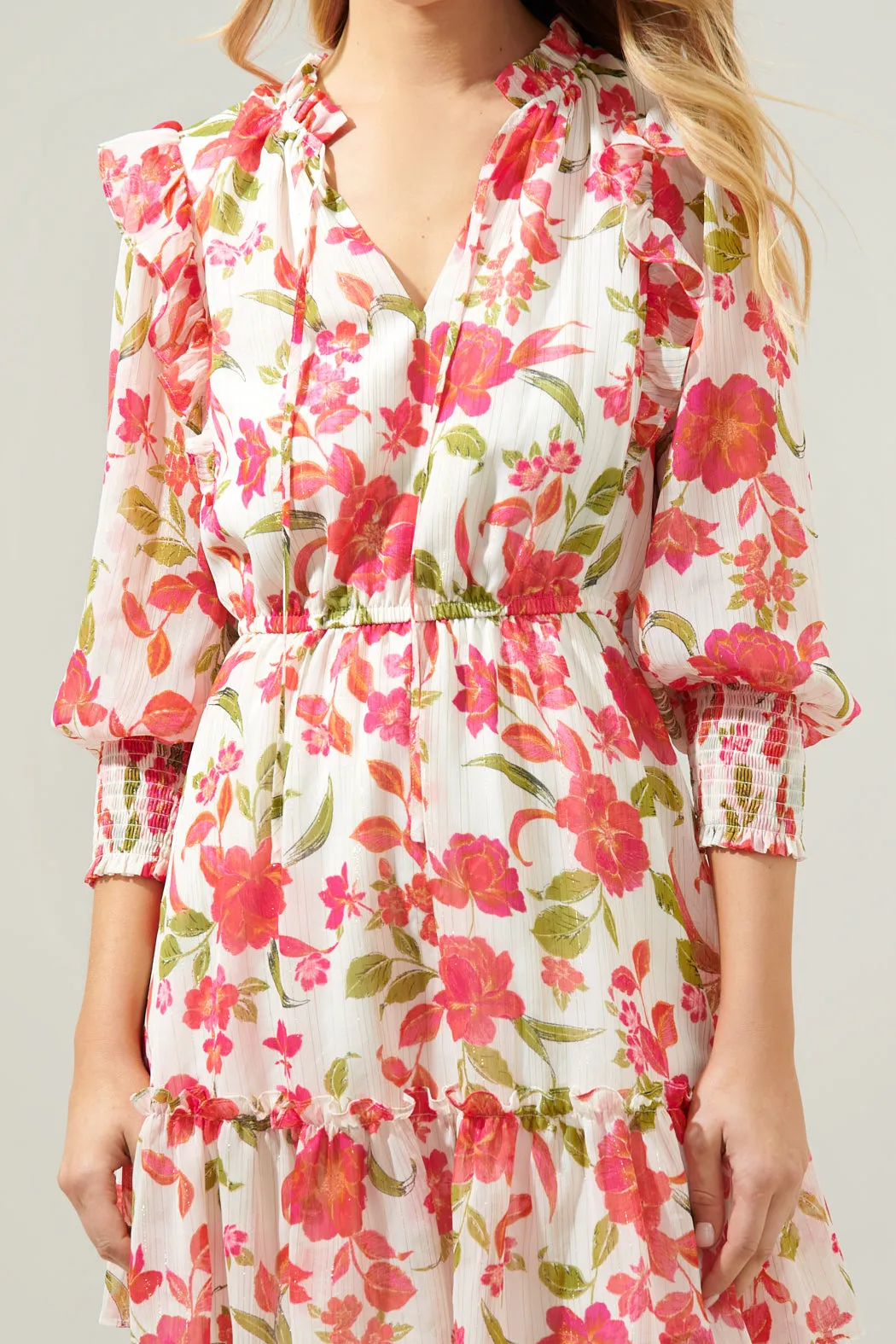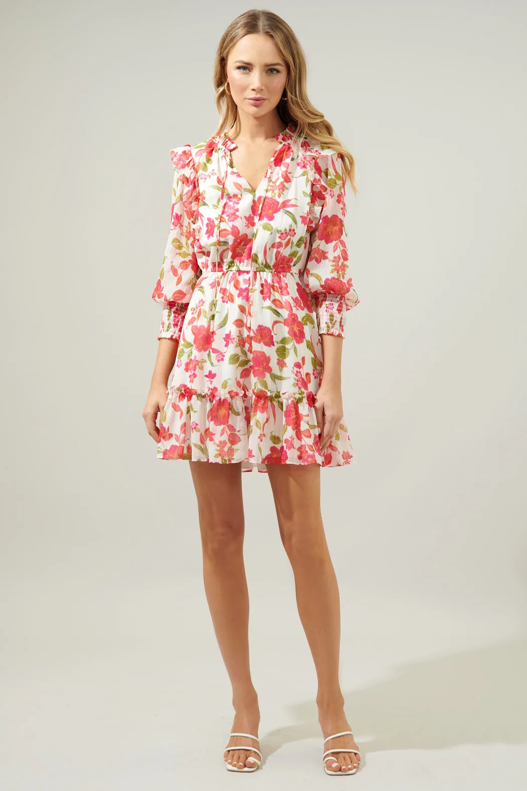 Tropical dreams come true in this sweet, floral dress. Pink flowers sit against a lurex striped white-ground to create the Belle Anse print. It decorates the Idra Dress that features a ruffle split neckline, framed by balloon half sleeve with smocked cuffs. Ruffles throughout the dress add a feminine touch. An elastic waist tops a flouncy hem mini skirt.