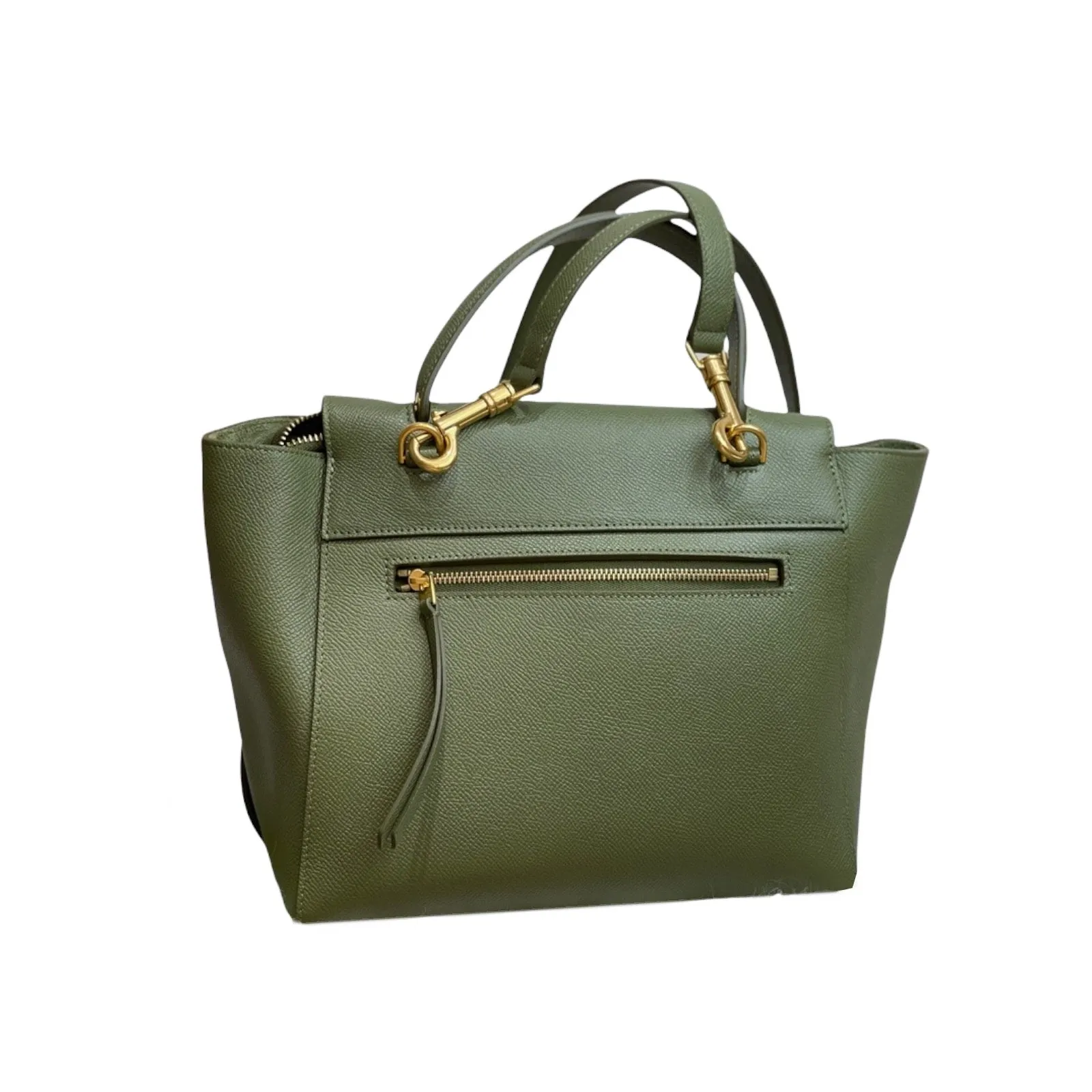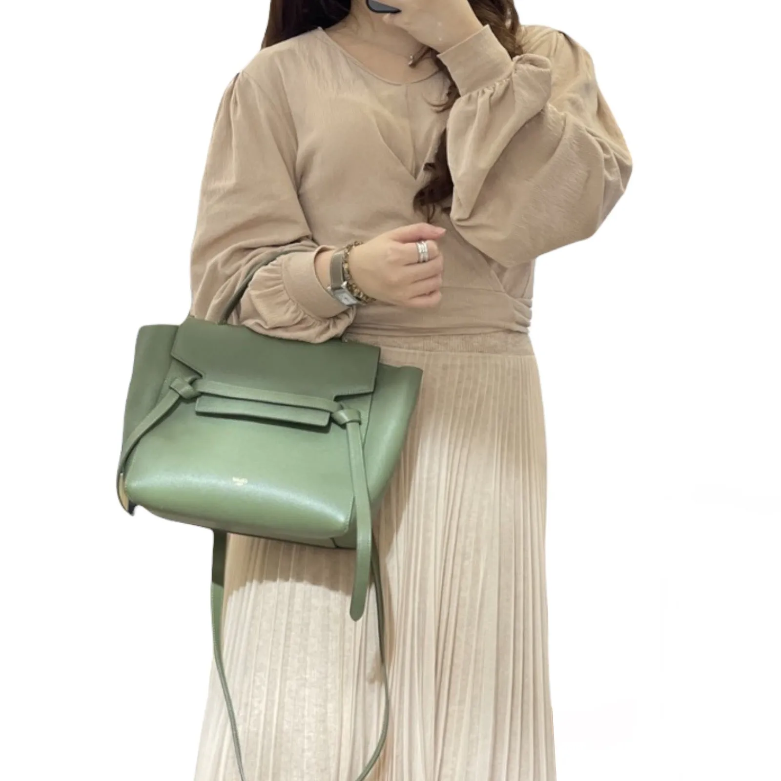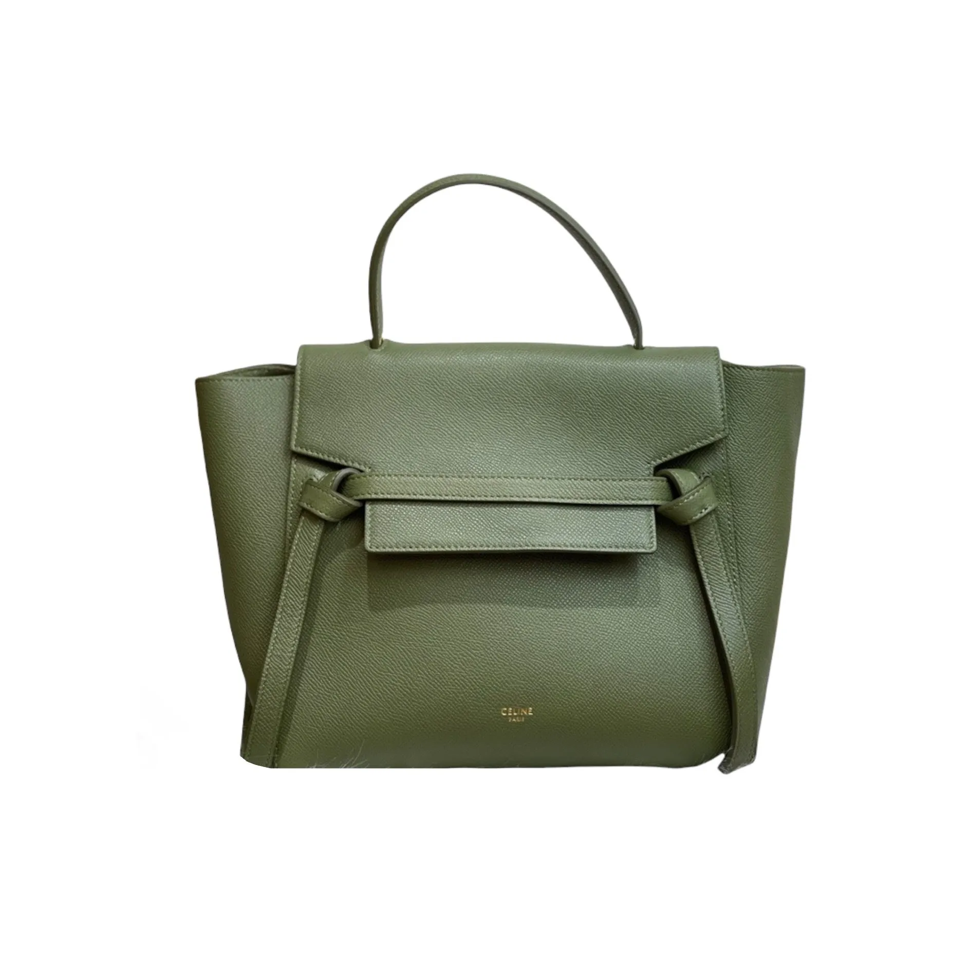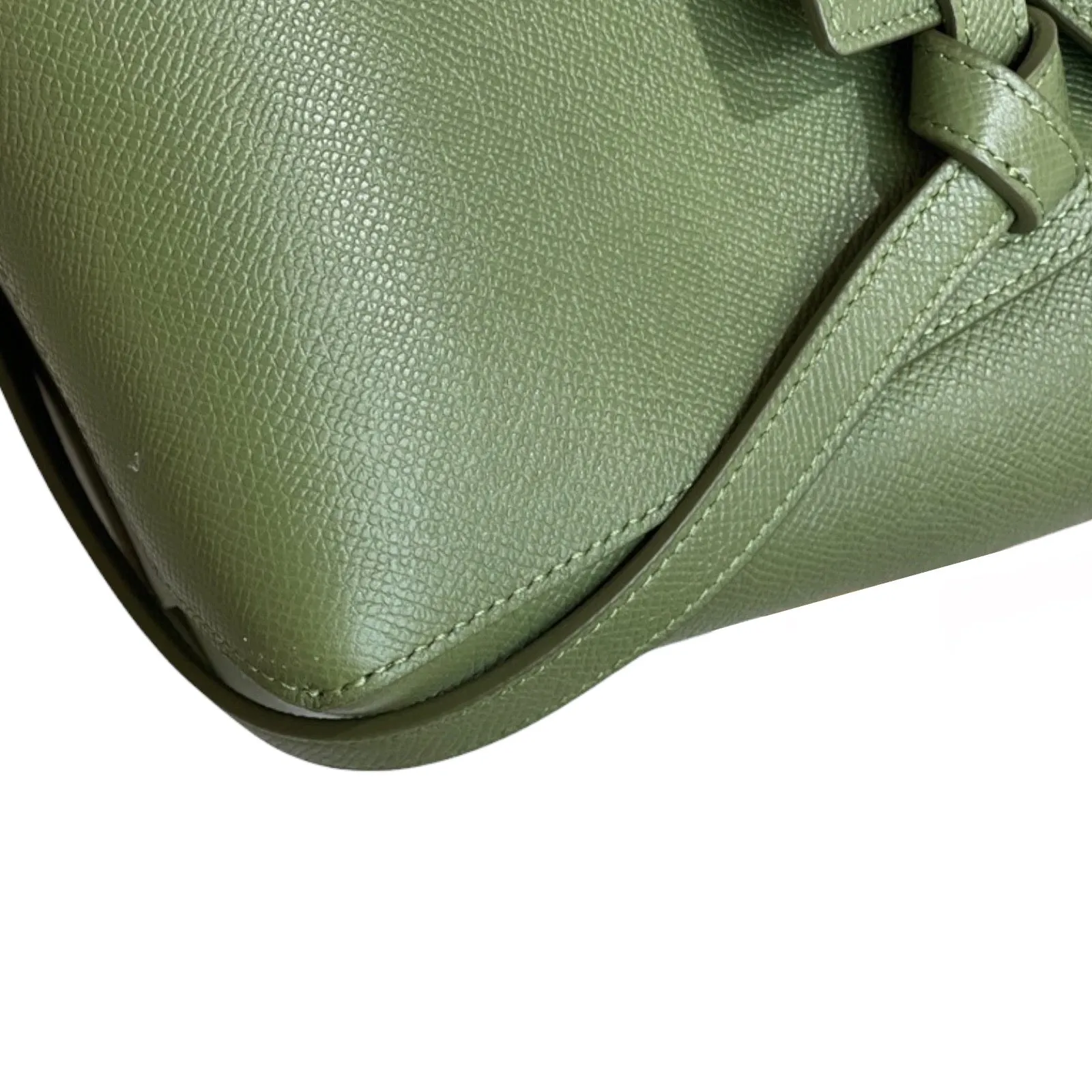 This Celine Mini Belt Bag is crafted of calfskin leather in hreen with a structured and spacious silhouette. The bag details a leather strap top handle, with brass hardware, and a front-facing flap that is decorated by knotted straps.