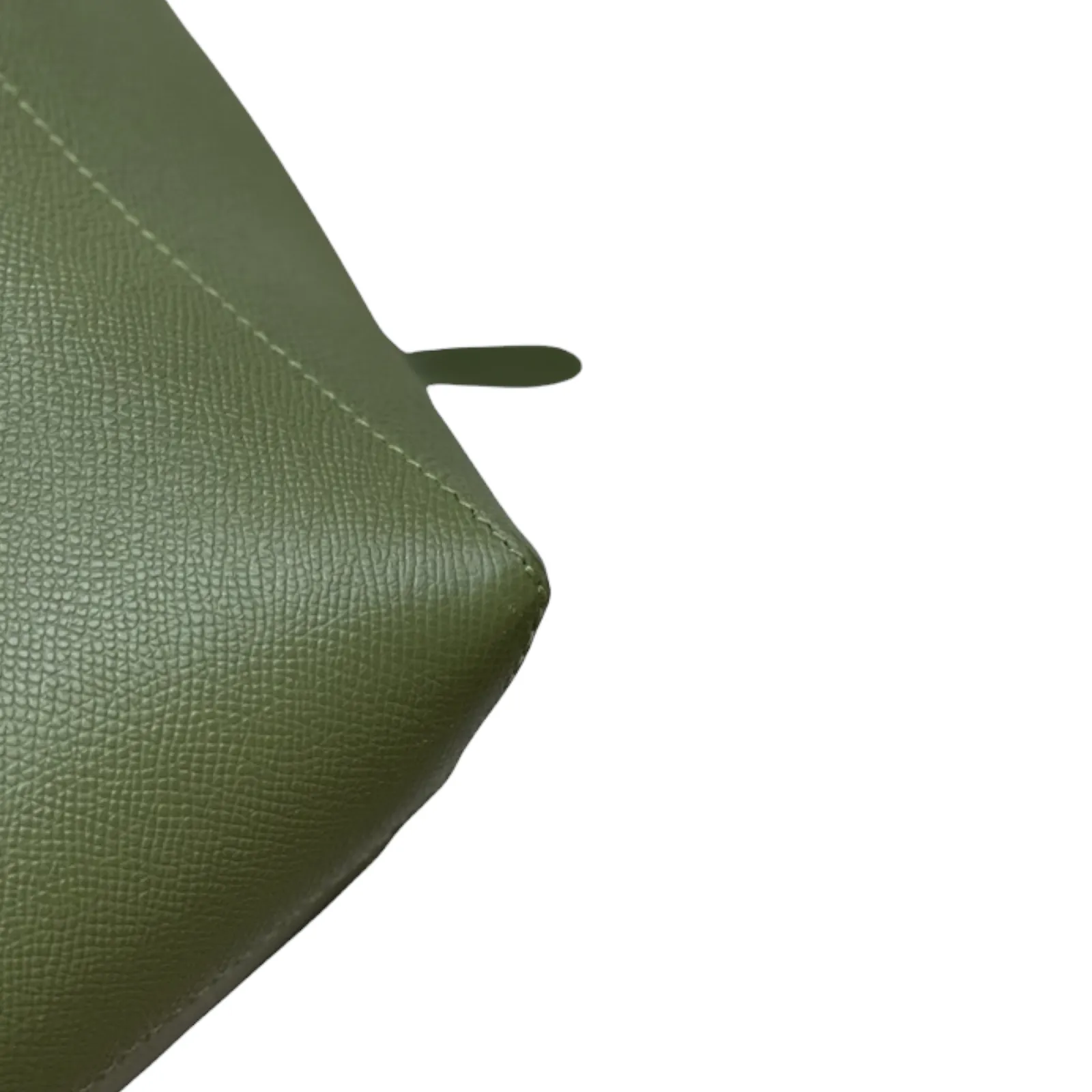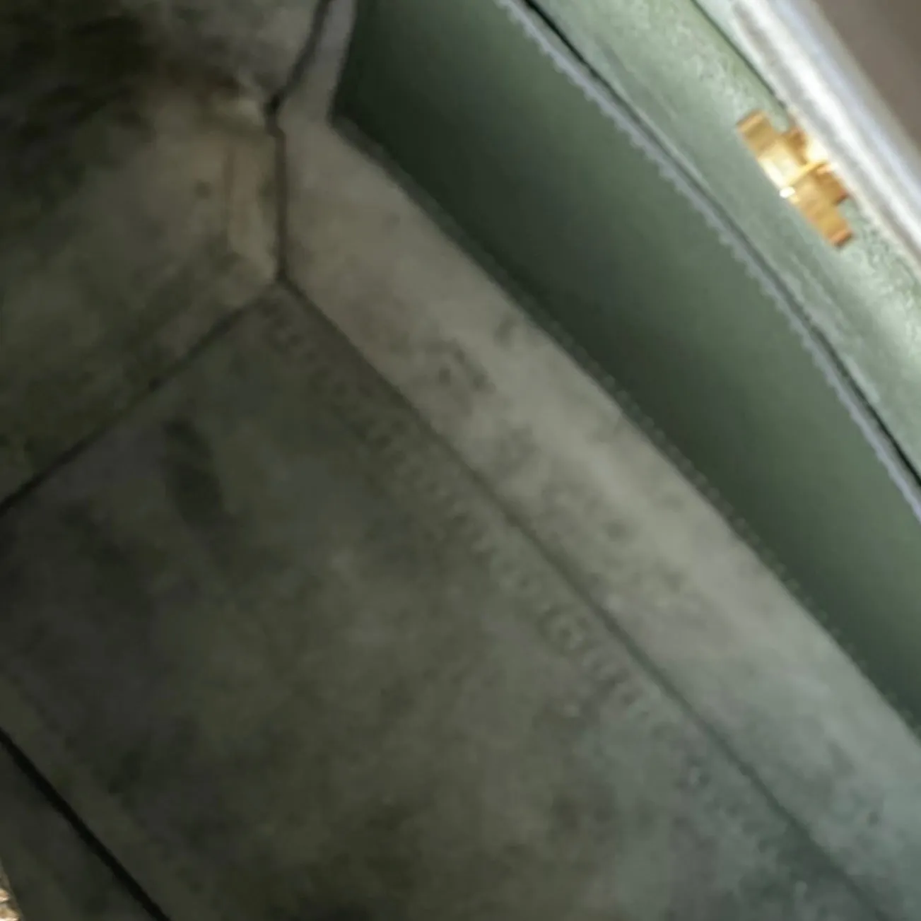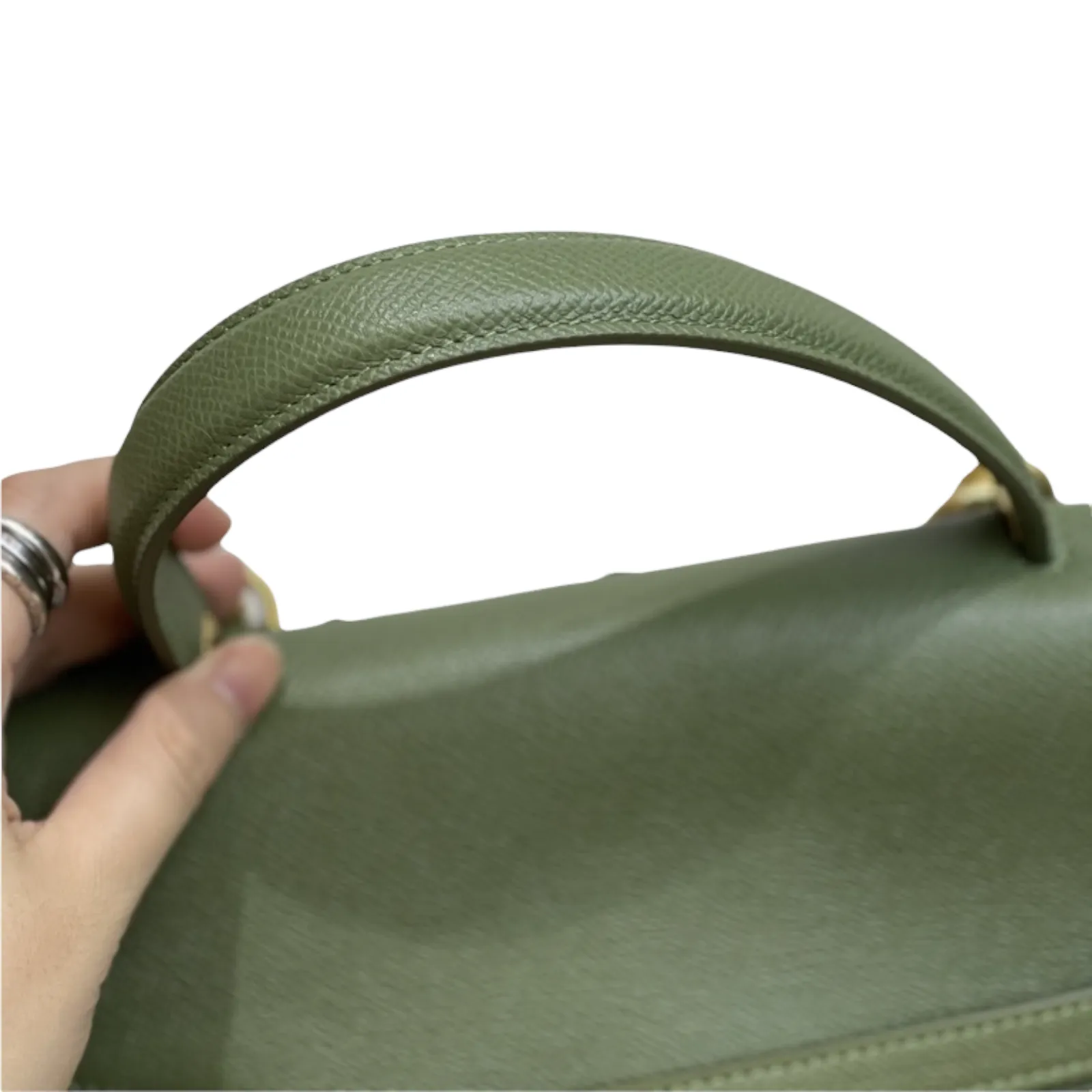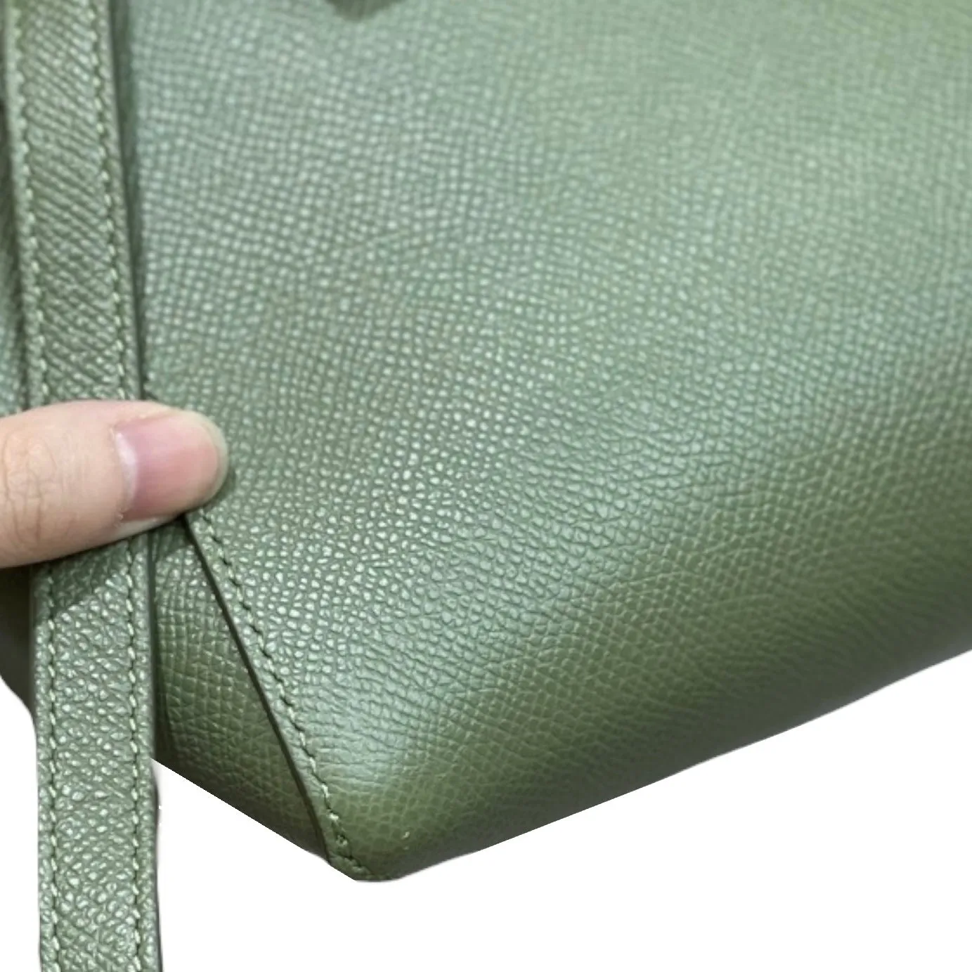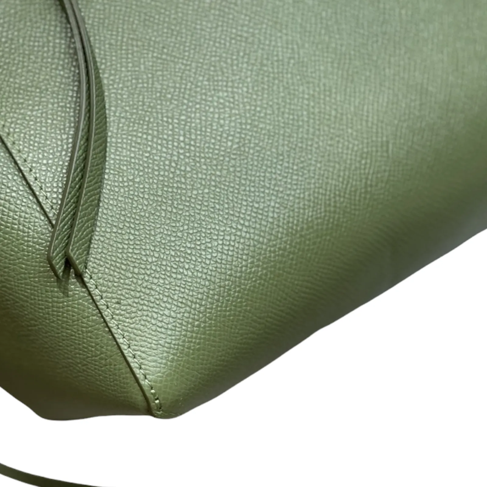 This Celine Mini Belt Bag is crafted of calfskin leather in hreen with a structured and spacious silhouette. The bag details a leather strap top handle, with brass hardware, and a front-facing flap that is decorated by knotted straps.