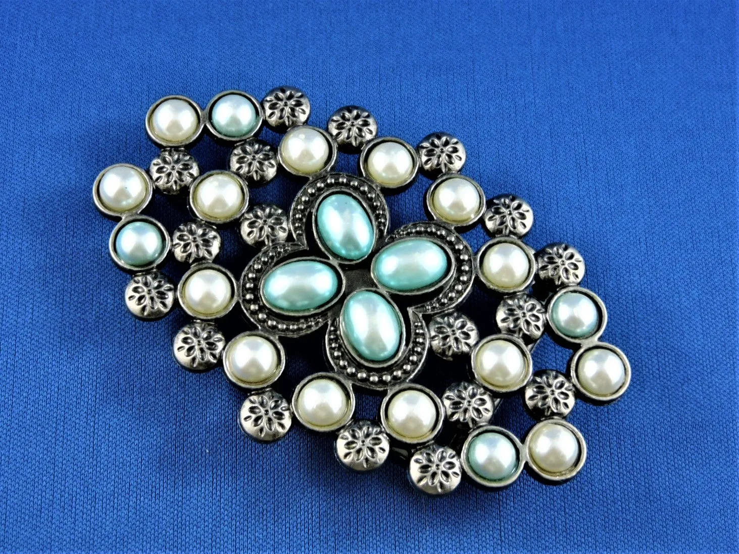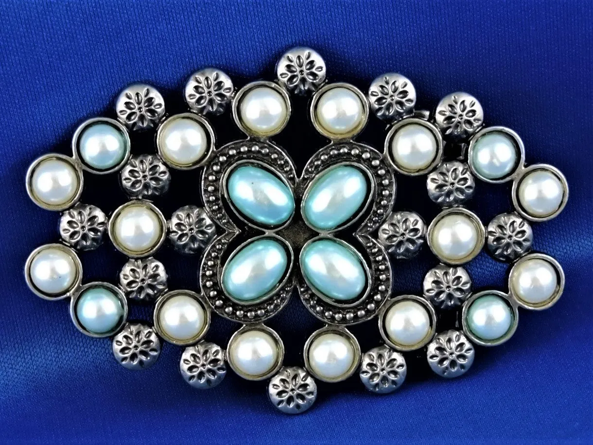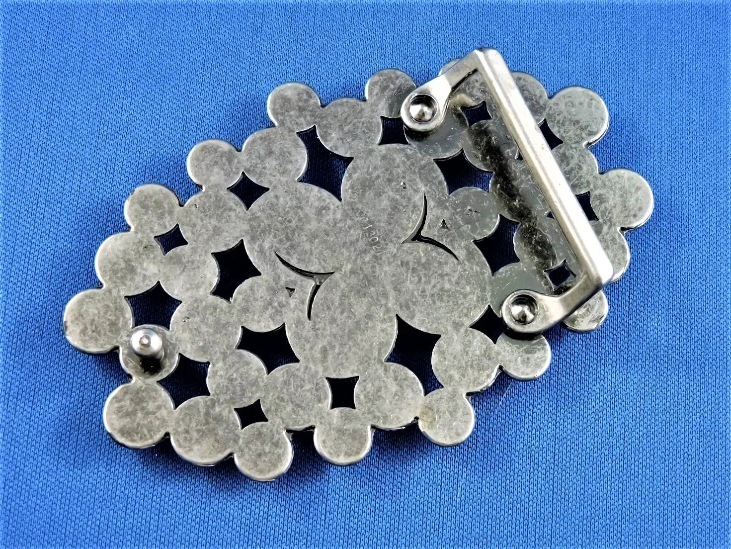 This metal belt buckle has a ornate settings with blue and white stones. Stamped on the back is OC13021. Ladies belt buckle.