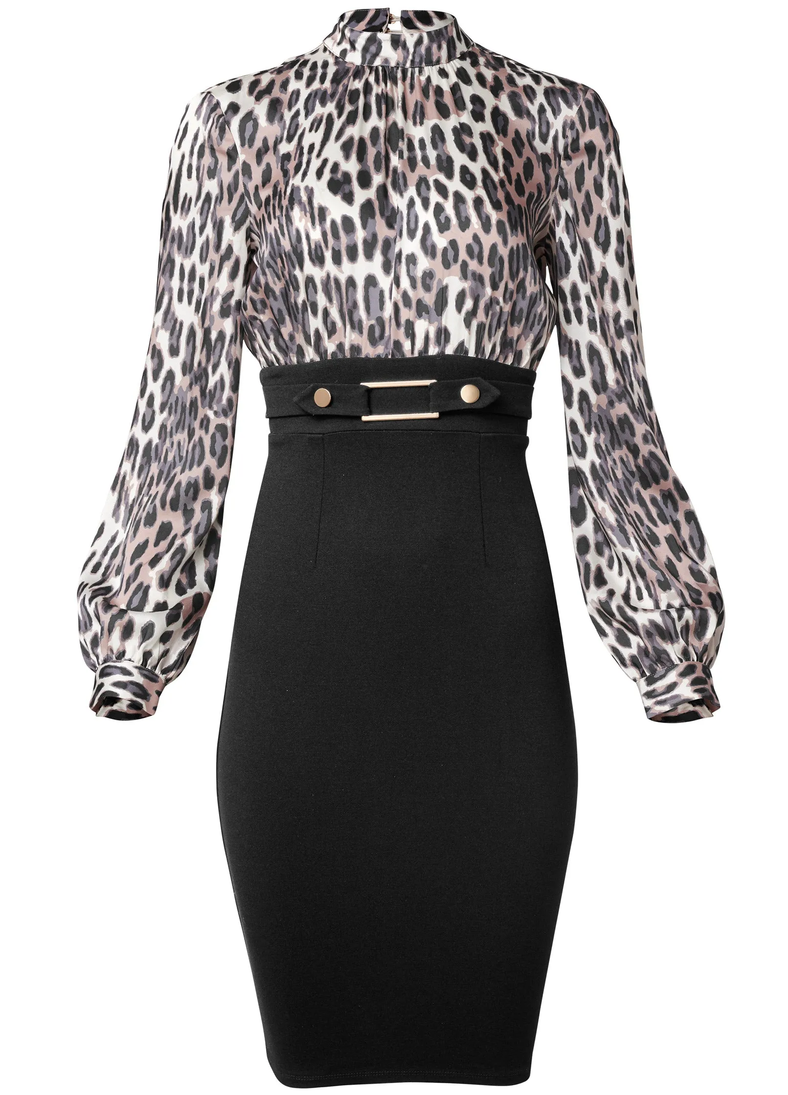 No need to play matchmaker with a top and skirt! This two-in-one style dress has you covered with a blousy printed top and coordinated solid color pencil skirt for a perfectly-paired look. A gold belt detail trims the front of the high waist, bringing a subtly luxe touch to the mock neck silhouette.* Sizes: XS (2), S (4-6), M (8-10), L (12-14), XL (16)* Plus sizes: 1X (18-20), 2X (22-24), 3X (26-28)* Faux belt with gold trim detail* Functional buttons at wrists and back* Slit keyhole at back bodice with button closure* Invisible zipper at back* Hits above knee approx. 40"* Fabric has stretch* Rayon/nylon/elastane skirt with poly top. Imported