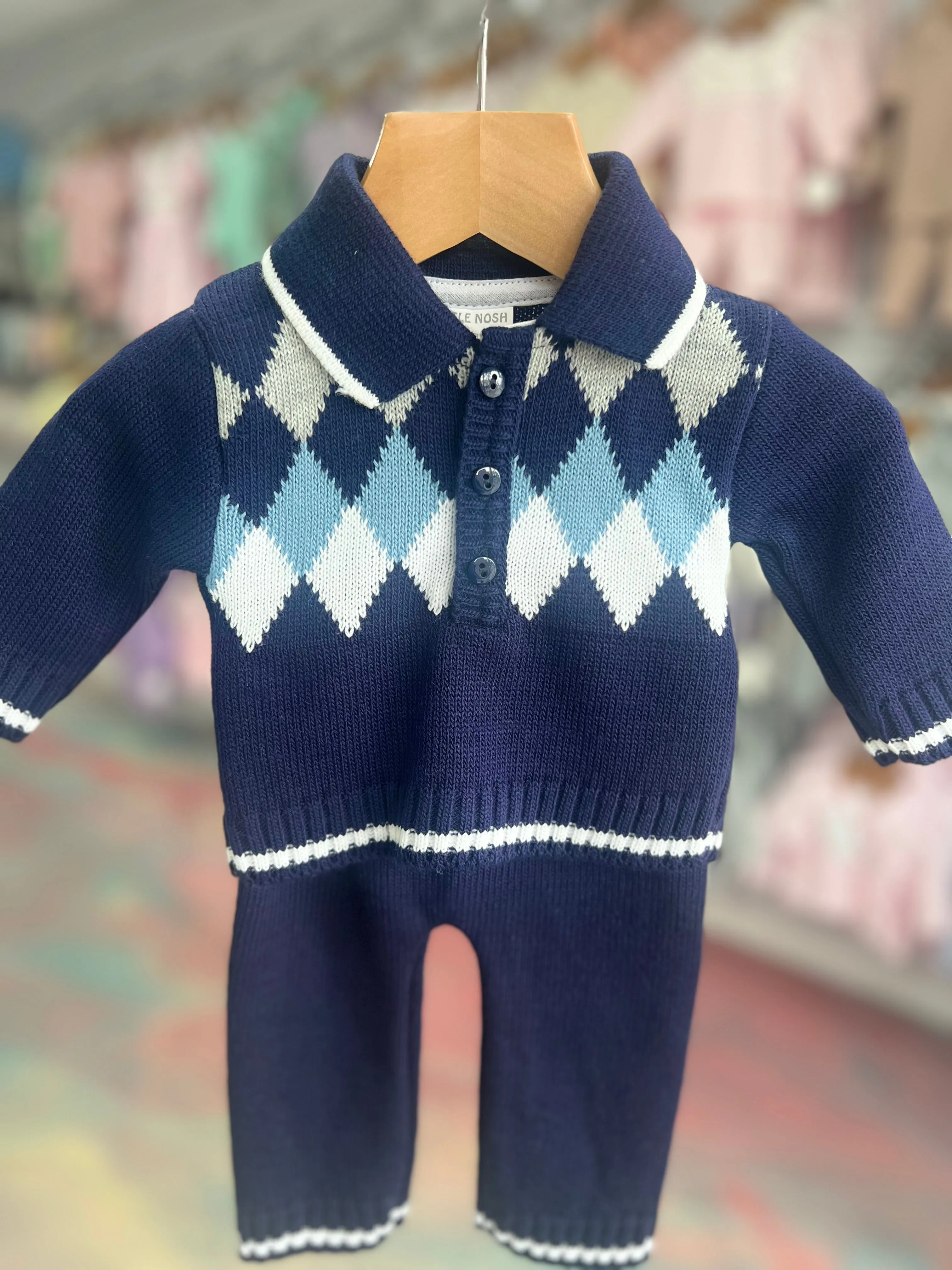 Cute boys, two piece knitted set in a lovely soft wool with a Pringle type pattern on the jumper and elasticated waist on the trousers.