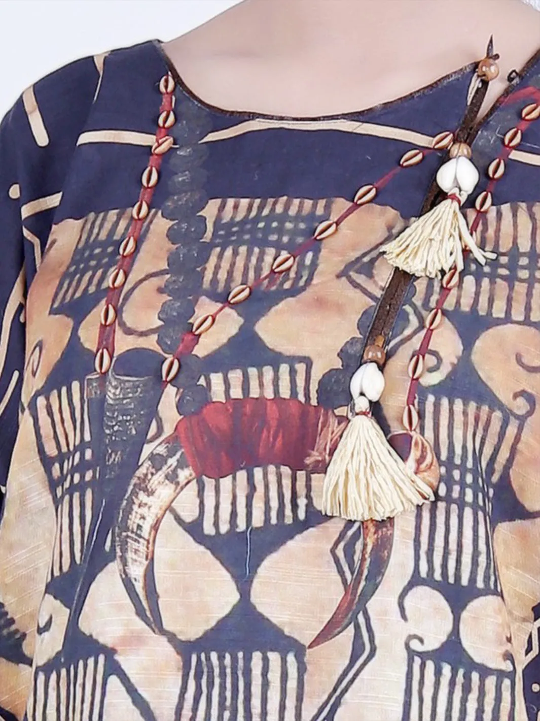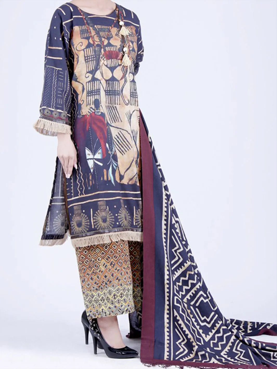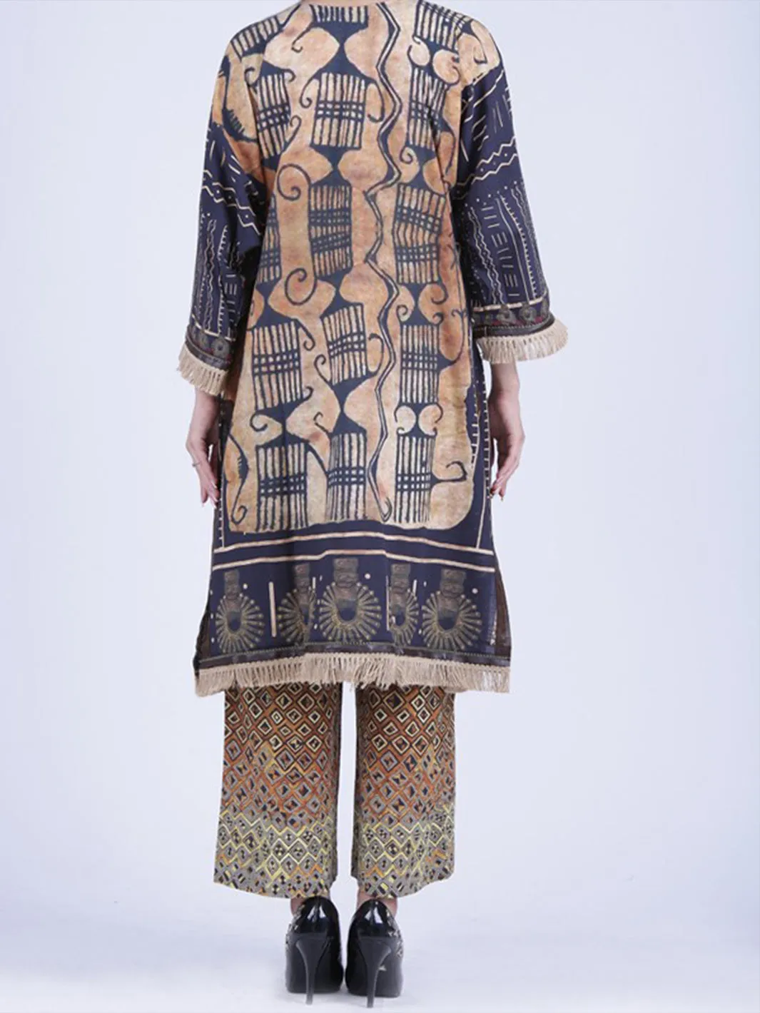 Tribal inspired shirt with beaded neckline and tassel details. Jute lace trimming on sleeves and daman.printed culottes with woolen silk shawl.