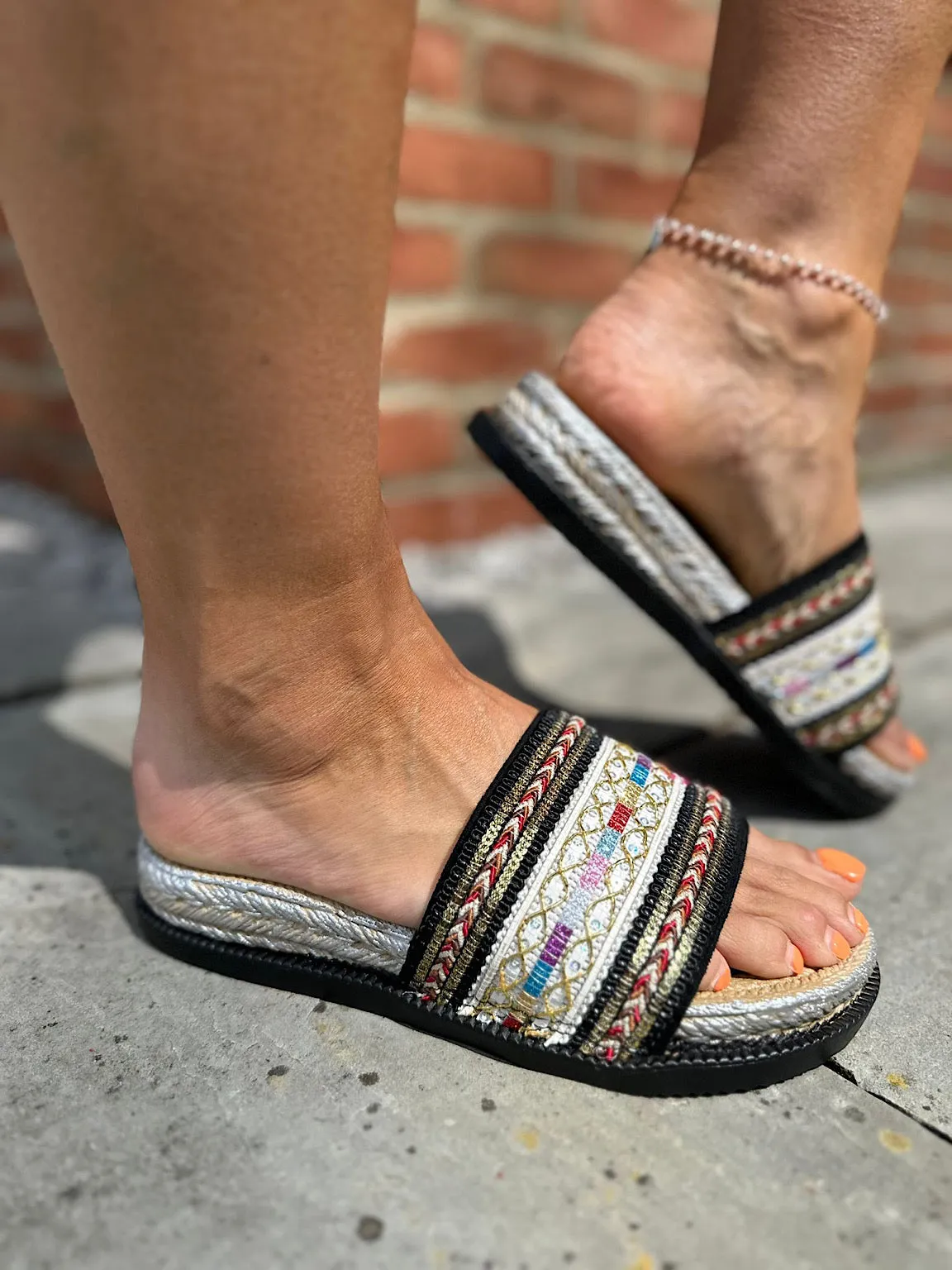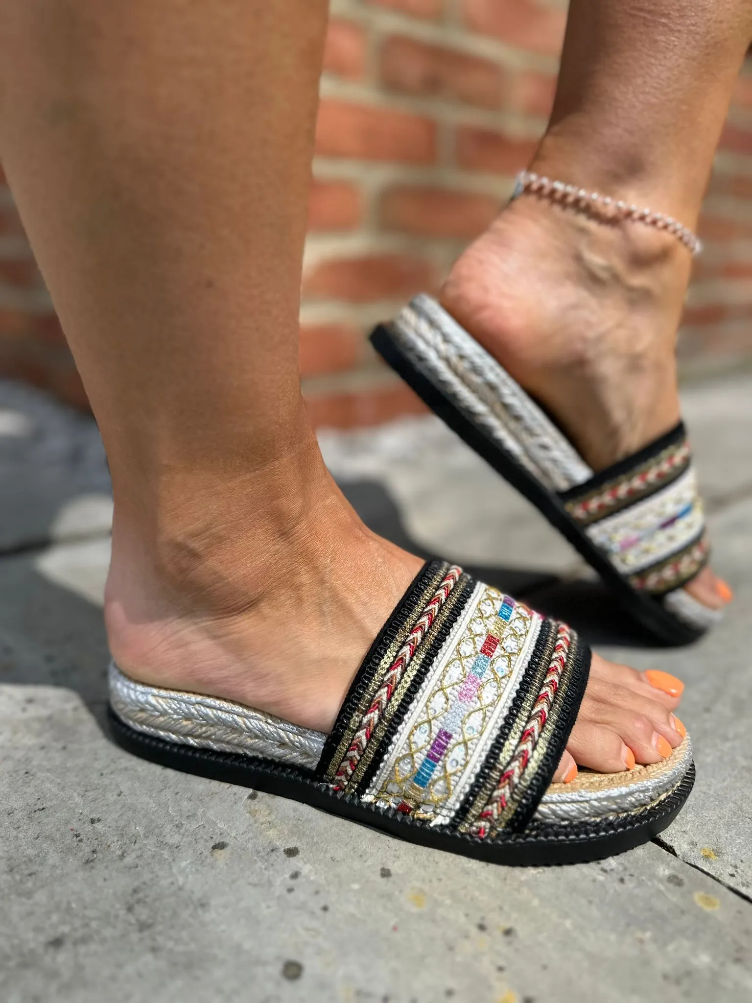 Expertly crafted with detailed embroidery on the band and silver weaving on the flatform sole, our Embroidery Weave Sliders offer both style and function. Experience a good grip with every step, making them perfect for any occasion. Elevate your footwear game with these sleek sliders.