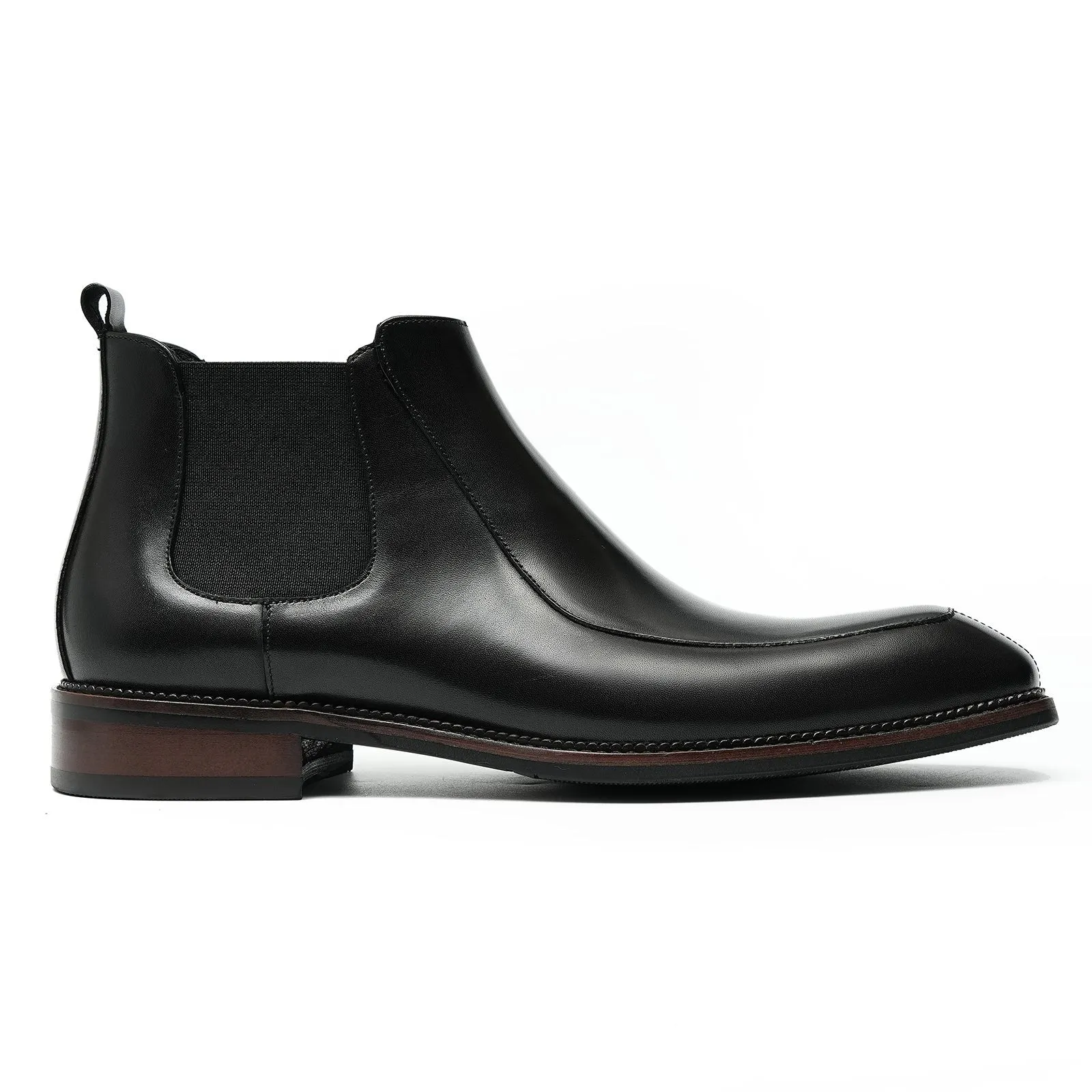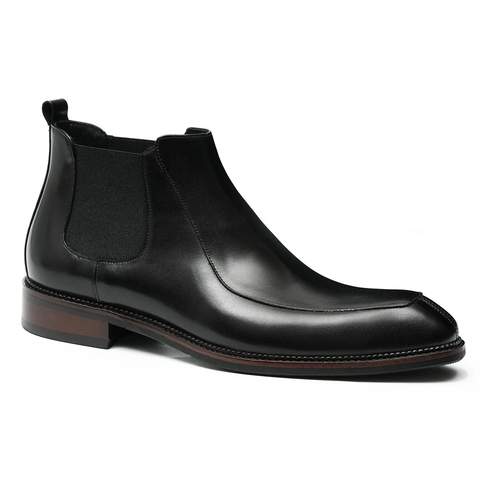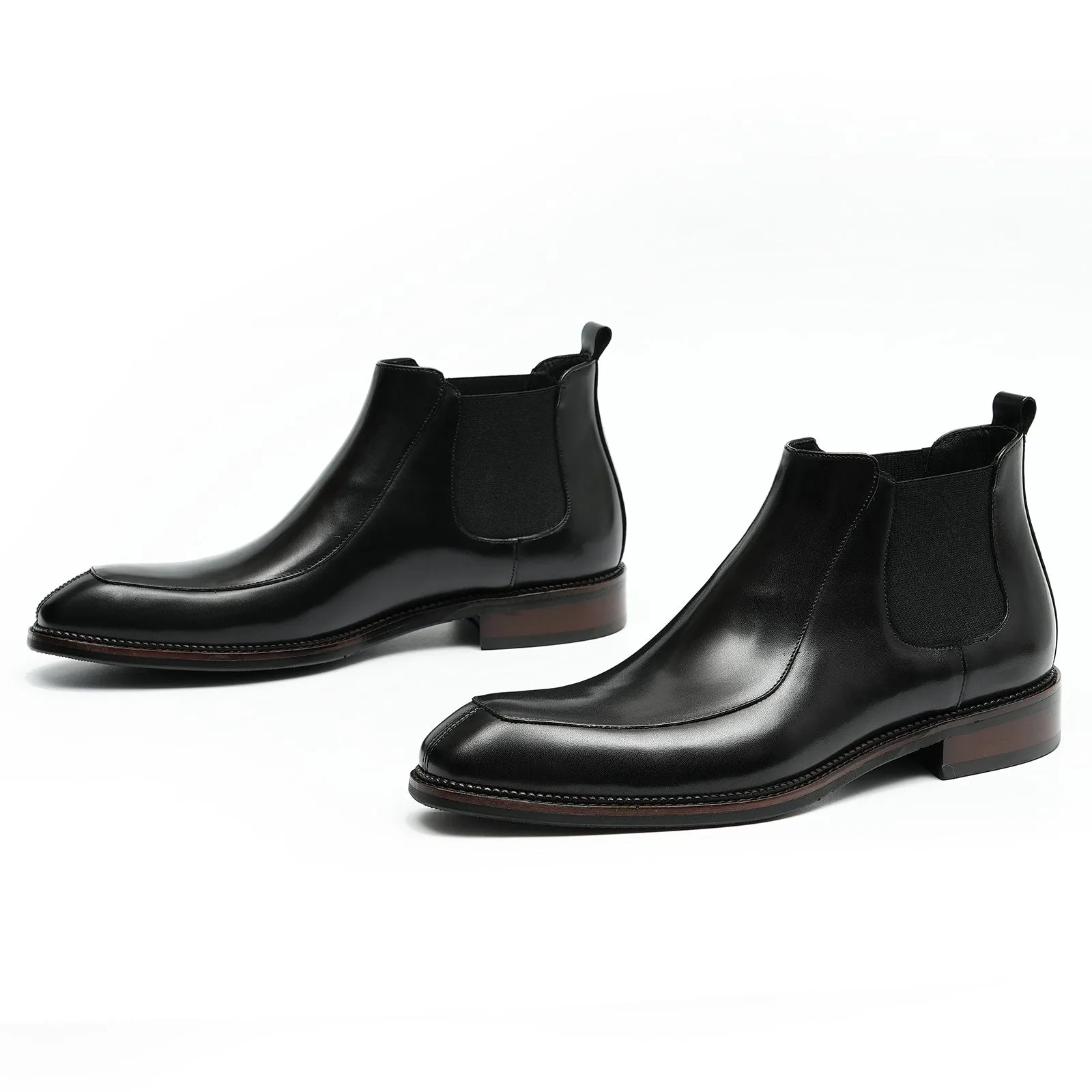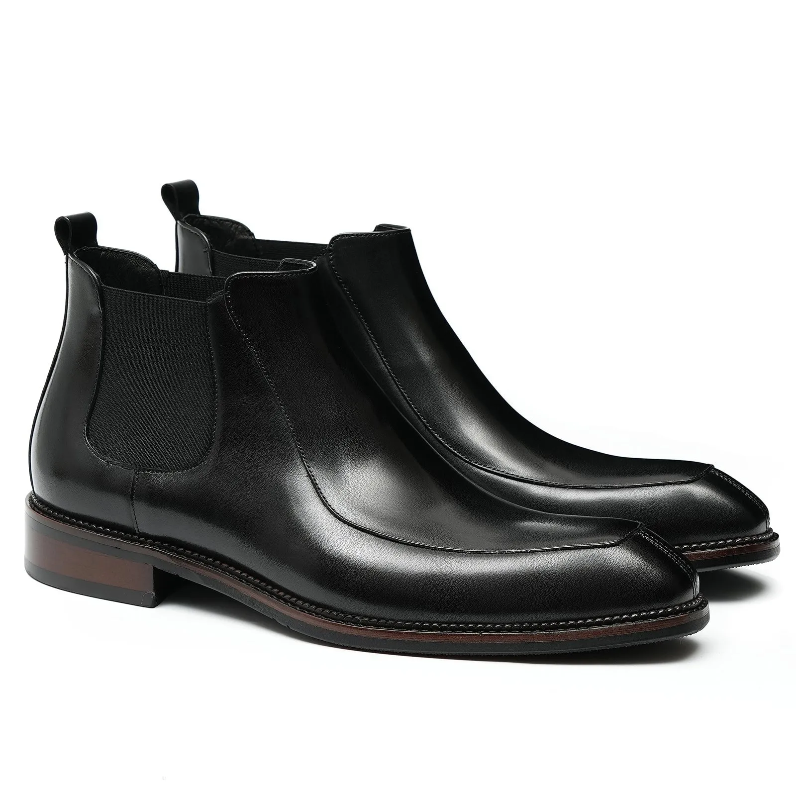 These black leather Chelsea boots are perfect for a gentleman seeking both style and comfort. The upper is crafted from premium full-grain calfskin leather, providing a sleek, elegant look that pairs perfectly with formal or smart-casual outfits. The elastic side panels and pull tab ensure easy wear, while the rubber sole offers excellent grip and durability. The classic design, with a slightly tapered toe and sophisticated stitching, makes these boots a timeless addition to any wardrobe. These versatile boots elevate any look effortlessly.