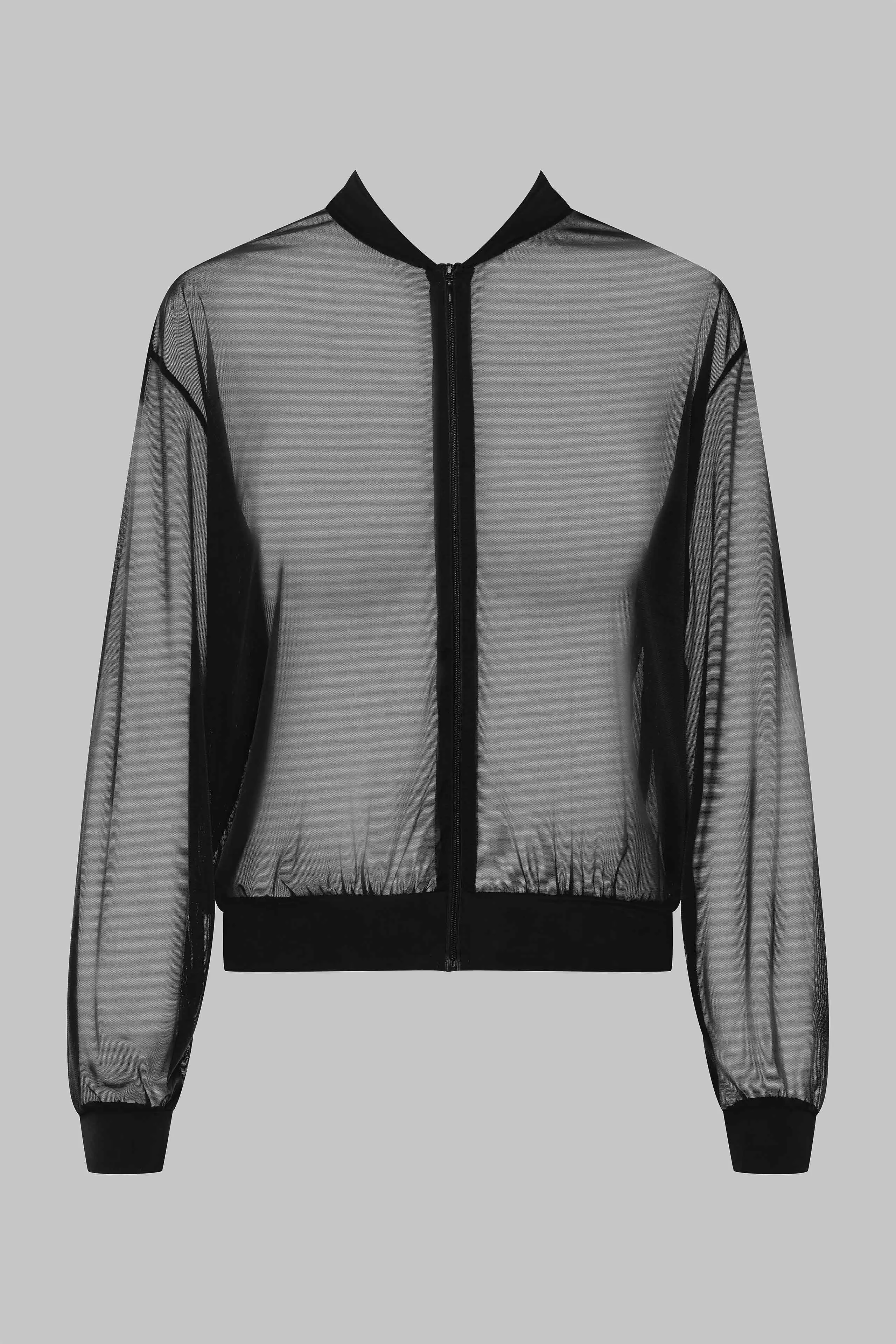 Bomber jacket made of a light, fluid super-sheer tulle. Semi-opaque microfibre lined at waist, cuffs and collar for added elegance. Opens with a tone-on-tone zip. This versatile reversible piece will complement all your outfits for daytime and evening.