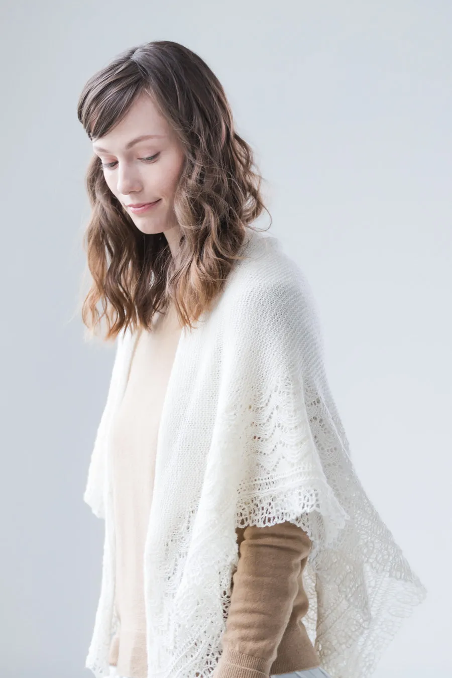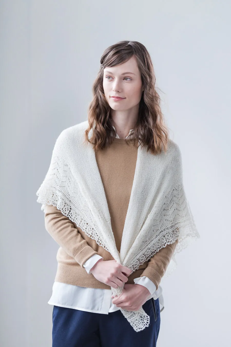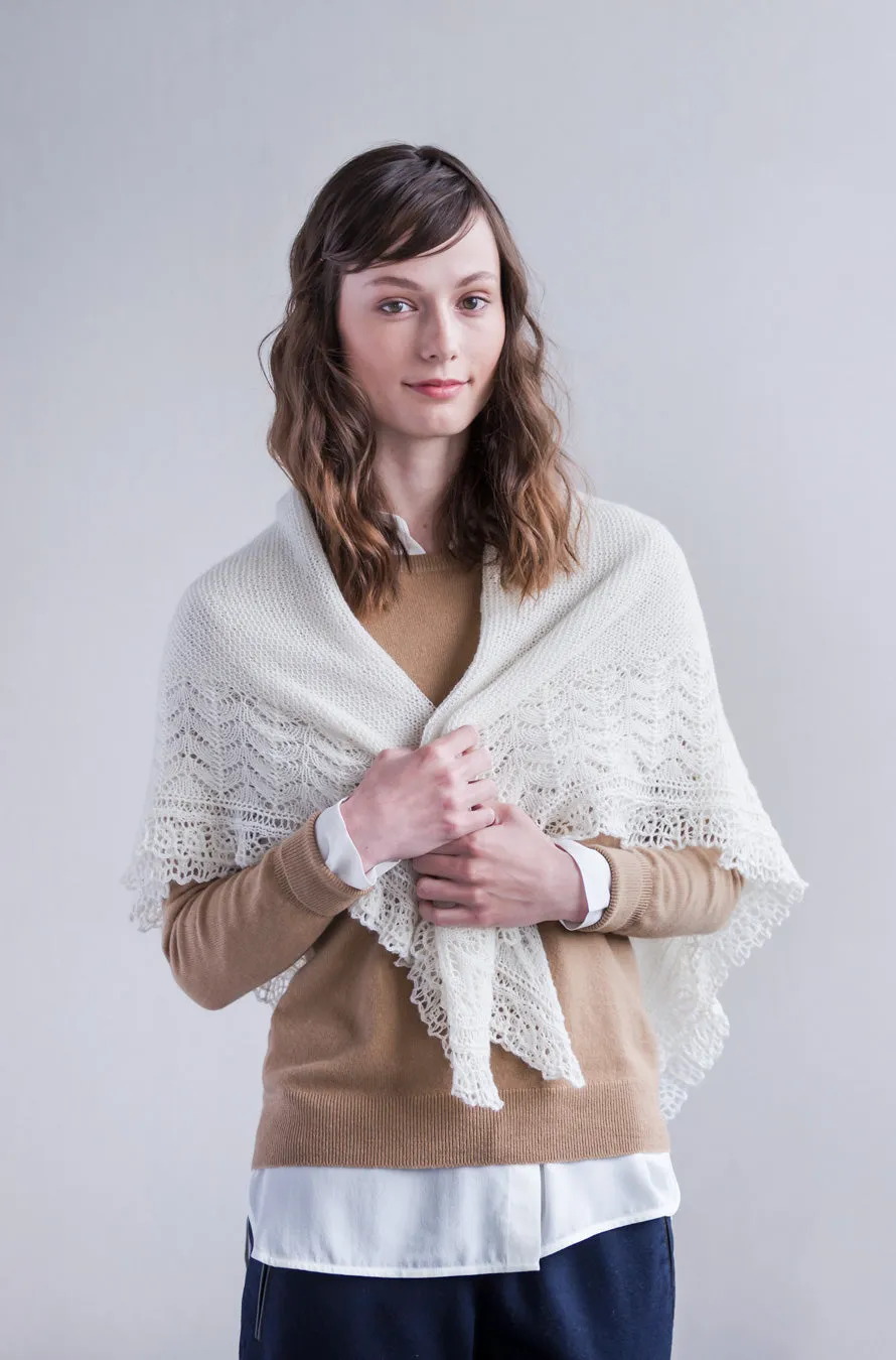 Bridgewater begins as a simple garter stitch square, worked on the bias with increases and decreases to add a touch of asymmetrical interest to the finished piece. The central square is framed with horseshoe lace, a pattern that originated in the Shetland Islands in the 19th century, worked circularly from stitches picked up around the perimeter. The shawl is completed with a traditional knitted-on edging reminiscent of water droplets, worked perpendicularly and joined to the live stitches as you go. This elegantly simple accessory makes a beautiful heirloom baby gift or a timeless addition to any wardrobe.