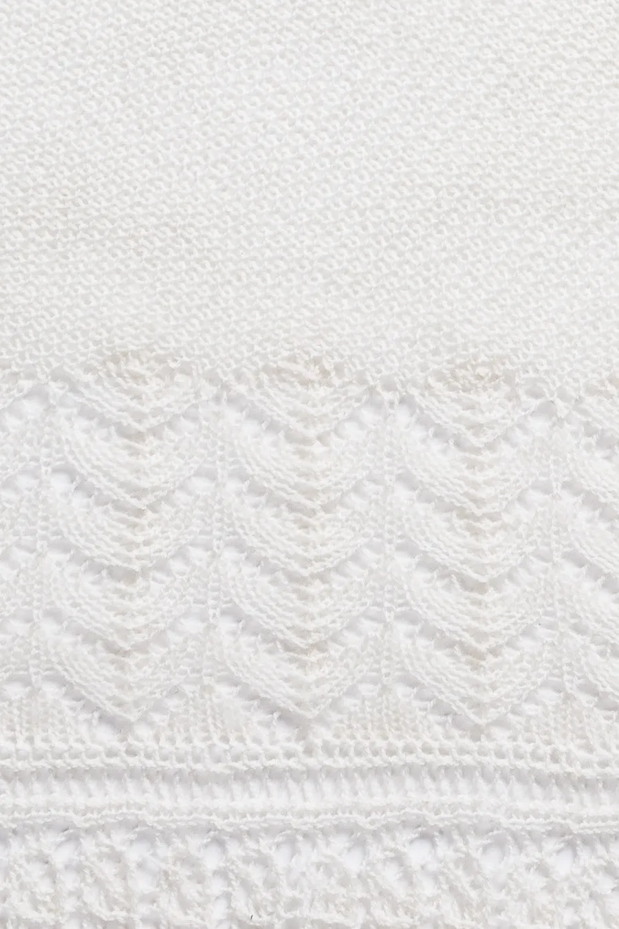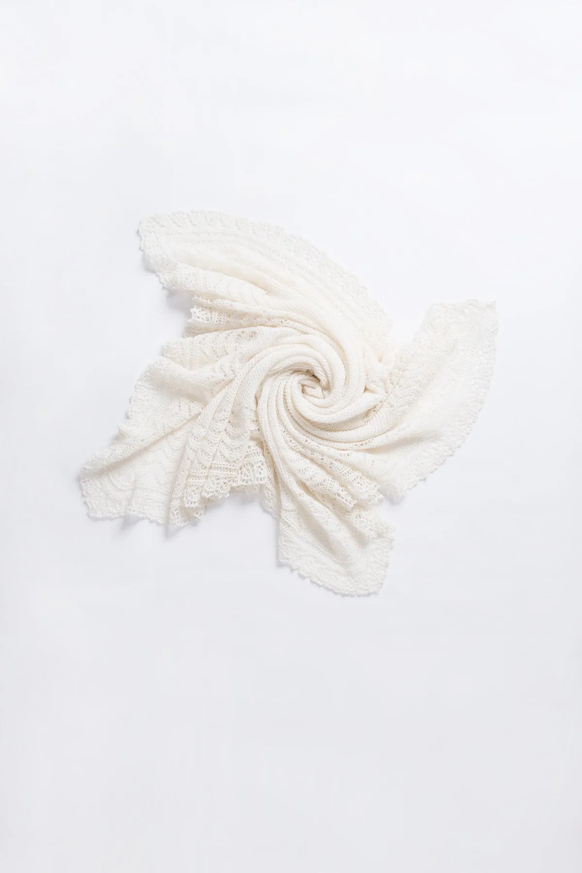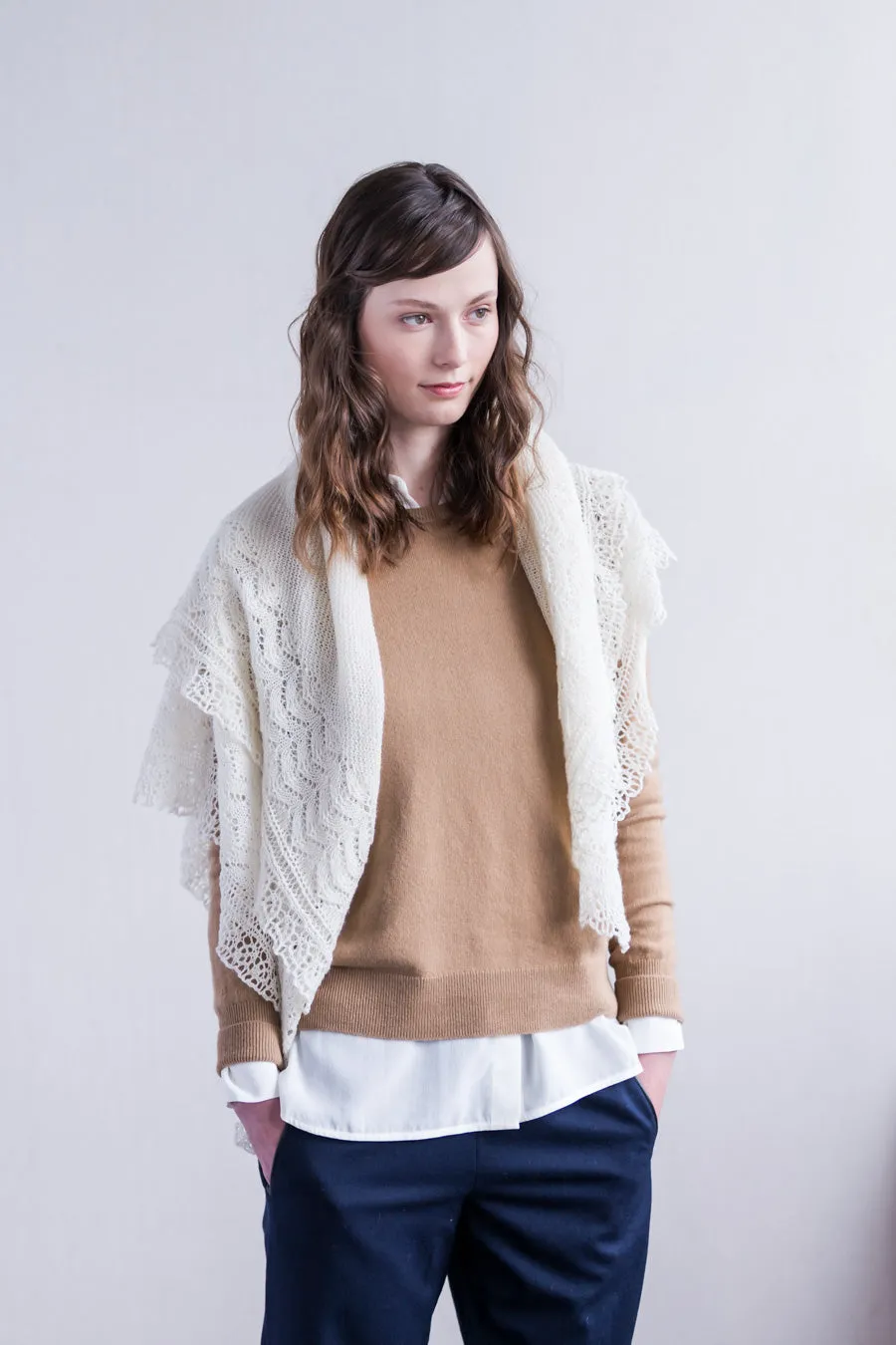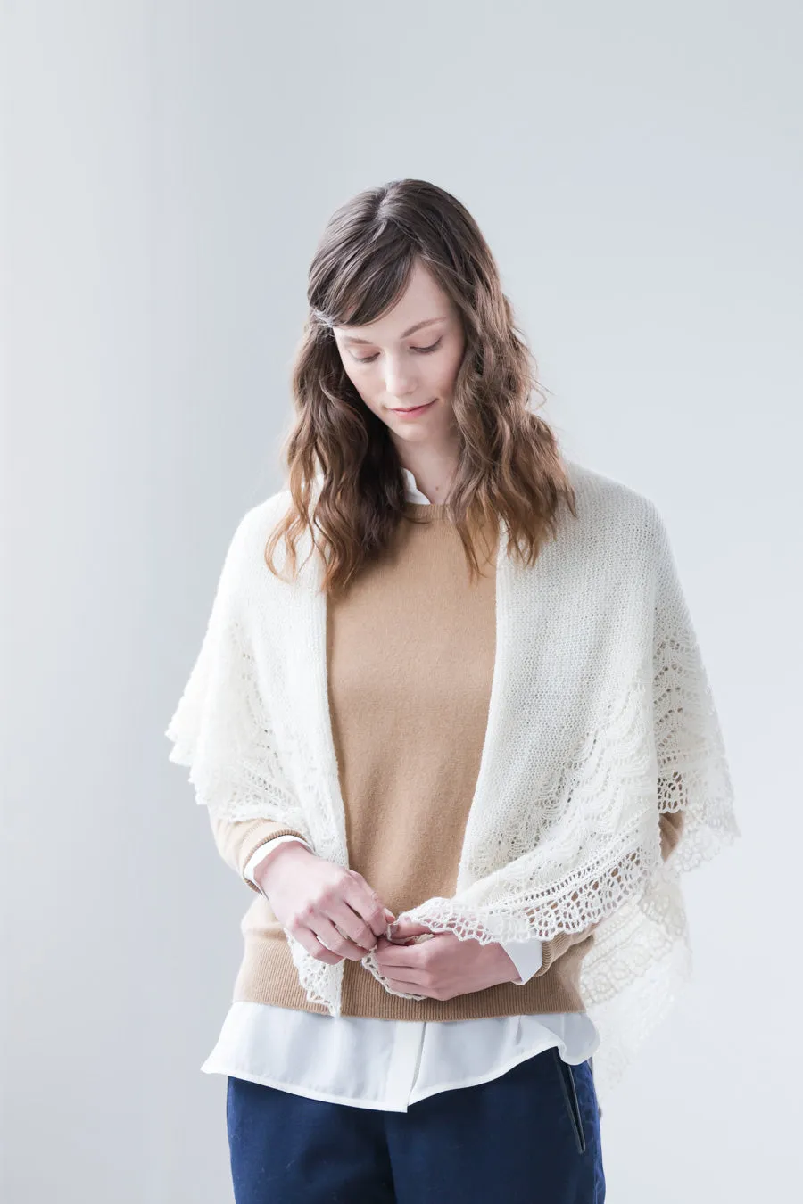 Bridgewater begins as a simple garter stitch square, worked on the bias with increases and decreases to add a touch of asymmetrical interest to the finished piece. The central square is framed with horseshoe lace, a pattern that originated in the Shetland Islands in the 19th century, worked circularly from stitches picked up around the perimeter. The shawl is completed with a traditional knitted-on edging reminiscent of water droplets, worked perpendicularly and joined to the live stitches as you go. This elegantly simple accessory makes a beautiful heirloom baby gift or a timeless addition to any wardrobe.