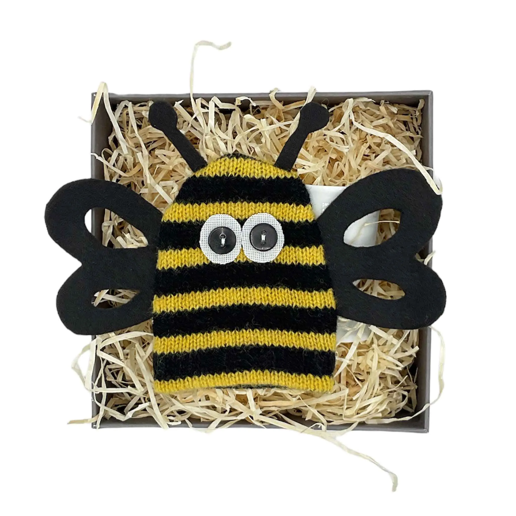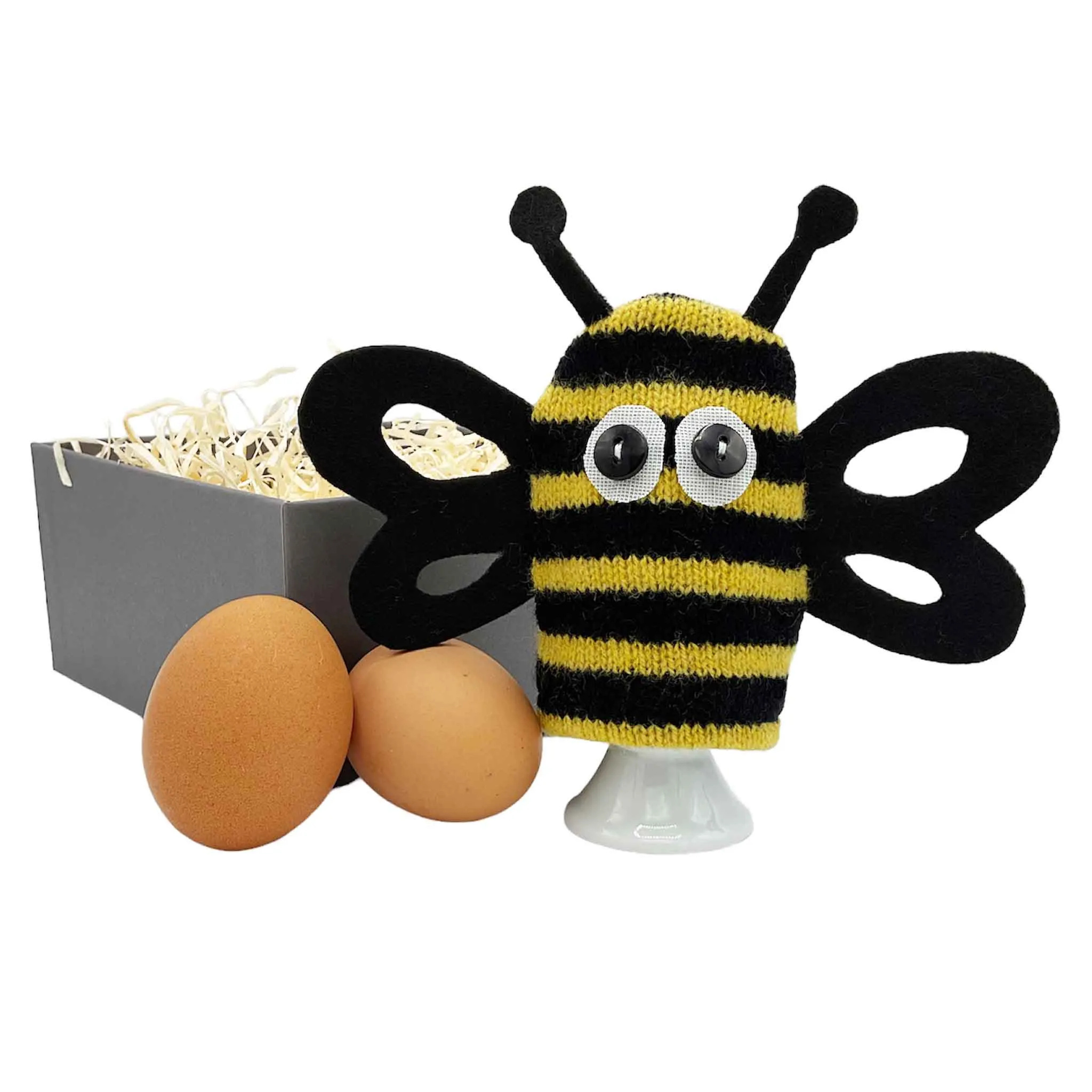 Get buzzzzzy breakfasting with this characterful, knitted bee egg cosy set. Lovingly made from soft, felted, 100% lambswool, it will keep your eggs warm and delicious until it's time to eat. This characterful, knitted cosy brings nature to the table and brightens breakfast time. It is presented in a cute nest box with a white ceramic egg cup.