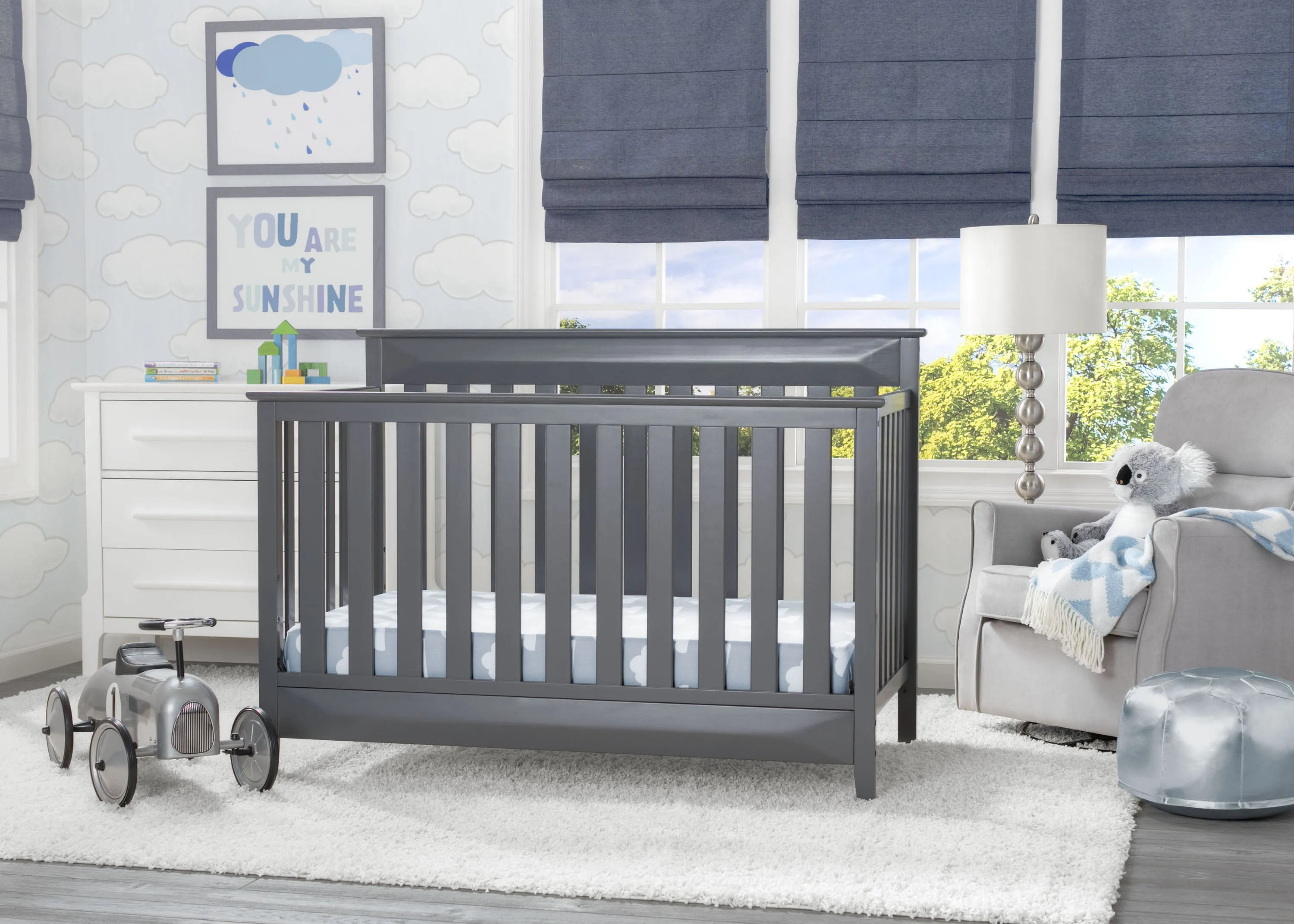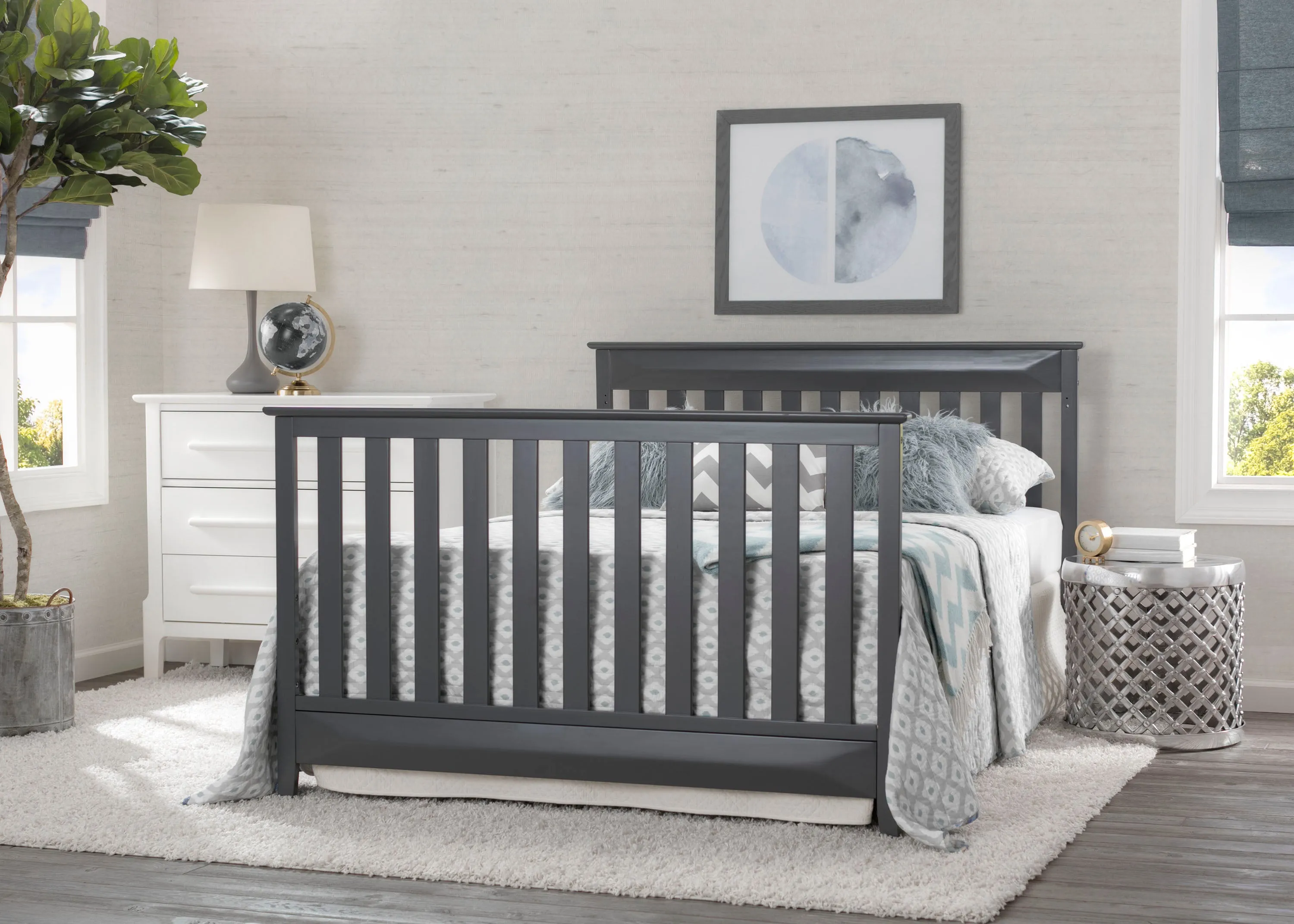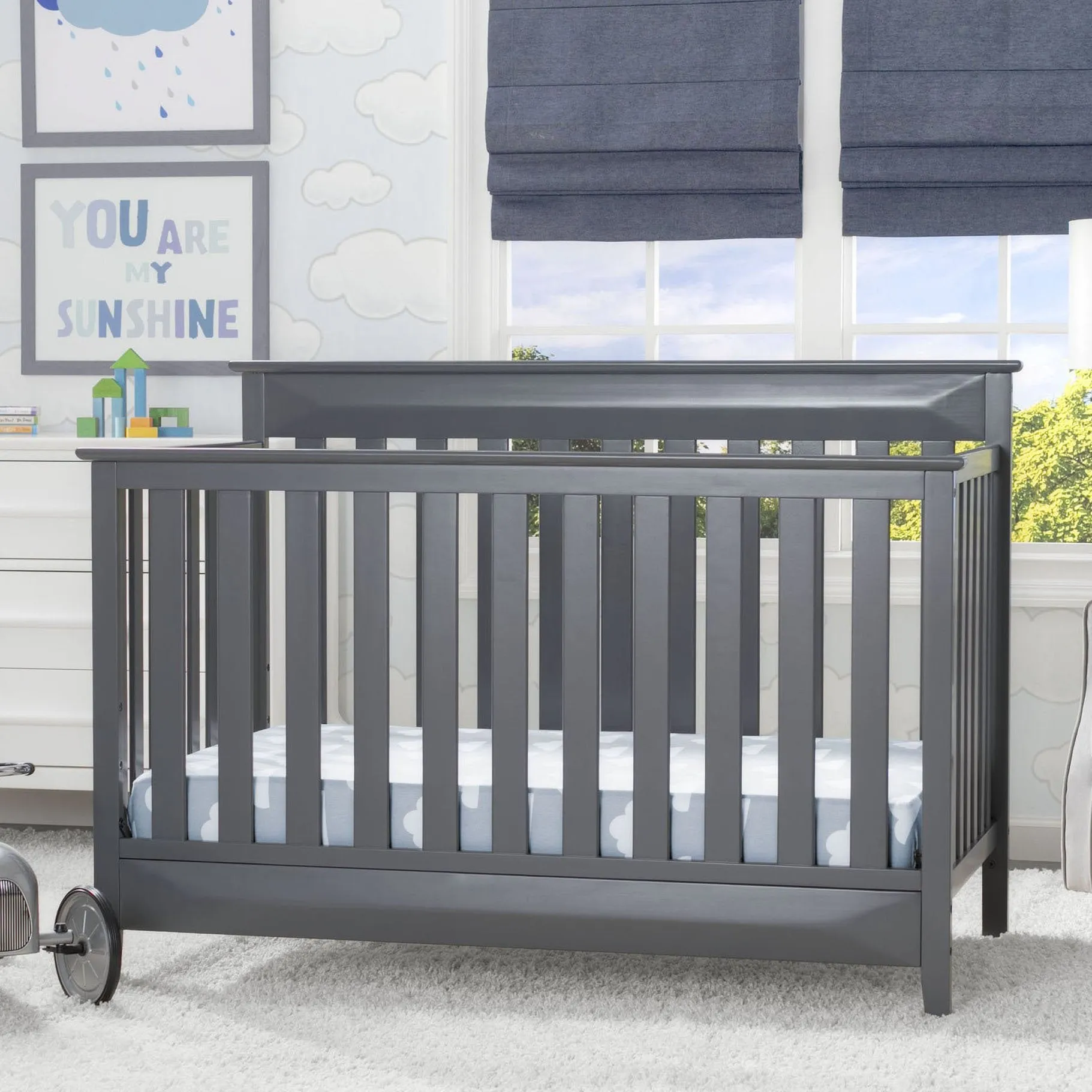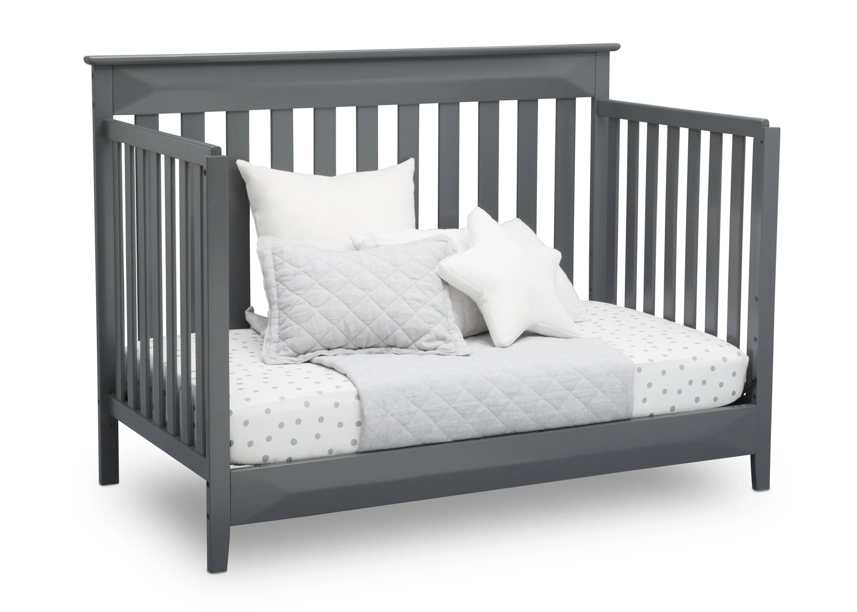 The Cameron 4-in-1 Convertible Crib from Delta Children is a timeless option for your baby’s nursery. Crafted of strong and sturdy wood, this classic baby crib features three-dimensional sculptural detailing on the headboard and footboard panels for added interest while the airy slats all around offer a clear view to your little one. The crib’s grow-with-me design adapts to each stage of your child’s life. As a crib, it features an adjustable height mattress support that allows you to keep your baby safe by lowering the crib mattress as they begin to stand. When your little one is ready to make the move to a big-kid bed, the crib converts into a toddler bed, daybed or full size bed (Daybed Rail included; Toddler Guardrail and Full Size Bed Rails sold separately). Available in Charcoal Grey.