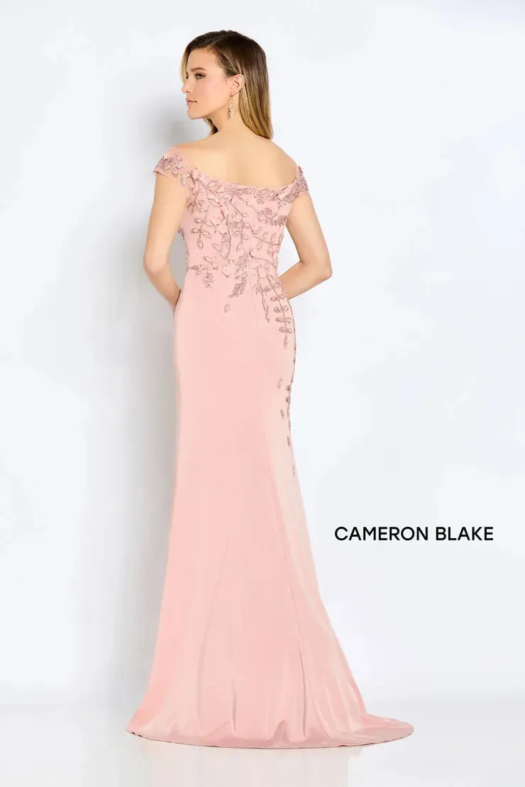 Unique crepe gown with an asymmetrical draped bodice with beaded floral lace and three-dimensional floral motifs, tip of the shoulder neckline. Shawl included.