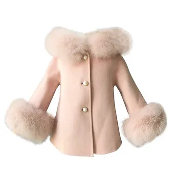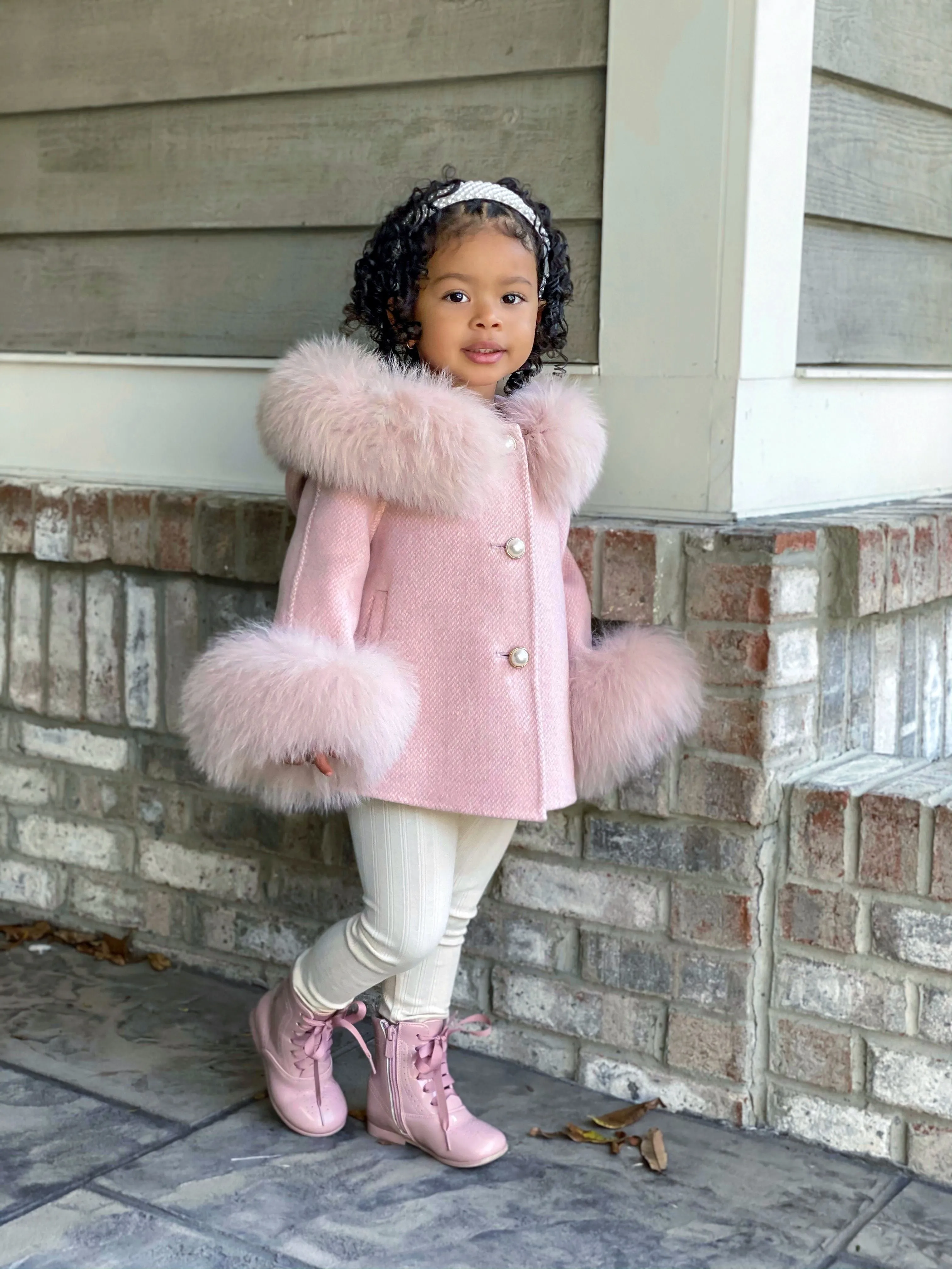 This stunning cashmere blend jacket in Blush Pink is one of our favourites. We have added a sumptuous matching fur hood trim and cuffs, both of which are detachable. This beautiful garment features handy slant pockets, keeping little hands warm on a chilly day.