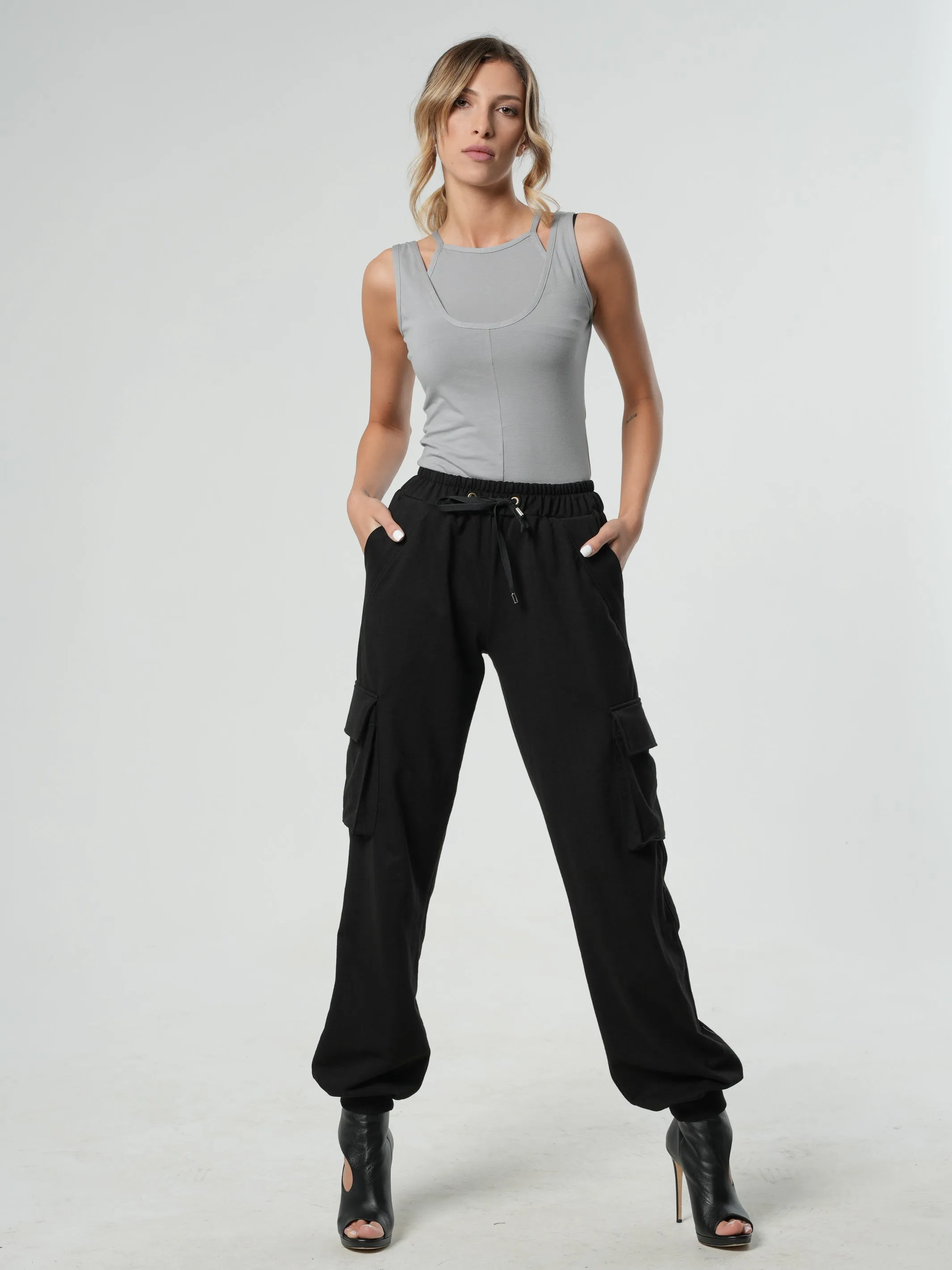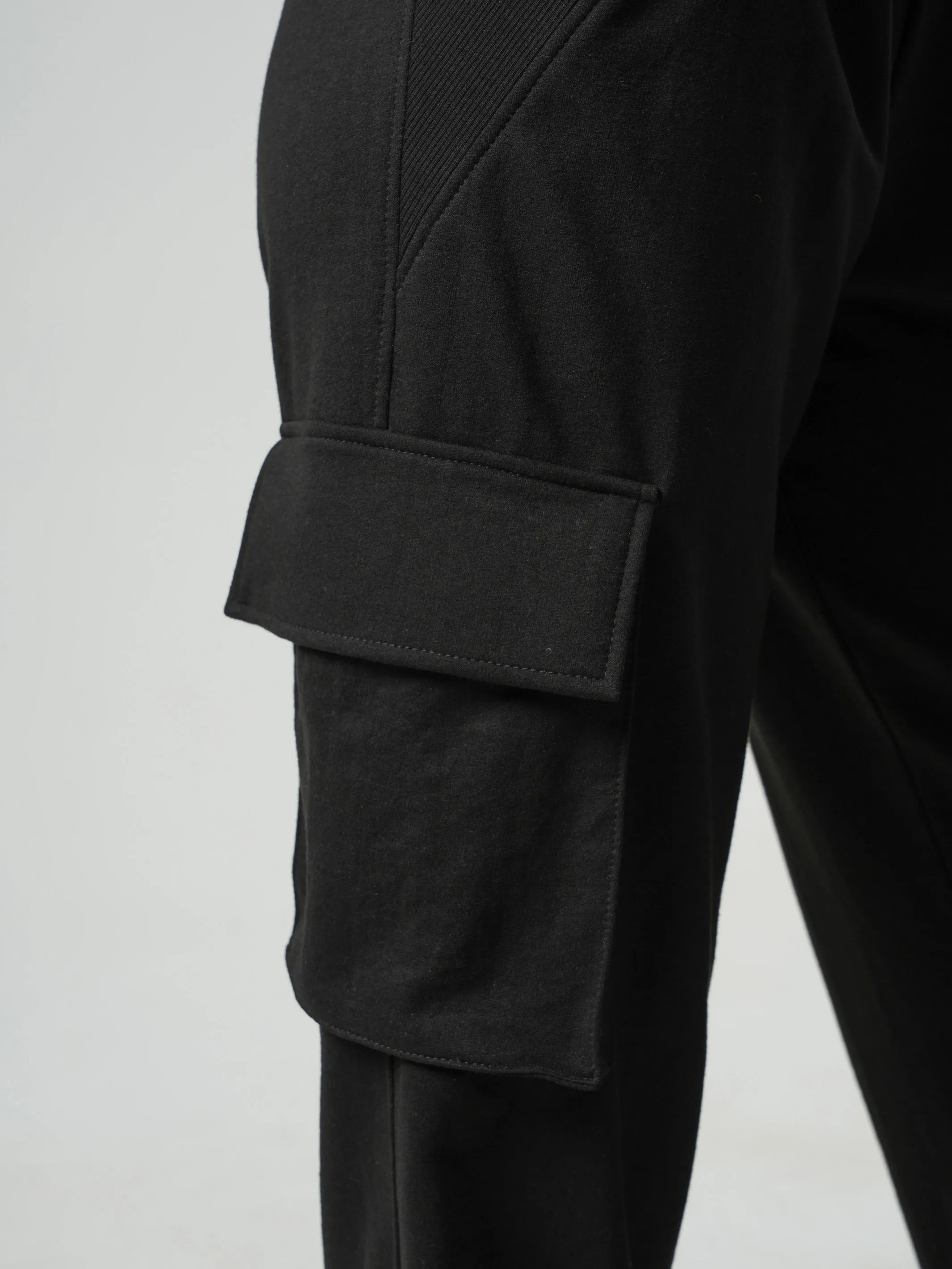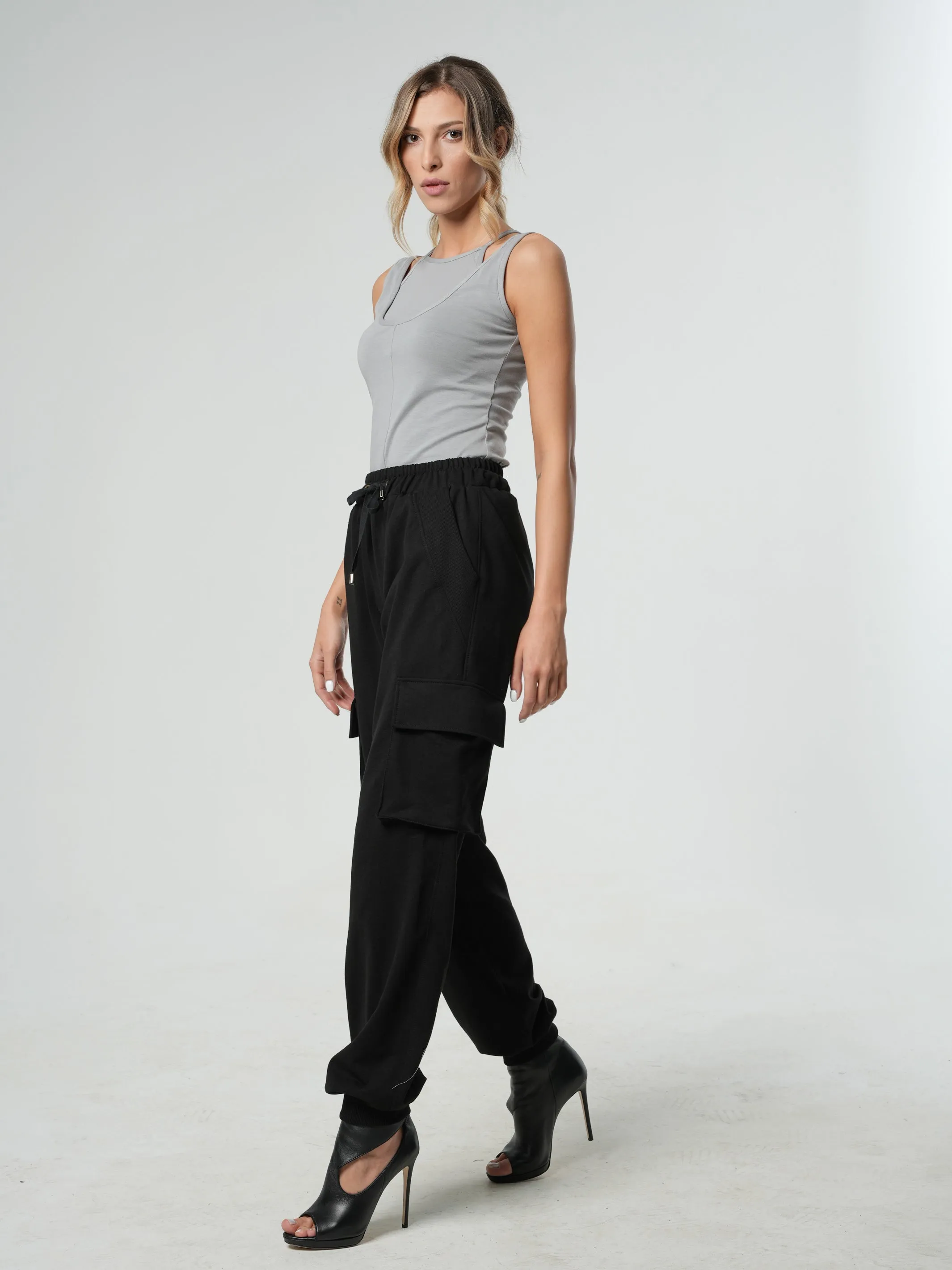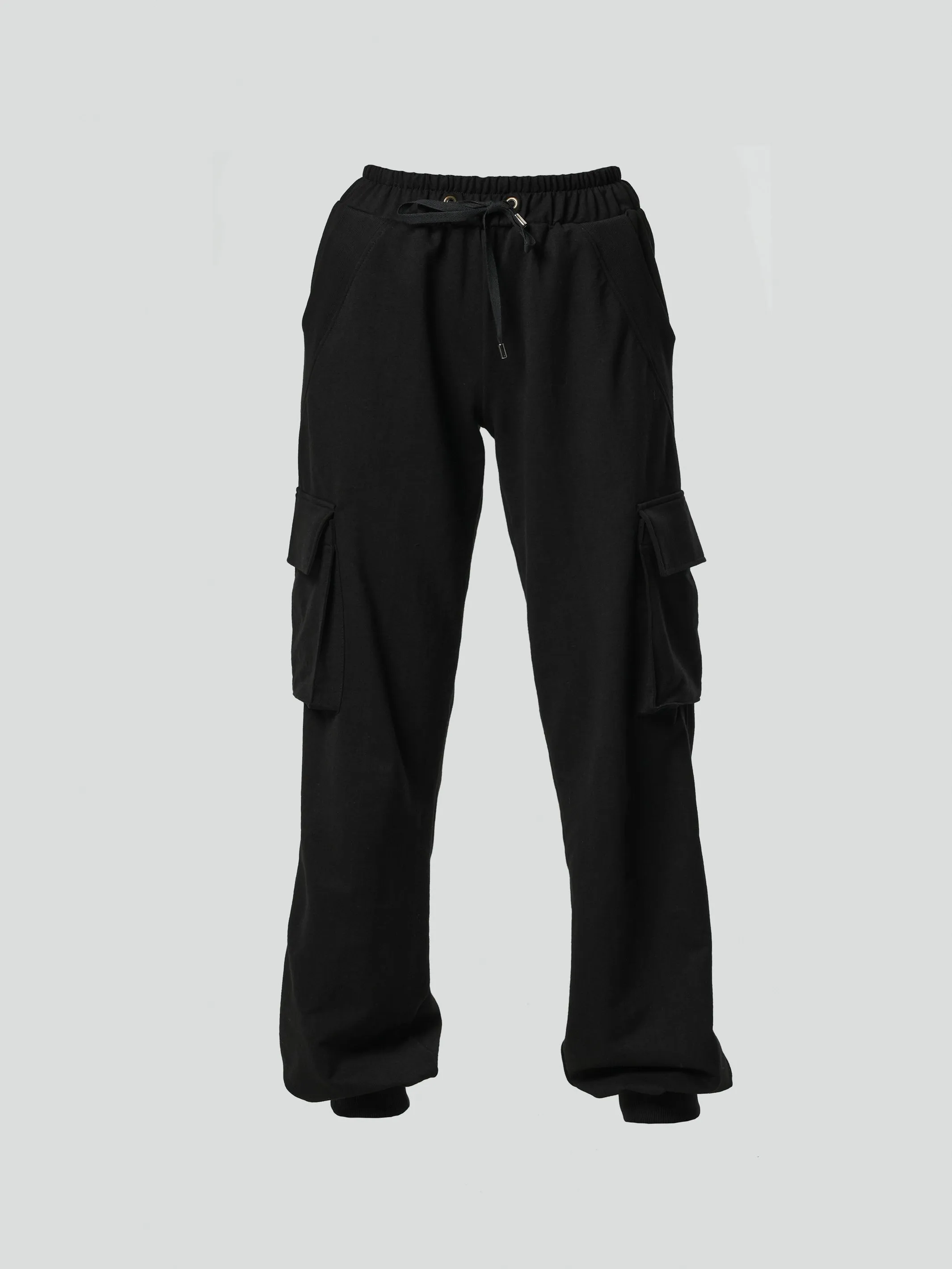 They have a total of 4 pockets - 2 on their sides and 2 at the front. There is a ribbed material detail on the cuffs and pockets. Their length is about 109 cm/ 42.9''.