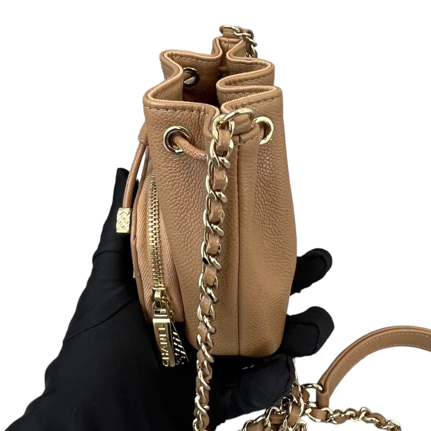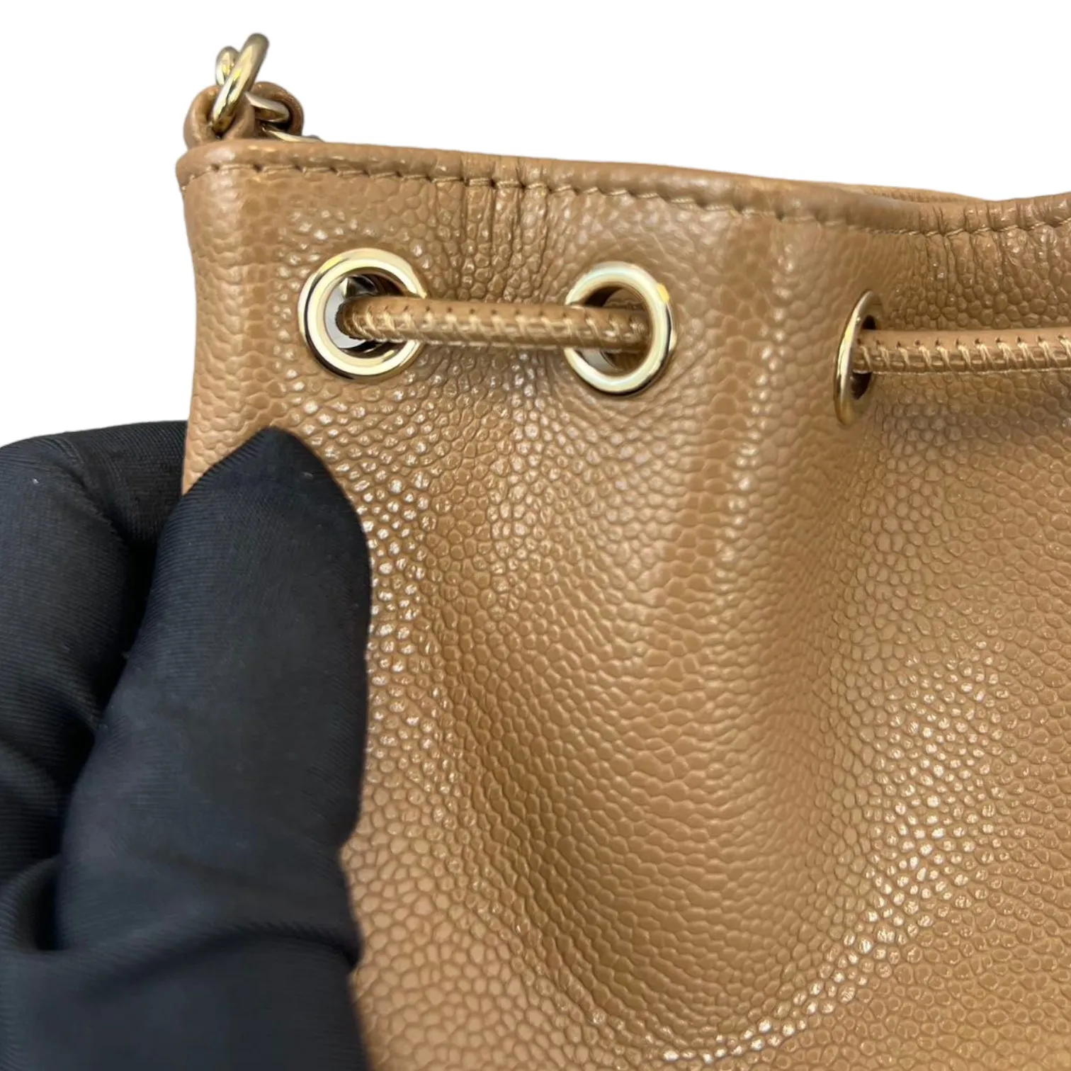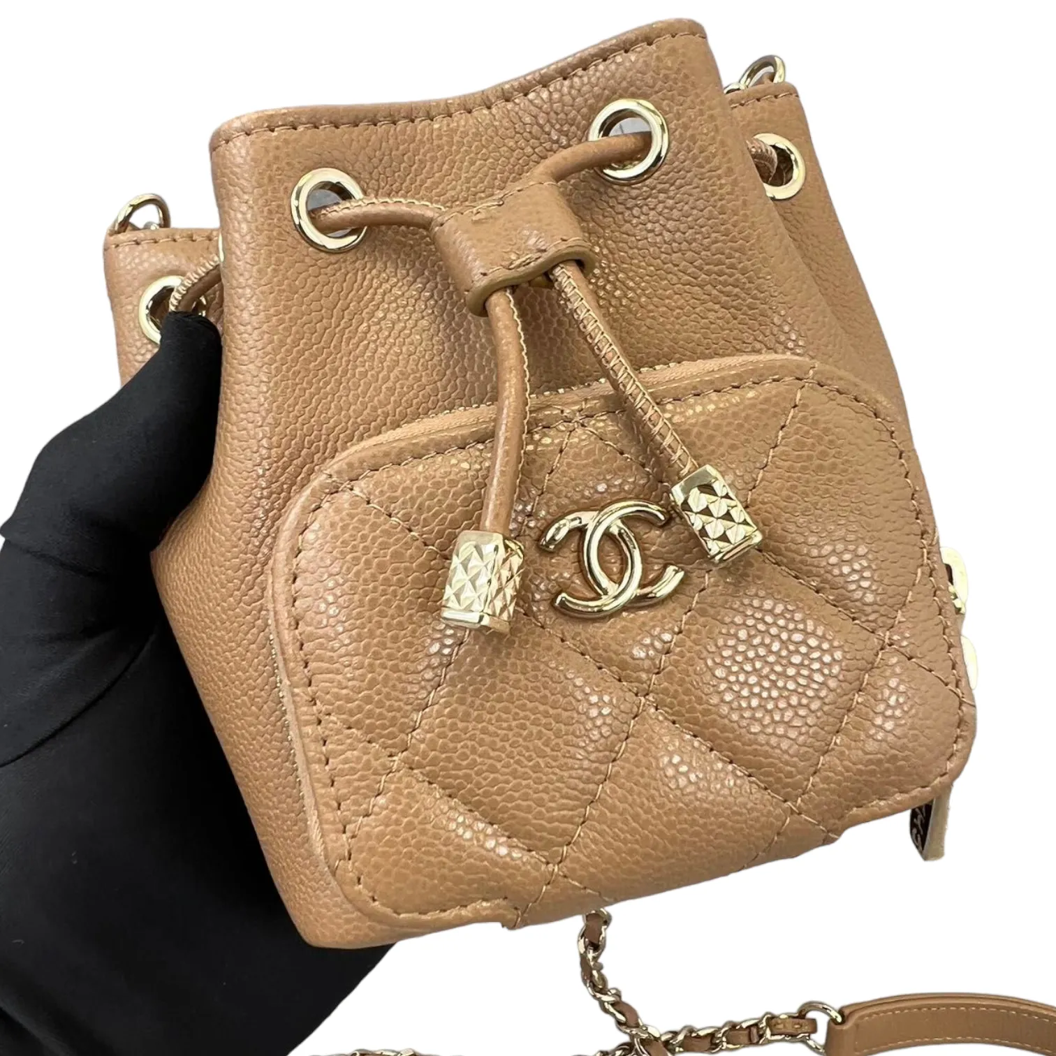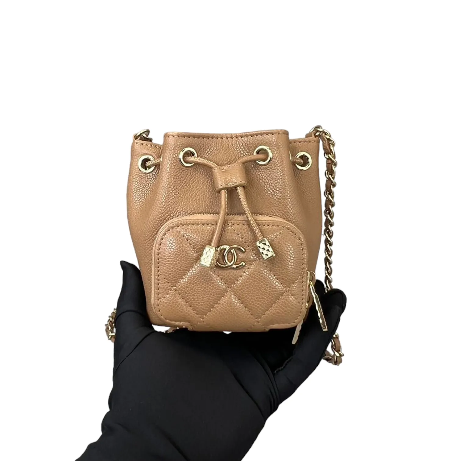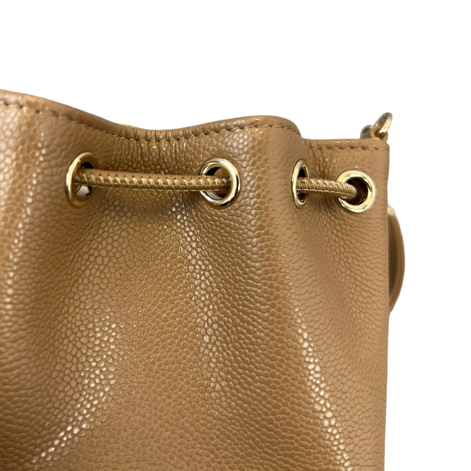 This is an authentic Chanel Caviar Mini Bucket Bag in Caramel Brown color adorned with Gold hardware. This cross body bag is crafted from caviar leather also comes with coin purse to boot. Its interior boasts a sumptuous caramel brown leather lining, and it's accompanied by a single long woven chain with a central strap.