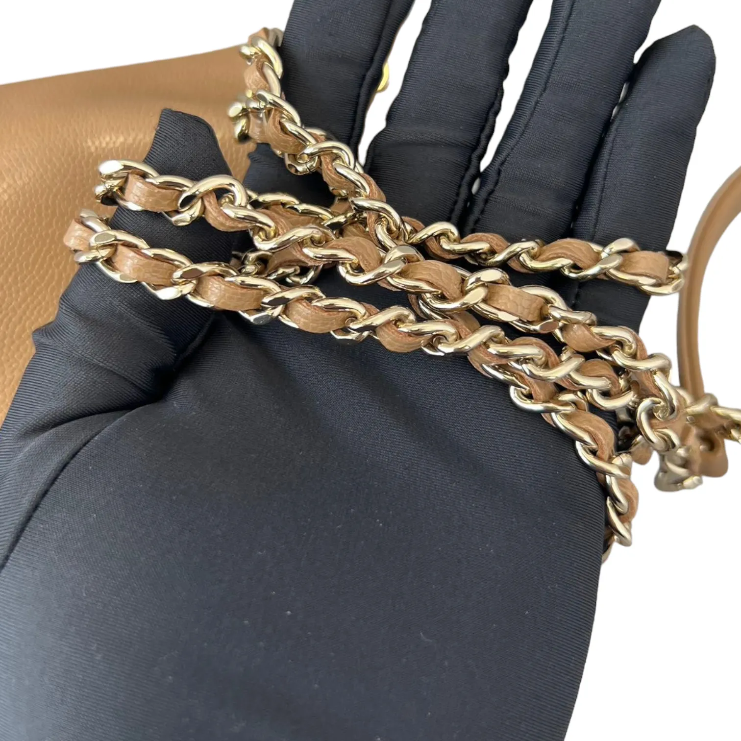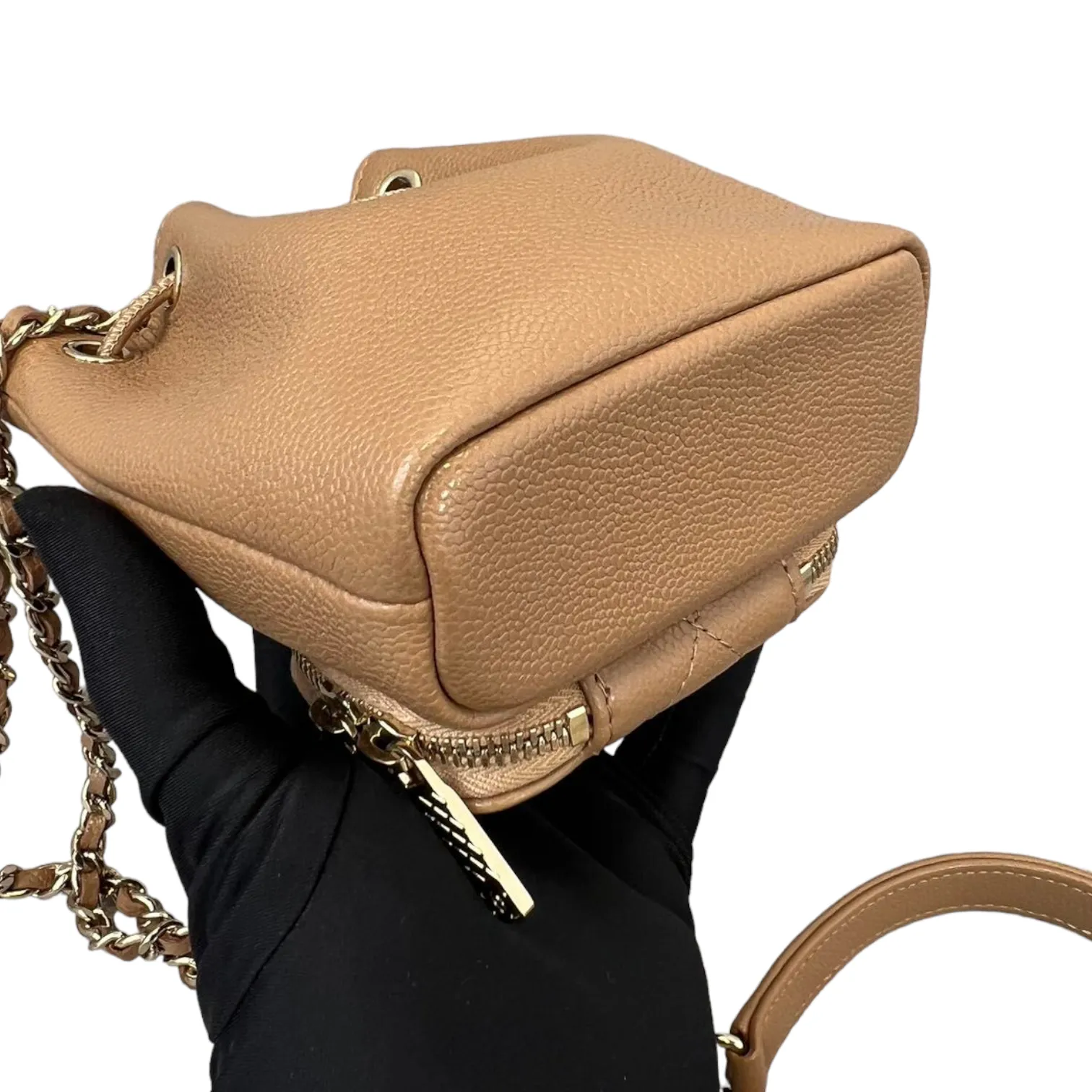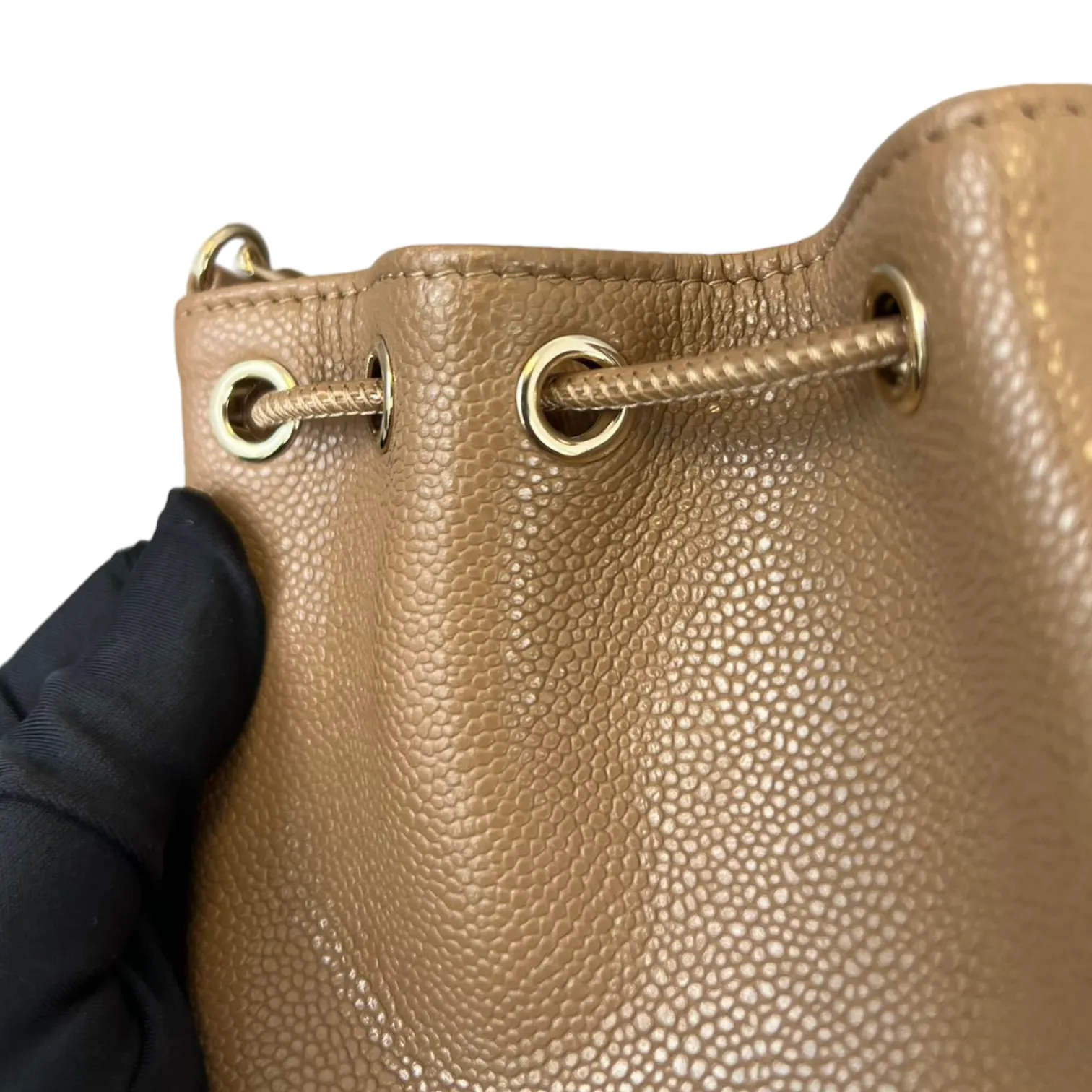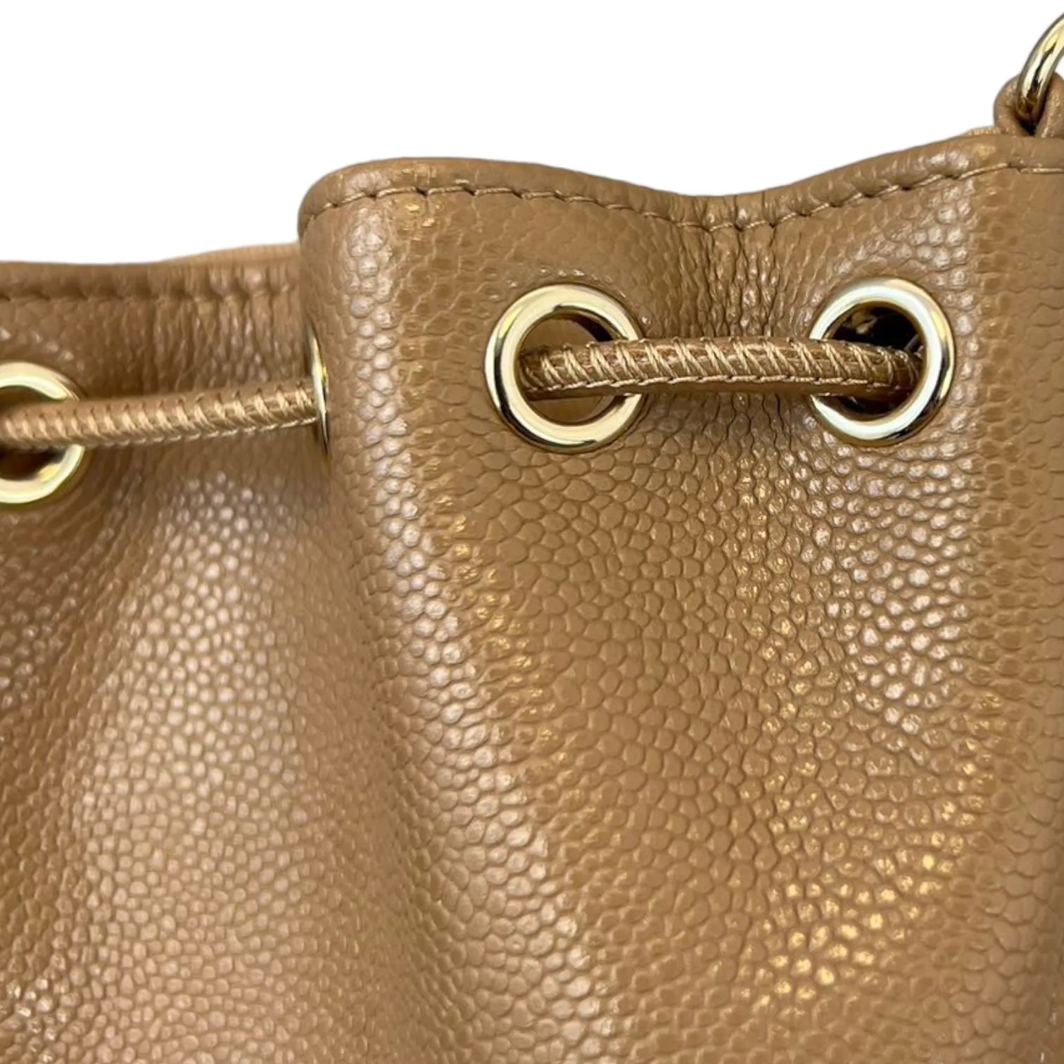 This is an authentic Chanel Caviar Mini Bucket Bag in Caramel Brown color adorned with Gold hardware. This cross body bag is crafted from caviar leather also comes with coin purse to boot. Its interior boasts a sumptuous caramel brown leather lining, and it's accompanied by a single long woven chain with a central strap.