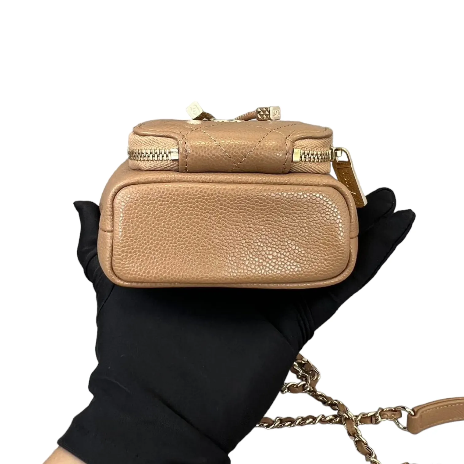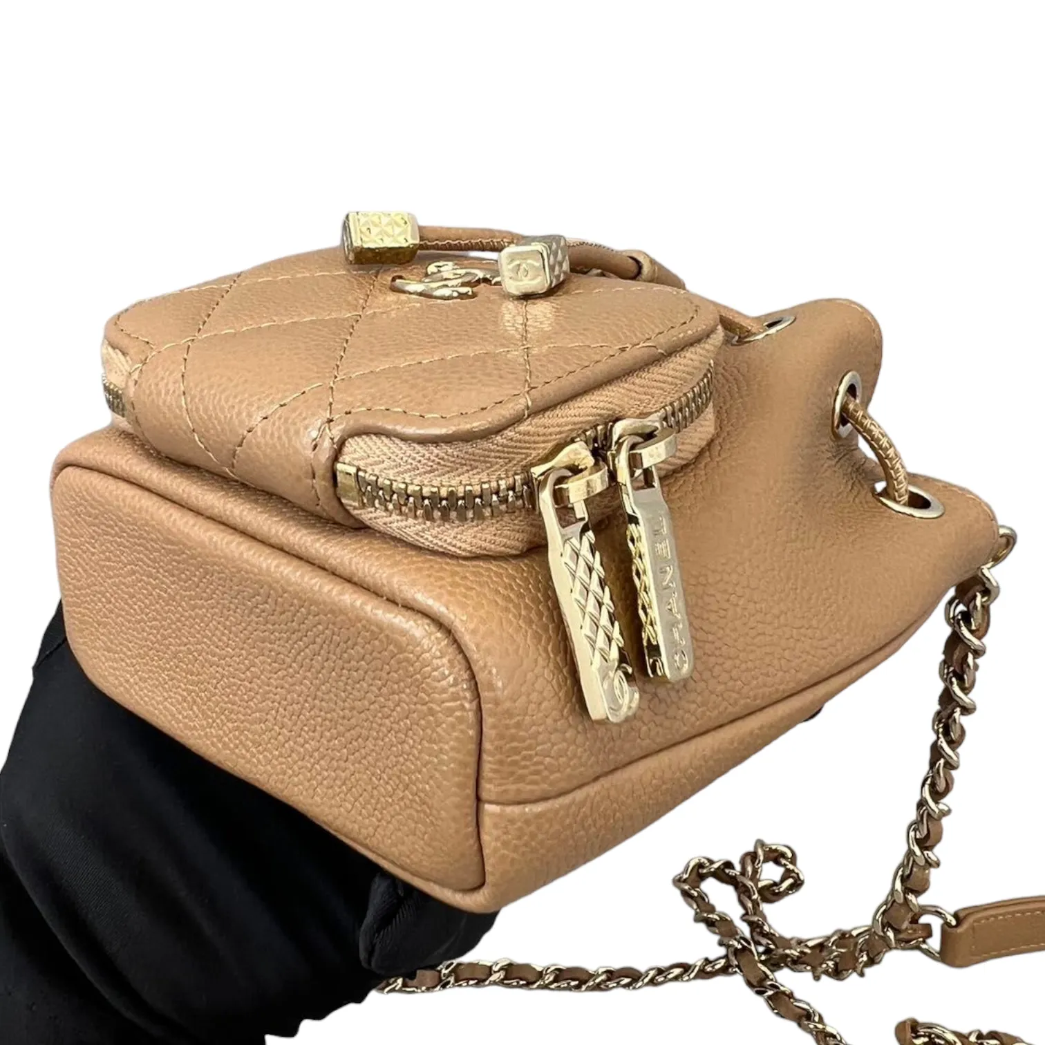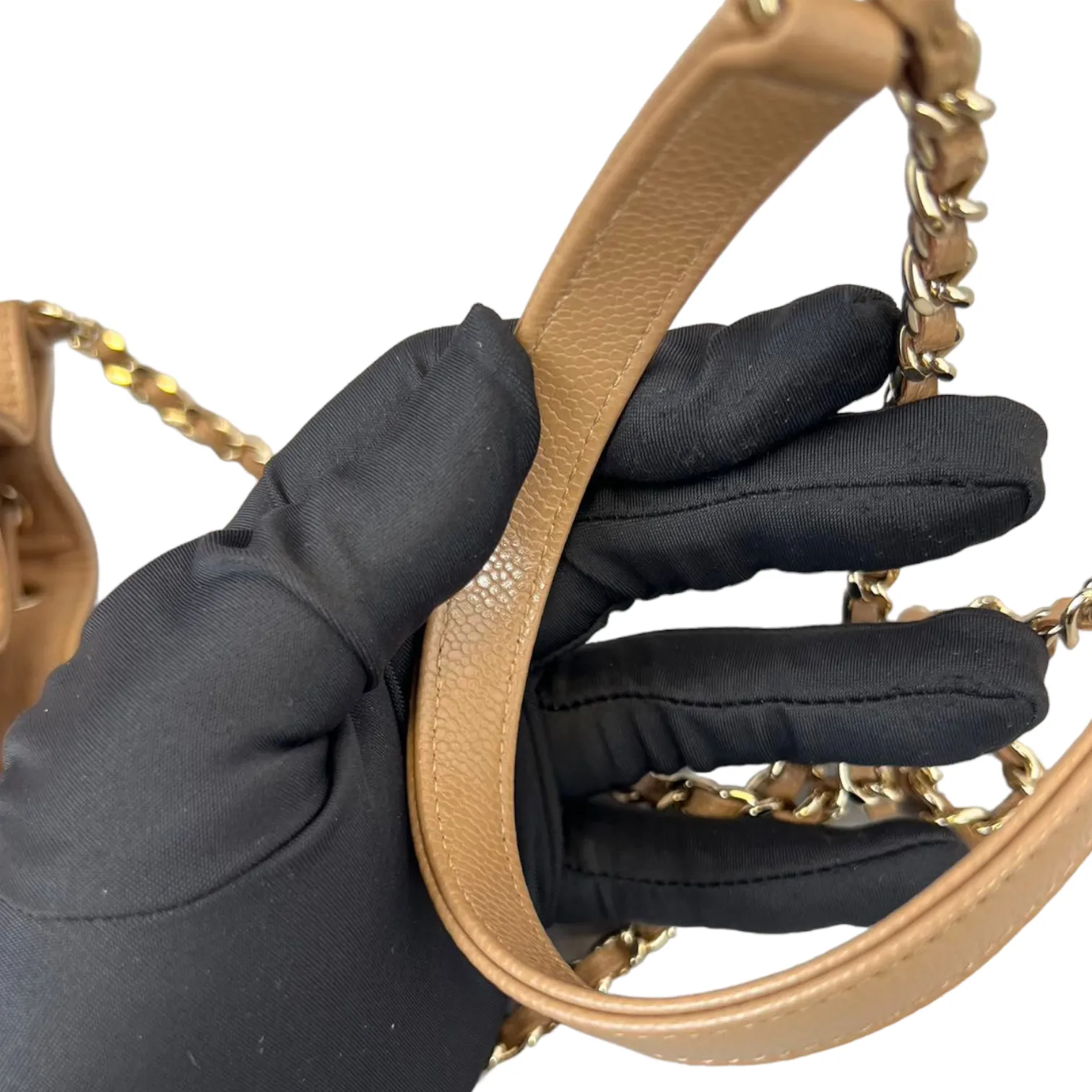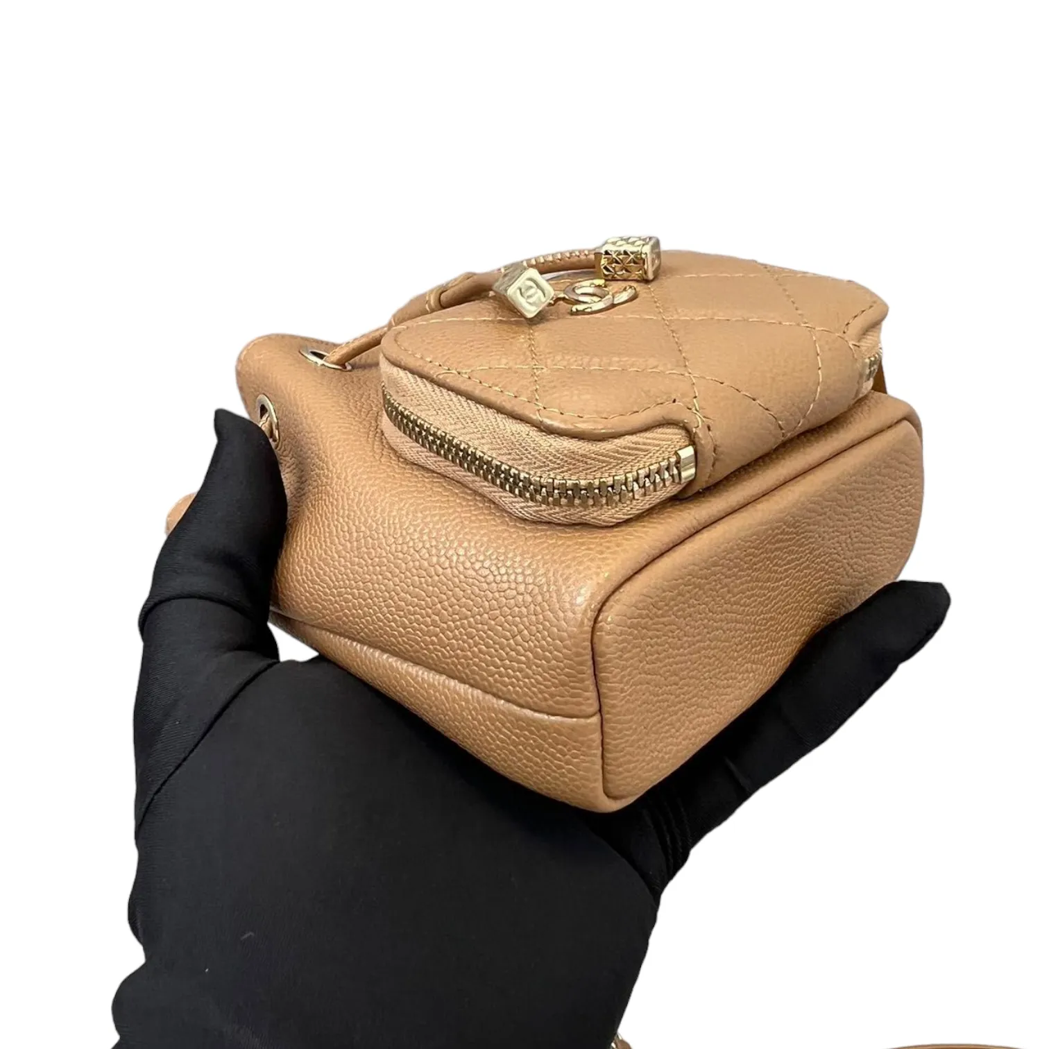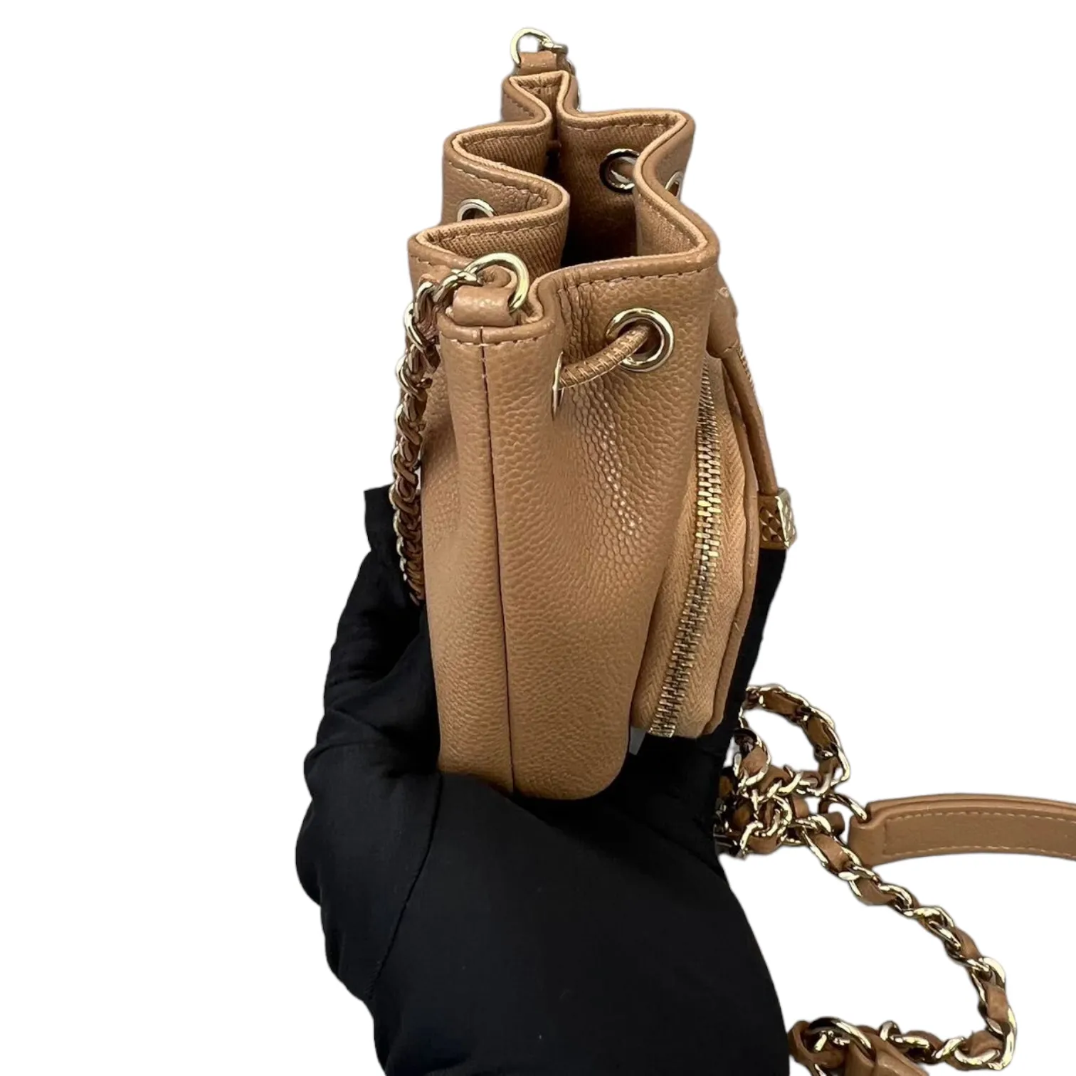 This is an authentic Chanel Caviar Mini Bucket Bag in Caramel Brown color adorned with Gold hardware. This cross body bag is crafted from caviar leather also comes with coin purse to boot. Its interior boasts a sumptuous caramel brown leather lining, and it's accompanied by a single long woven chain with a central strap.