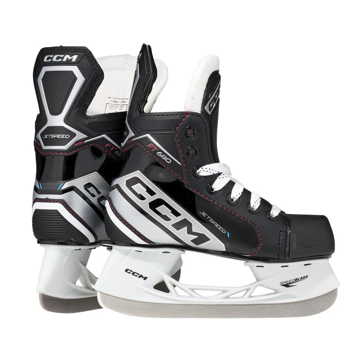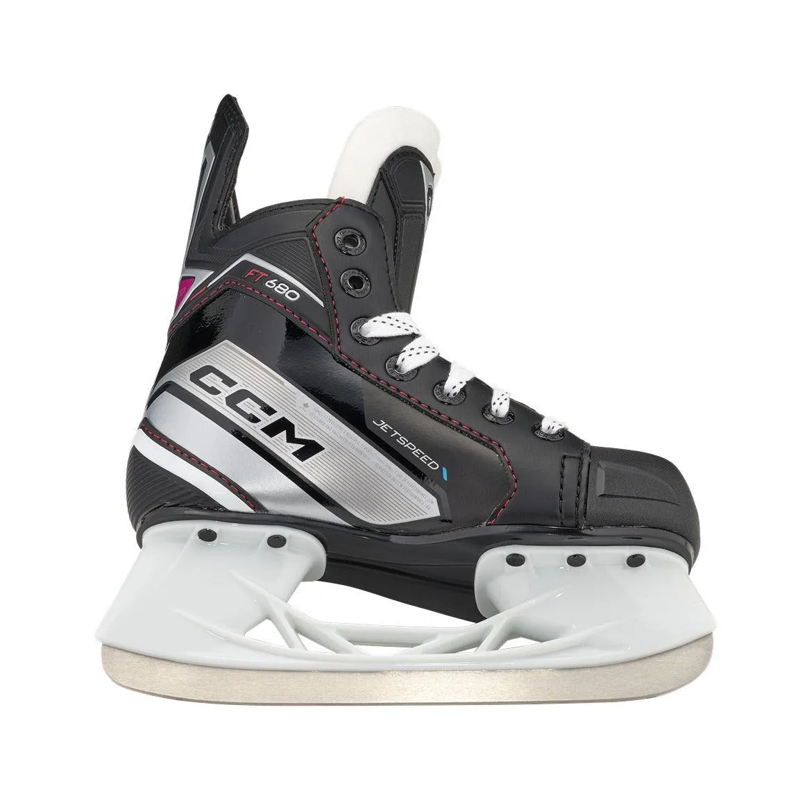 Let your young hockey star cruise around the ice like a pro with the CCM JETSPEED FT680 skates! These skates feature an injected core and durable boot for essential protection and comfort--plus, their customizable decals let them rep their own style. A built-in asymmetrical tongue features embossed lace-bite protection for pro-level cushioning, so they can focus on chasing their dreams of NHL greatness!