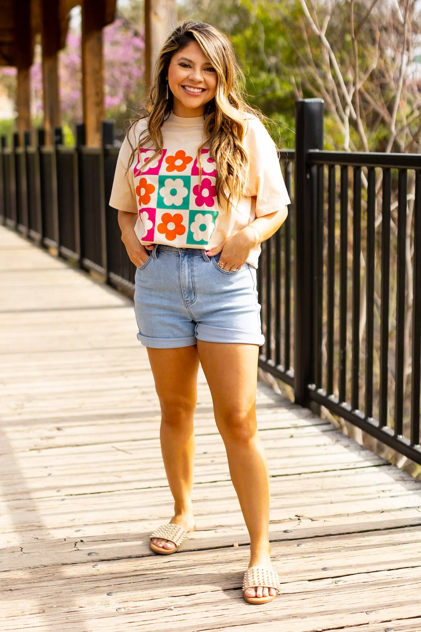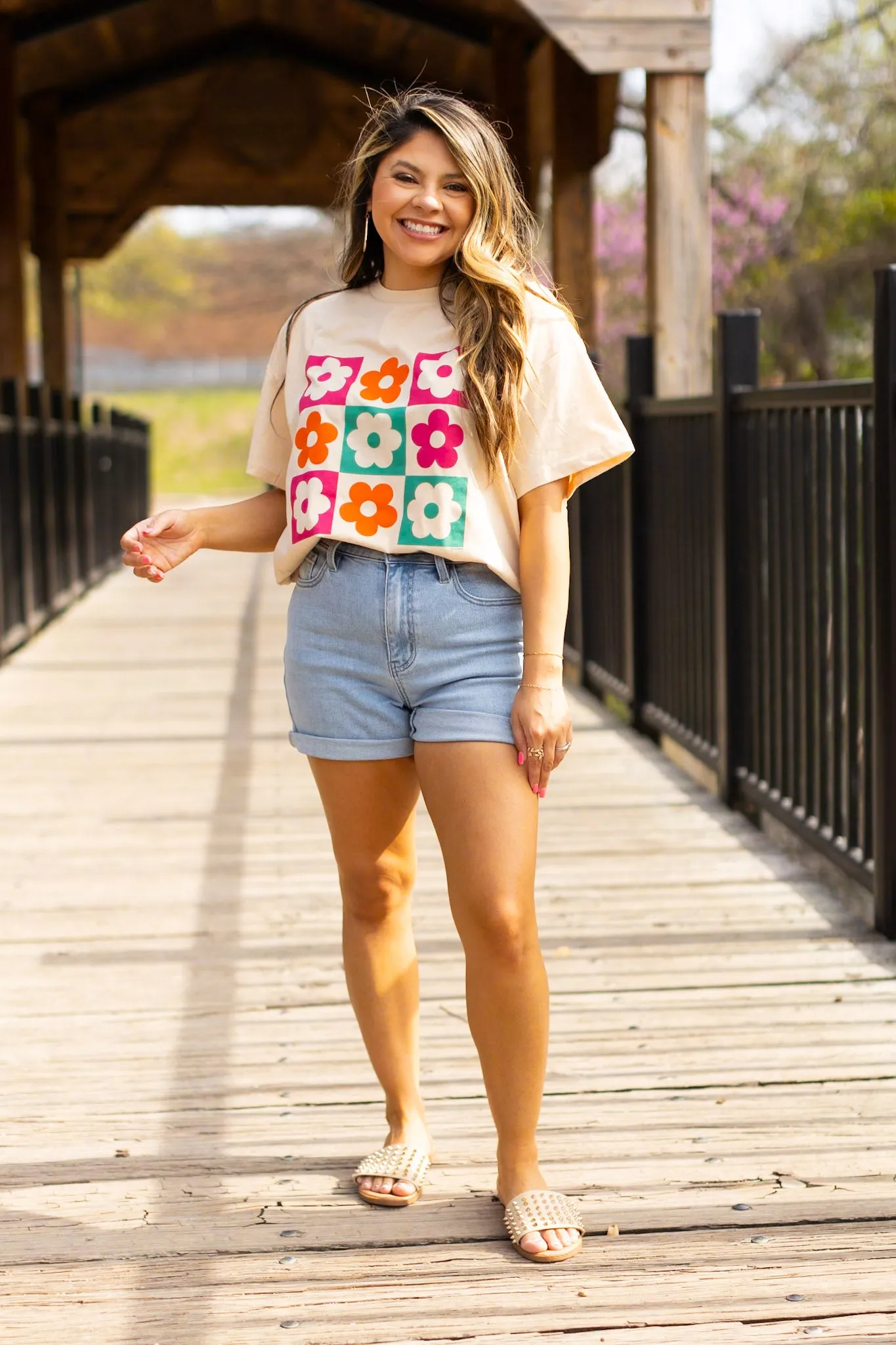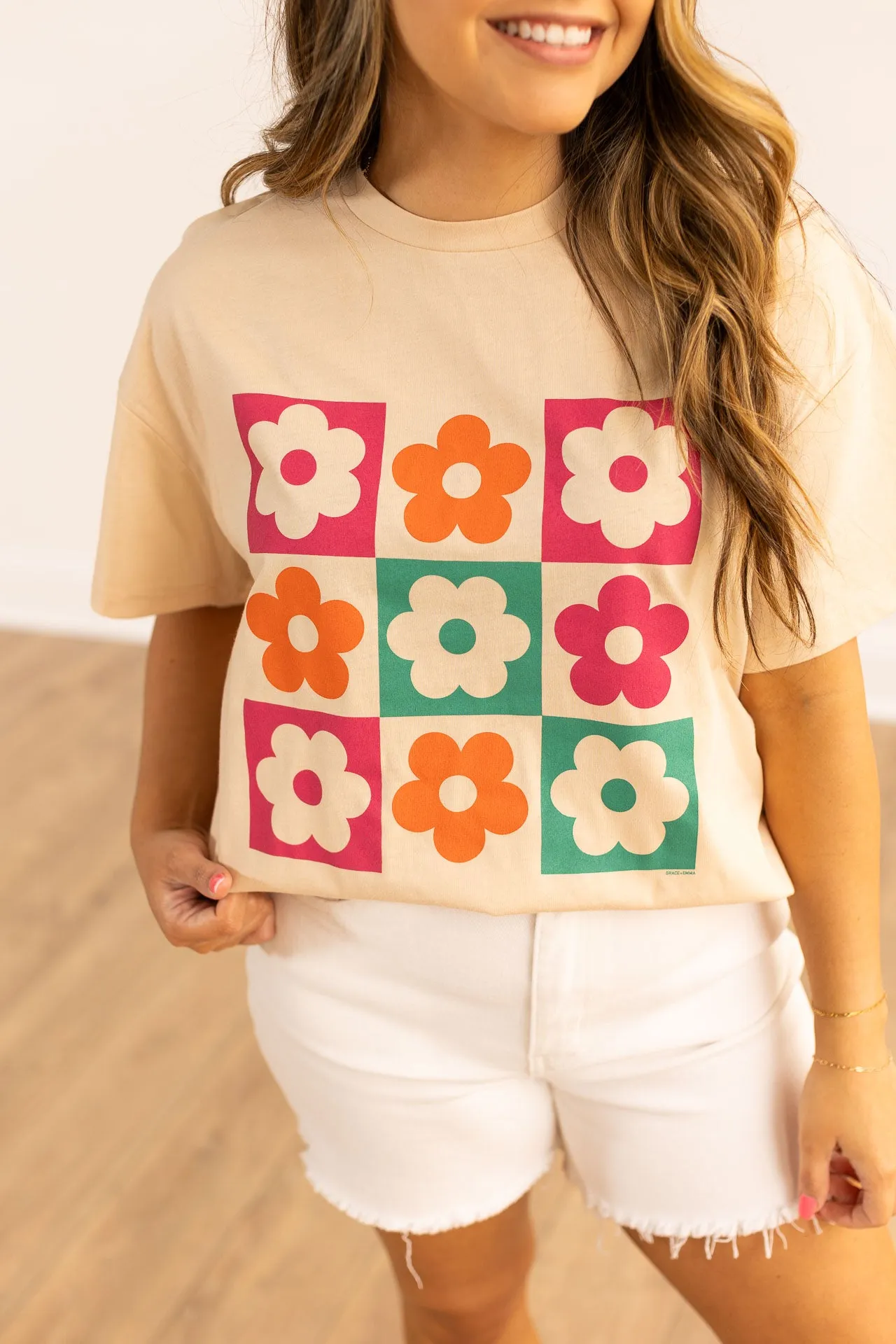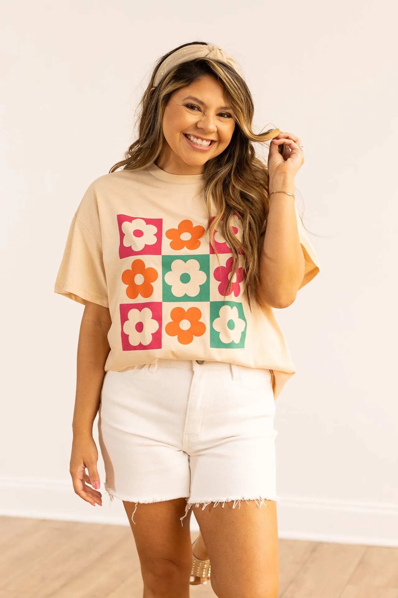 The Checkered Floral Oversized Tee in Beige is the epitome of trendy comfort. This graphic tee effortlessly combines style and relaxation, exuding a confident and laid-back vibe.