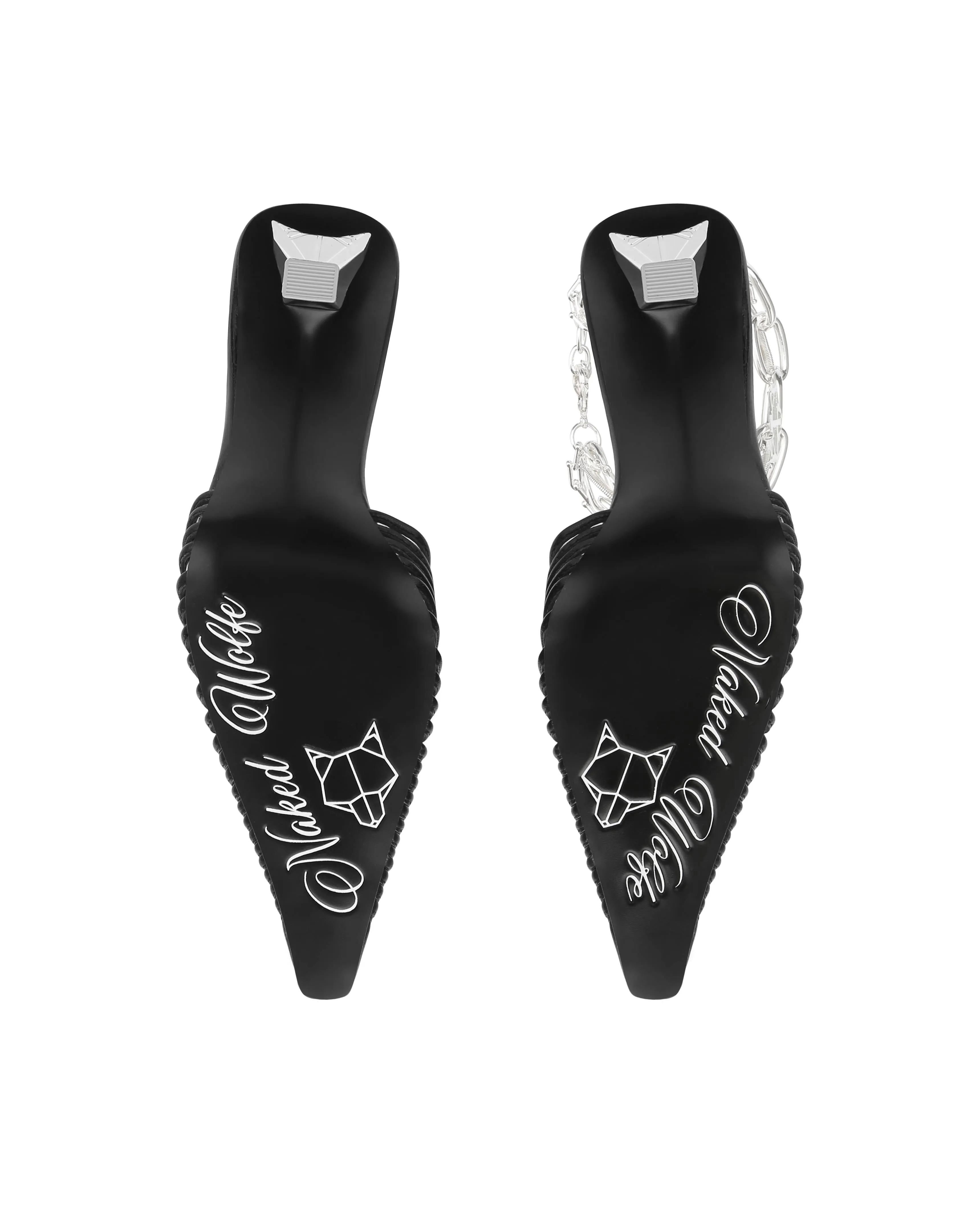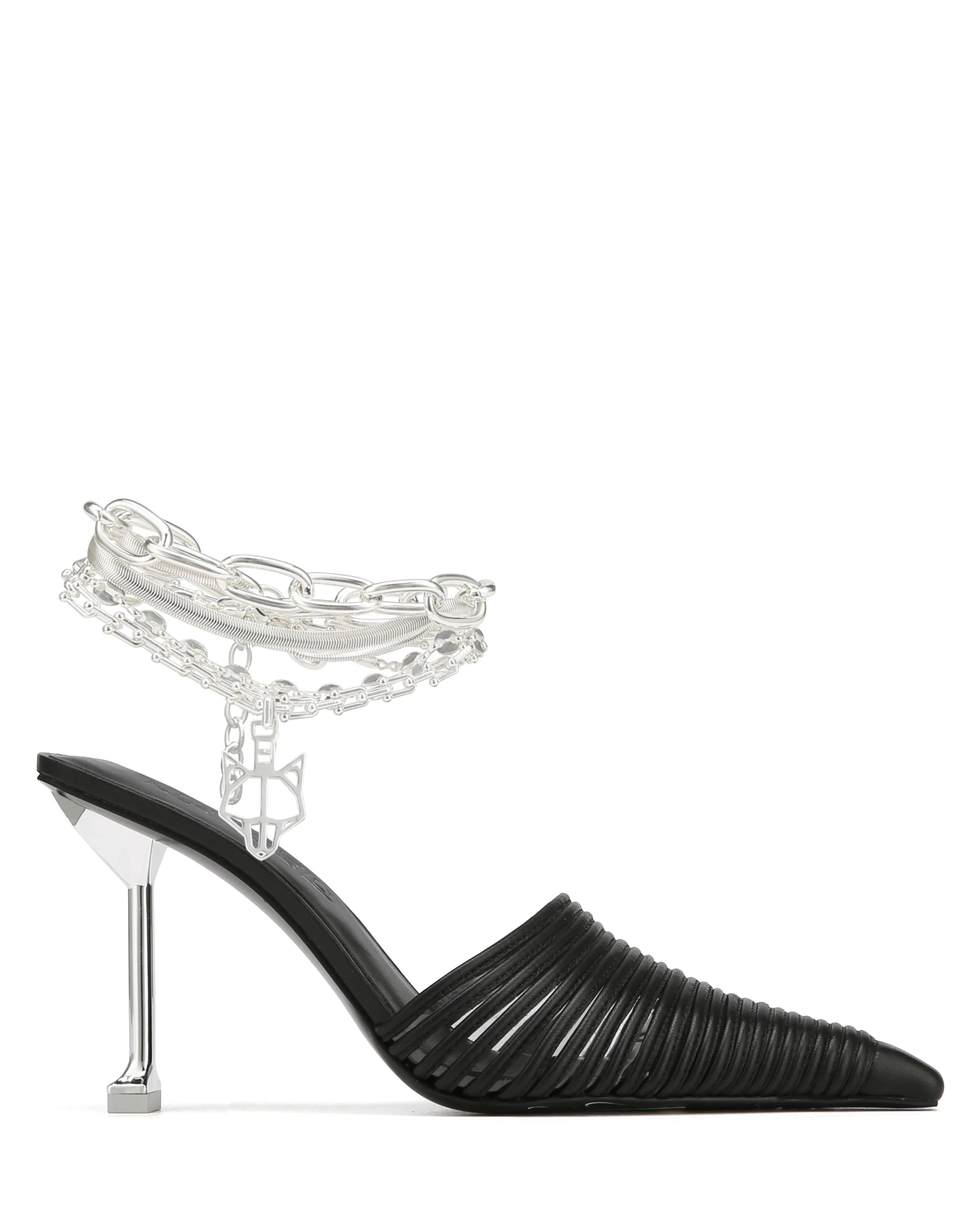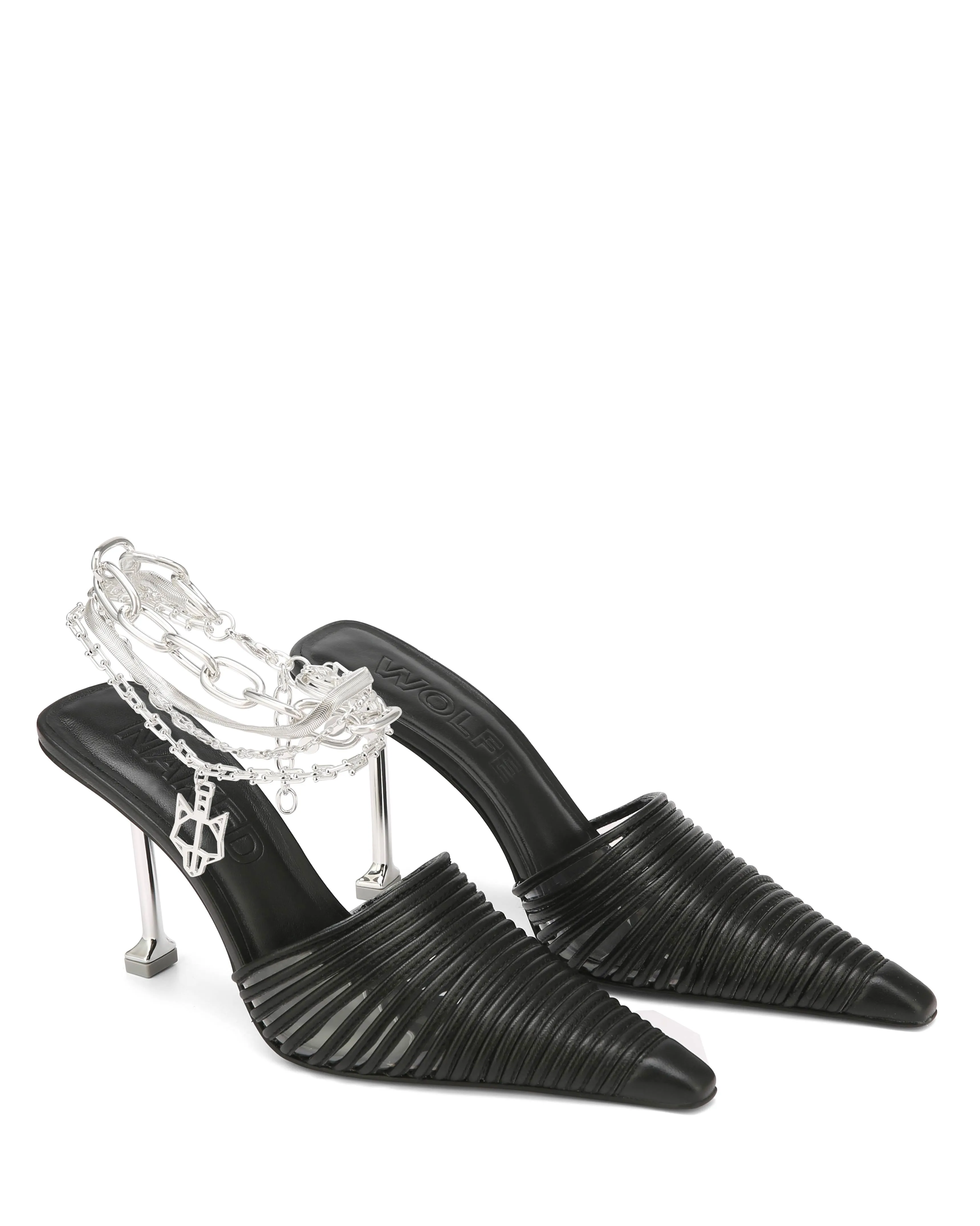 Chromed, a striking pointed-toe heel. Standing tall with a 9cm custom-made heel featuring a unique Wolfe head design at the back, this heel is a true statement piece. The sexy tubed leather vamp and custom made anklet design adds a touch of contemporary flair with elegance. Crafted from luxurious sheep leathers, the Chromed heel seamlessly blends high fashion with exquisite craftsmanship, making it a standout addition to any stylish wardrobe. This style is our first ever design to be paired with an anklet custom designed made from high quality sterling silver plated brass, which you can take away and wear with endless outfits.