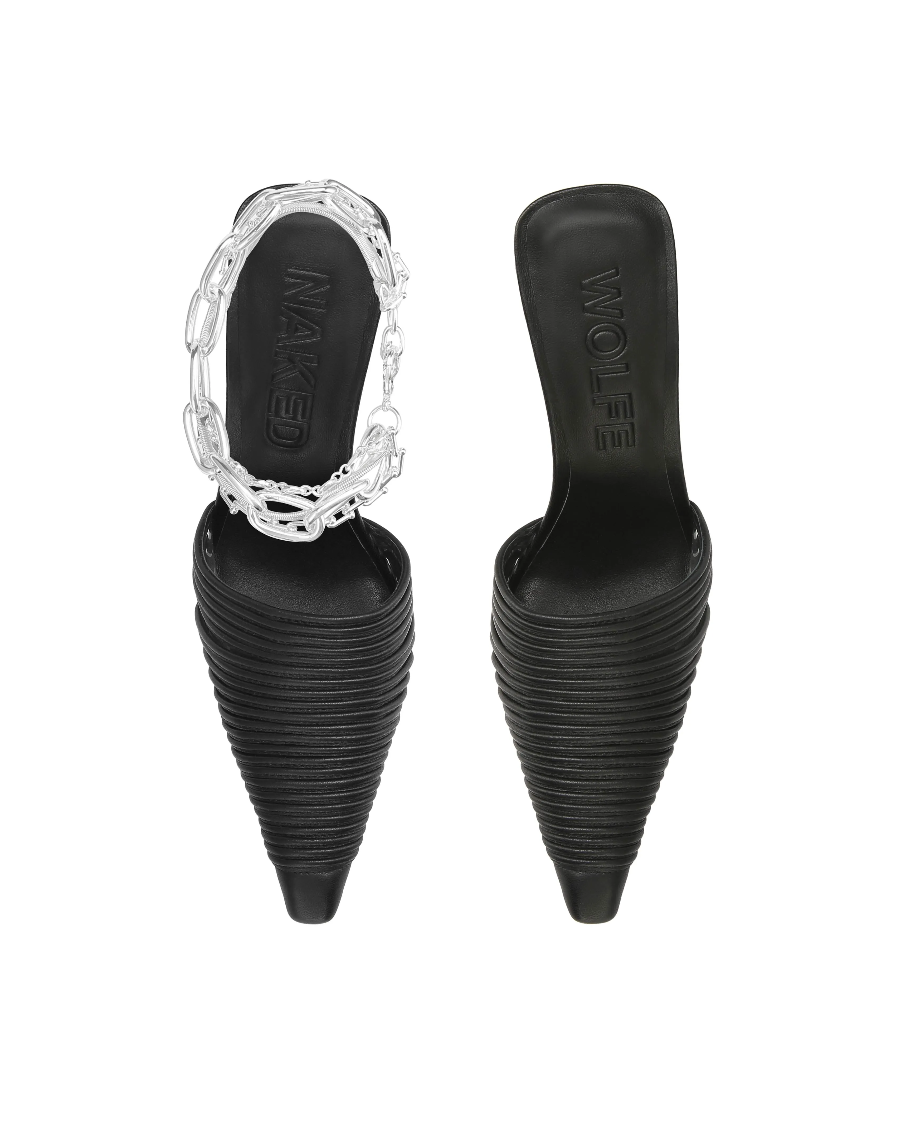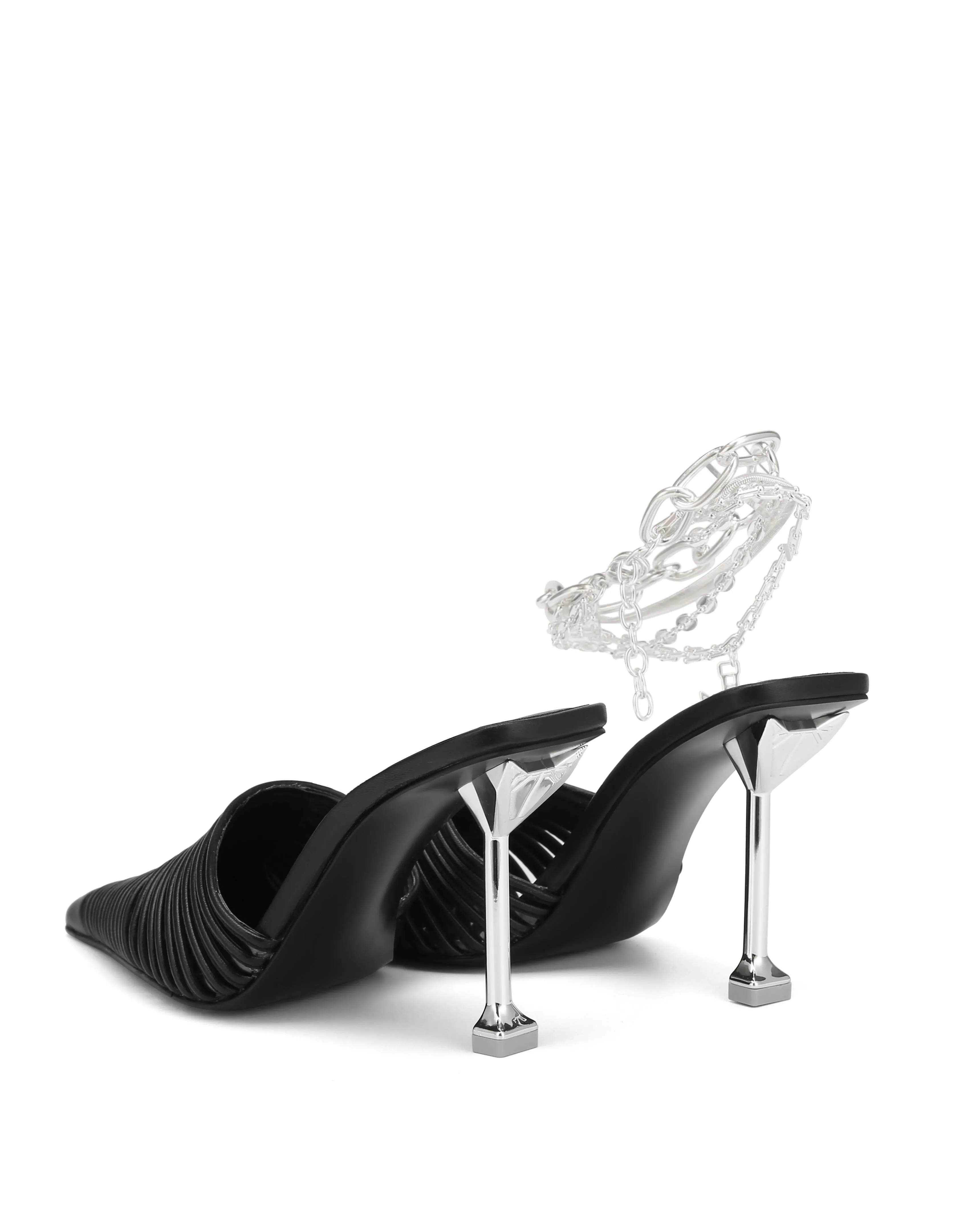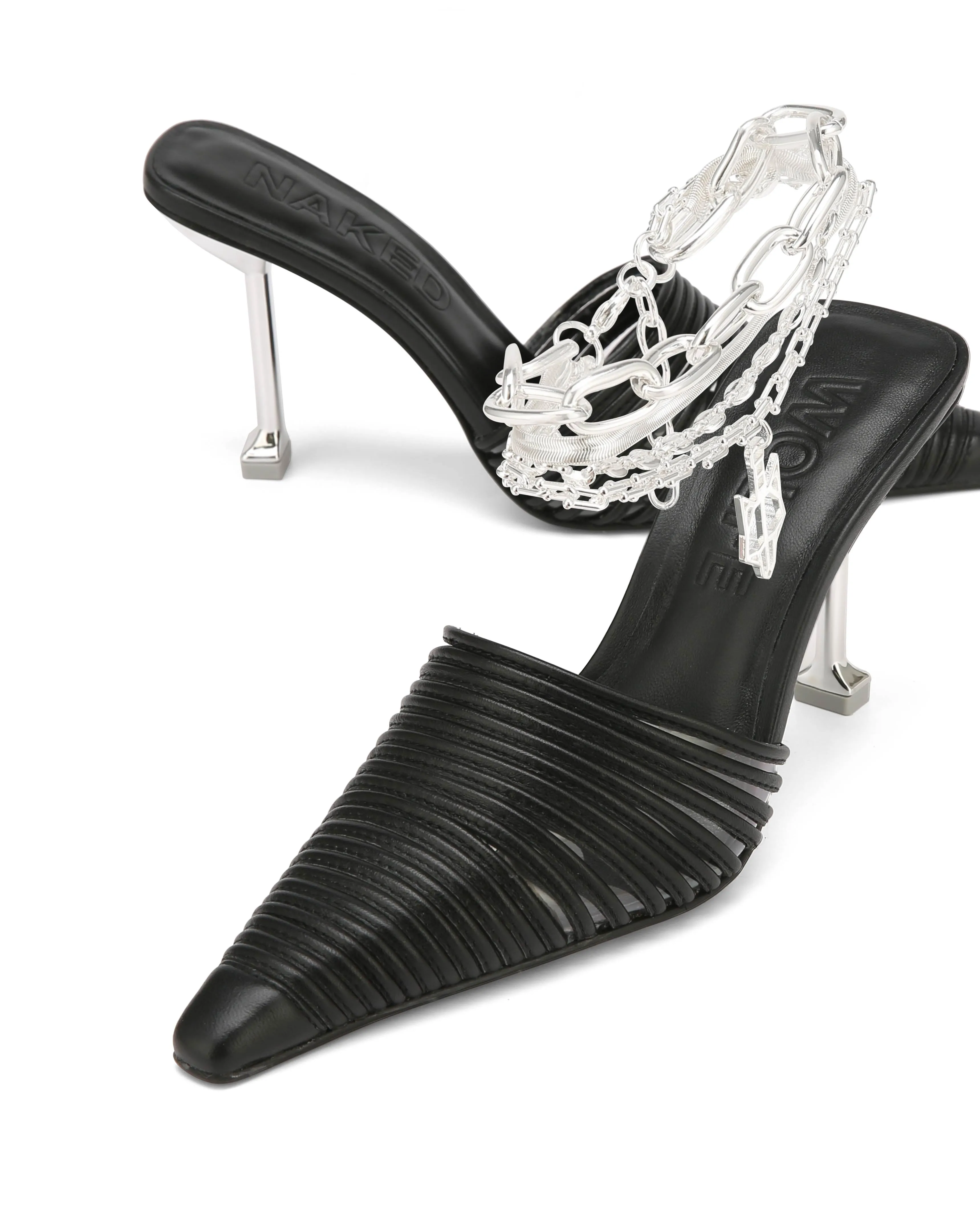 Chromed, a striking pointed-toe heel. Standing tall with a 9cm custom-made heel featuring a unique Wolfe head design at the back, this heel is a true statement piece. The sexy tubed leather vamp and custom made anklet design adds a touch of contemporary flair with elegance. Crafted from luxurious sheep leathers, the Chromed heel seamlessly blends high fashion with exquisite craftsmanship, making it a standout addition to any stylish wardrobe. This style is our first ever design to be paired with an anklet custom designed made from high quality sterling silver plated brass, which you can take away and wear with endless outfits.