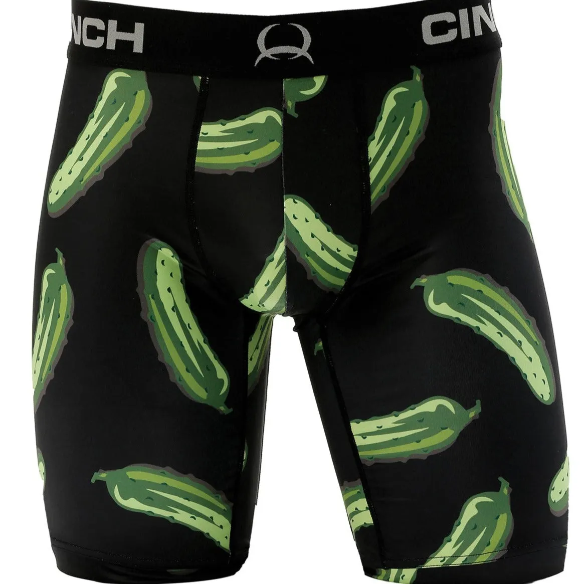 When you're in a pickle, and even when you're not, reach for the pickle-themed black poly-spandex boxer brief for an easy pick-me-up. This novel brief features an extended 9" fit with contrast topstitch, no-ride leg seams, tag-free design, jacquard waistband with logo, antimicrobial treatment, and four-way stretch moisture wicking fabric.