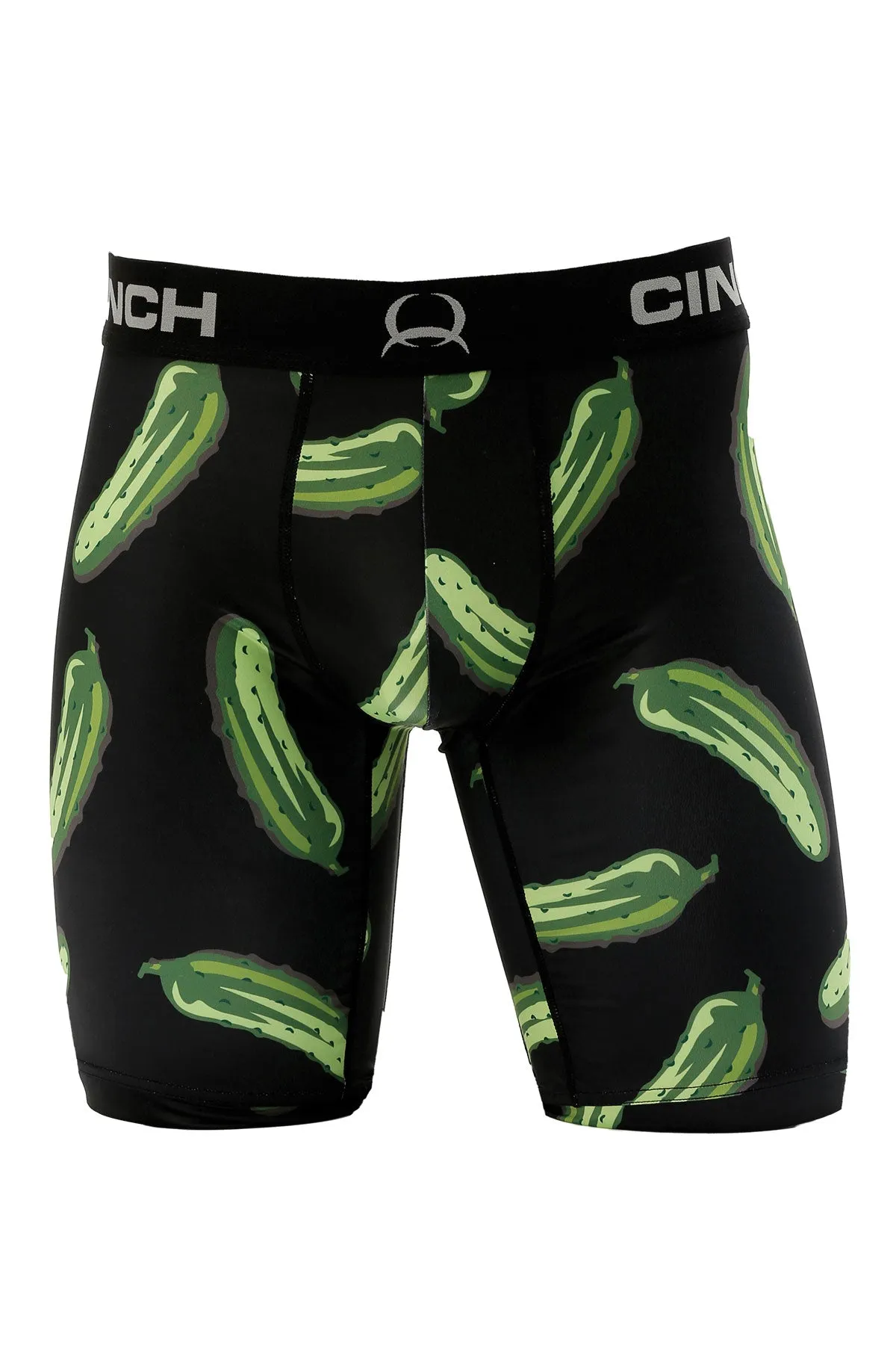 When you're in a pickle, and even when you're not, reach for the pickle-themed black poly-spandex boxer brief for an easy pick-me-up. This novel brief features an extended 9" fit with contrast topstitch, no-ride leg seams, tag-free design, jacquard waistband with logo, antimicrobial treatment, and four-way stretch moisture wicking fabric.