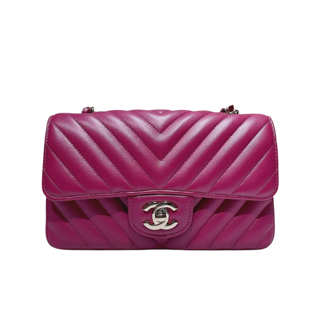 This stunning Chanel Classic Mini Rectangle Flap in Purple Chevron Quilted Lambskin leather with gold hardware is a must-have for any Chanel collector.