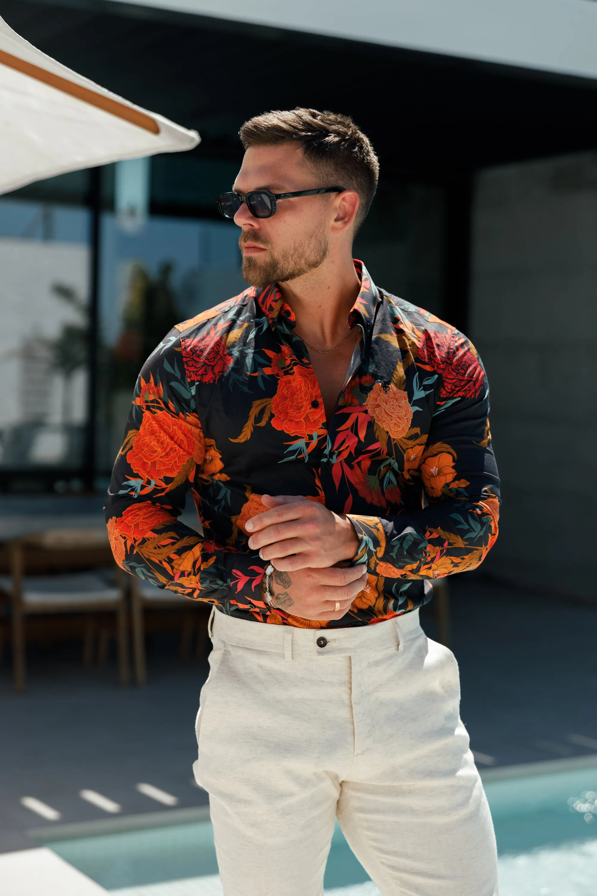 Father Sons Classic Stretch LS Black / Orange Oriental Print Button Down Collar - FS1102