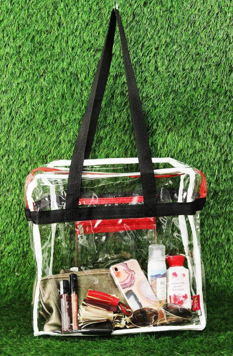 Trimmed in your favorite team's color red, this clear stadium tote is a must-have for game day or concert! Also good for school, work, or anywhere a clear bag is required.