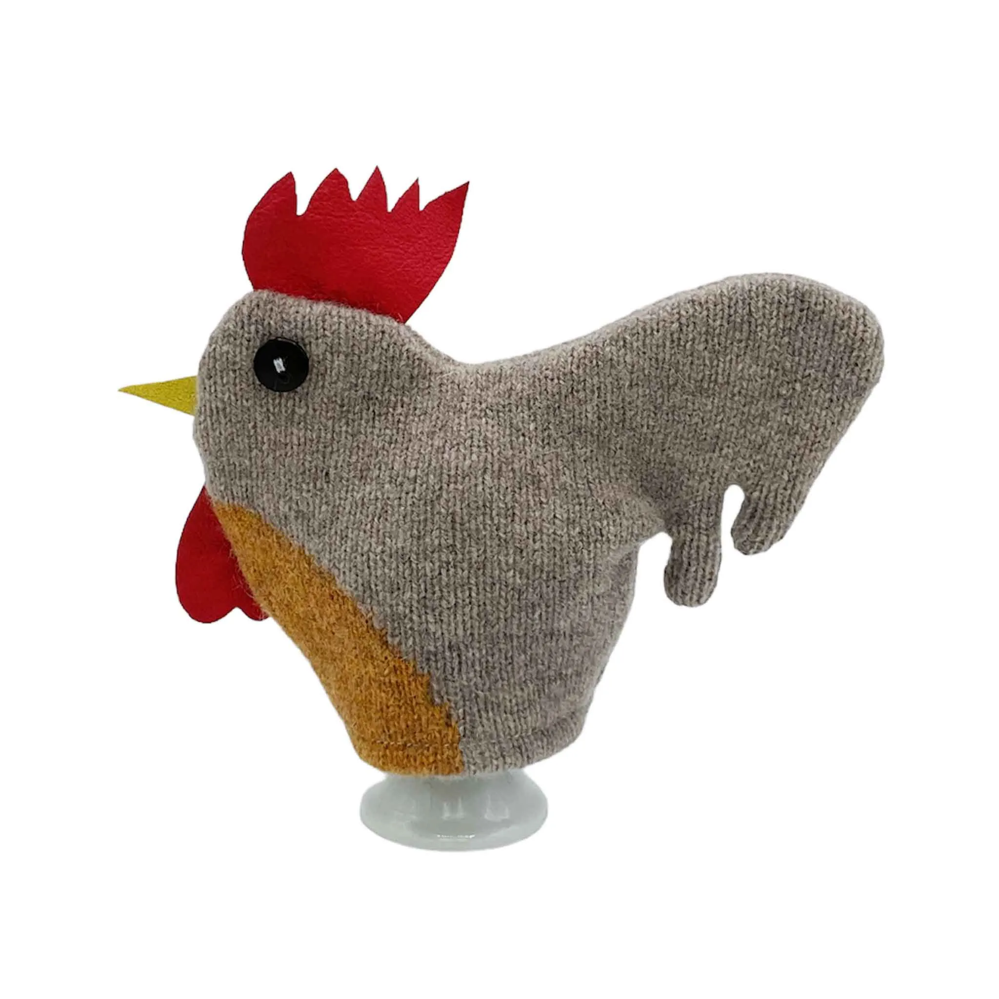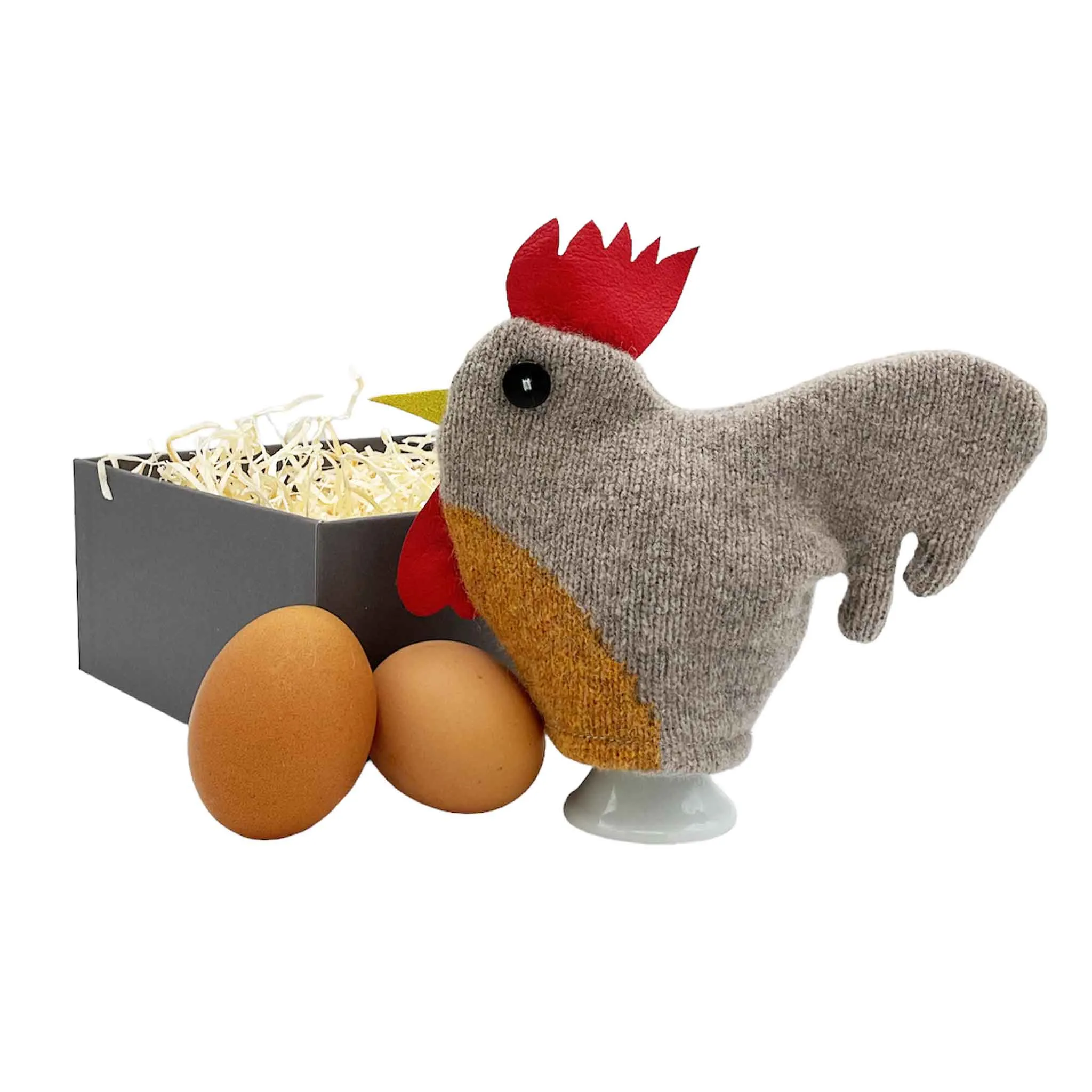 Rise and shine with this knitted rooster egg, cosy set. It features a leather beak and comb, and hand-sewn eyes. Each cockerel is lovingly hand-made from soft, felted, 100% lambswool and will keep your eggs warm and delicious until it's time to eat. This characterful, knitted cosy brings the farm to the table and brightens breakfast time. Presented in a cute nest box with a white ceramic egg cup.