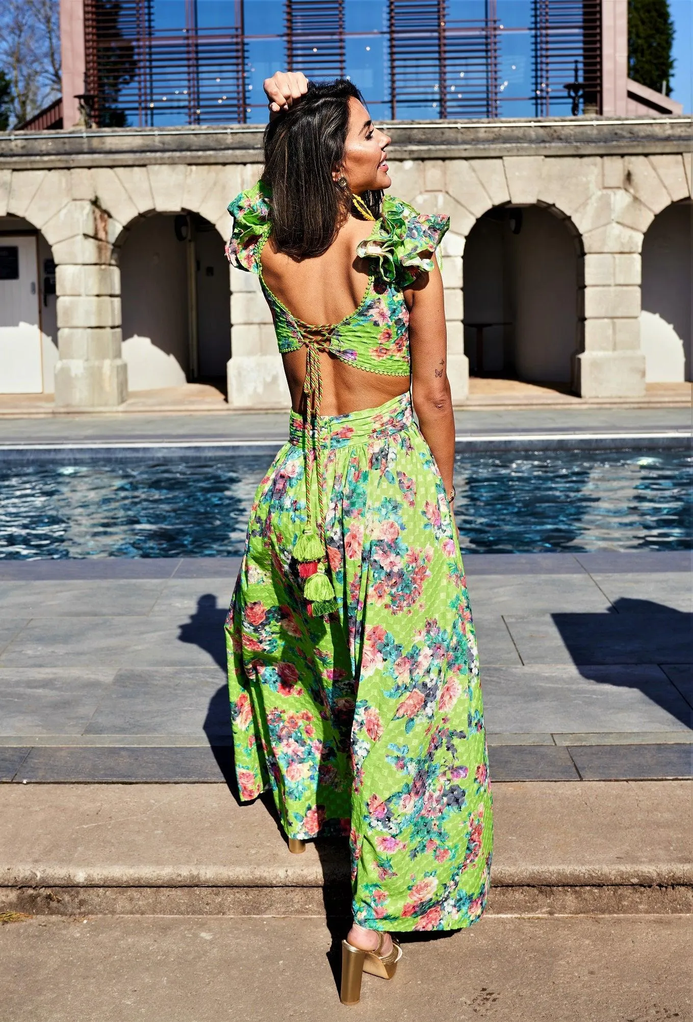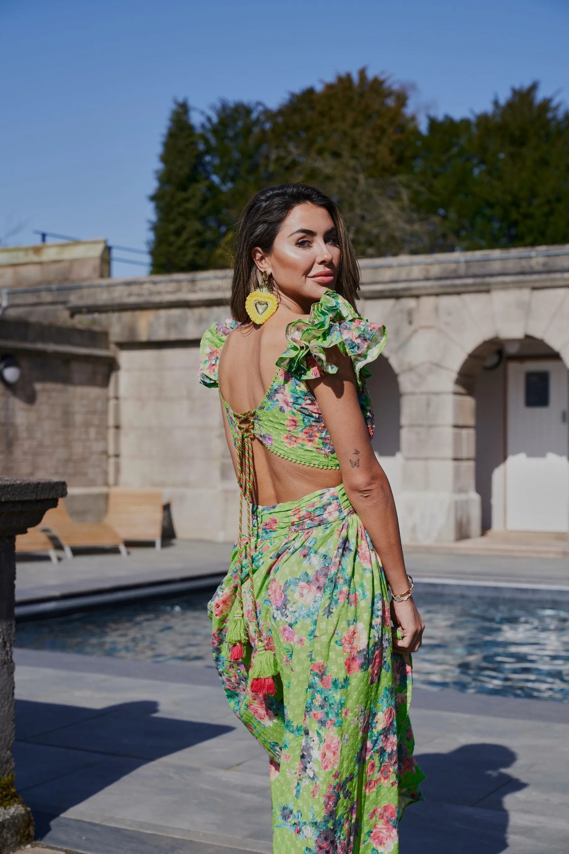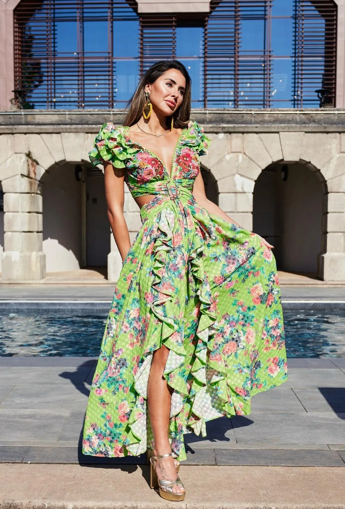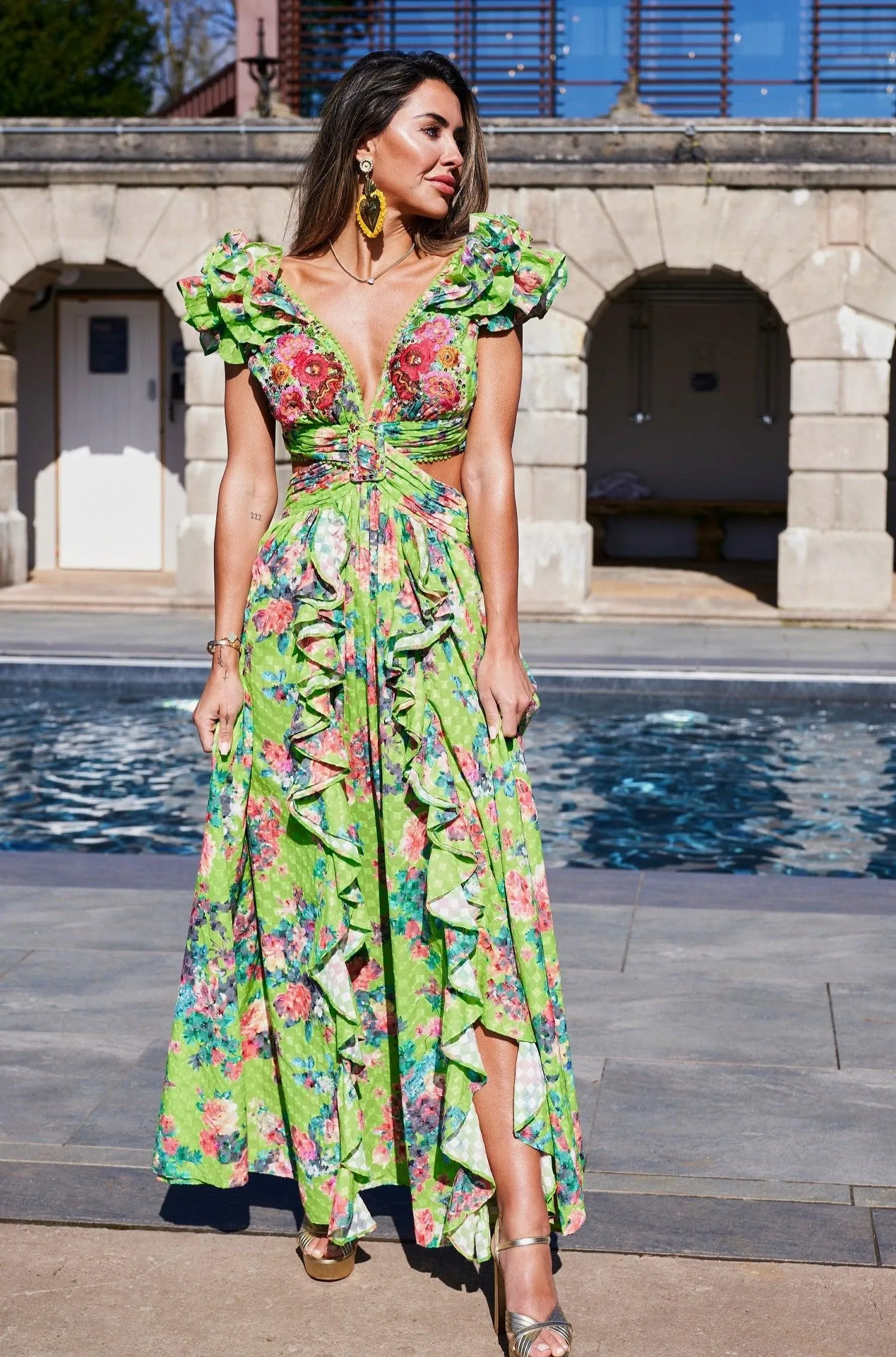 Statement maxi cut out dress featuring tiered skirt, front slit and embellished bust.