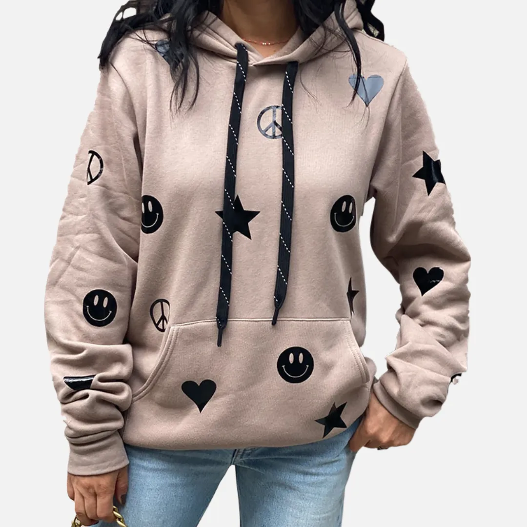 Our Dean Tan Hoodie Sweatshirt with Black Smiley & Peace Prints is crafted from soft-brushed fleece fabric with a kangaroo pocket and ribbing at the cuffs and waistband. Pair it with biker shorts for a timeless and polished day off set.